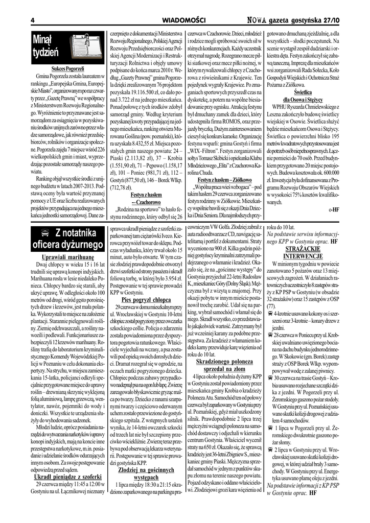 4 WIADOMOCI Min¹³ tydzieñ 4 4 Sukces Pogorzeli Gmina Pogorzela zosta³a laureatem w rankingu Europejska Gmina, Europejskie Miasto, organizowanym po raz czwarty przez Gazetê Prawn¹ we wspó³pracy z Ministerstwem Rozwoju Regionalnego. Wyró¿nienie to przyznawane jest samorz¹dom za osi¹gniêcia w pozyskiwaniu rodków unijnych zarówno przez w³adze samorz¹dowe, jak równie¿ przedsiêbiorców, rolników i organizacje spo³eczne. Pogorzela zajê³a 7 miejsce wród 226 wielkopolskich gmin i miast, wyprzedzaj¹c pozosta³e samorz¹dy naszego powiatu. Ranking obj¹³ wszystkie rodki z unijnego bud¿etu w latach 2007-2013. Podstaw¹ oceny by³a wartoæ przyznanej pomocy z UE oraz liczba realizowanych projektów przypadaj¹ca na jednego mieszkañca jednostki samorz¹dowej. Dane za- p Z notatnika oficera dy¿urnego Uprawiali marihuanê Dwaj ch³opcy w wieku 15 i 16 lat trudnili siê upraw¹ konopi indyjskich. Marihuana ros³a w lesie niedaleko Ponieca. Ch³opcy bardzo siê starali, aby ukryæ uprawê. W odleg³oci oko³o 100 metrów od drogi, wród gêsto poroniêtych drzew i krzewów, jest ma³a polanka. Wykorzystali to miejsce na za³o¿enie plantacji. Starannie pielêgnowali roliny. Ziemiê odchwaszczali, a roliny nawozili i podlewali. Funkcjonariusze zabezpieczyli 12 krzewów marihuany. Roliny trafi¹ do laboratorium kryminalistycznego Komendy Wojewódzkiej Policji w Poznaniu w celu dokonania ekspertyzy. Na strychu, w miejscu zamieszkania 15-latka, policjanci odkryli specjalnie przygotowane miejsce do uprawy rolin drewnian¹ skrzyniê wyklejon¹ foli¹ aluminiow¹, lampê grzewcz¹, wentylator, nawóz, pojemniki do wody i doniczki. Wszystkie te urz¹dzenia s³u¿y³y do wyhodowania sadzonek. M³odzi ludzie, oprócz posiadania narzêdzi do wytwarzania narkotyków i uprawy konopi indyjskich, maj¹ na koncie inne przestêpstwa narkotykowe, m.in. posiadanie i udzielanie rodków odurzaj¹cych innym osobom. Za swoje postêpowanie odpowiedz¹ przed s¹dem. NOWA gazeta gostyñska 27/10 czerpniêto z dokumentacji Ministerstwa Rozwoju Regionalnego, Polskiej Agencji Rozwoju Przedsiêbiorczoci oraz Polskiej Agencji Modernizacji i Restrukturyzacji Rolnictwa i objê³y umowy podpisane do koñca marca 2010 r. Wed³ug Gazety Prawnej gmina Pogorzela dziêki zrealizowanym 76 projektom pozyska³a 19.116.500 z³, co da³o ponad 3.722 z³ na jednego mieszkañca. Ponad po³owê z tych rodków zdoby³ samorz¹d gminy. Wed³ug kryterium pozyskanej kwoty przypadaj¹cej na jednego mieszkañca, ranking otwiera Murowana Golina (pow. poznañski), która uzyska³a 8.432,55 z³. Miejsca pozosta³ych gmin naszego powiatu: 24 Piaski (2.113,82 z³), 37 Krobia (1.551,90 z³), 71 Pêpowo (1.158,17 z³), 101 Poniec (981,71 z³), 112 Gostyñ (877,50 z³), 146 Borek Wlkp. (712,78 z³). Festyn z has³em - Czachorowo Rodzina na sportowo to has³o festynu rodzinnego, który odby³ siê 26 czerwca w Czachorowie. Dzieci, m³odzie¿ i rodzice mogli spróbowaæ swoich si³ w ró¿nych konkurencjach. Ka¿dy uczestnik otrzyma³ nagrodê. Rozegrano mecze pi³ki siatkowej oraz mecz pi³ki no¿nej, w którym rywalizowali ch³opcy z Czachorowa z rówienikami z Krajewic. Ten pojedynek wygra³y Krajewice. Po zmaganiach sportowych przyszed³ czas na dyskotekê, a potem na wspólne biesiadowanie przy ognisku. Atrakcj¹ festynu by³ dmuchany zamek dla dzieci, który udostêpni³a firma ROMOS, oraz przejazdy bryczk¹. Du¿ym zainteresowaniem cieszy³ siê konkurs karaoke. Organizacjê festynu wsparli: gmina Gostyñ i firma WIXFiltron. Festyn zorganizowali so³tys Tomasz Skibicki i opiekunka Klubu M³odzie¿owego Elita z Czachorowa Karolina Chuda. Festyn z has³em Zió³kowo Wspólna praca wie wzbogaca pod takim has³em 29 czerwca zorganizowano festyn rodzinny w Zió³kowie. Mieszkañcy wspólnie bawili siê z okazji Dnia Dziecka i Dnia Seniora. Dla najm³odszych przy- gotowano dmuchan¹ zje¿d¿alniê, a dla wszystkich s³odki poczêstunek. Na scenie wyst¹pi³ zespó³ dudziarski i orkiestra dêta. Festyn zakoñczy³ siê zabaw¹ taneczn¹. Imprezê dla mieszkañców wsi zorganizowali Rada So³ecka, Ko³o Gospodyñ Wiejskich i Ochotnicza Stra¿ Po¿arna z Zió³kowa. wietlica dla Osowa i Stê¿ycy WPHU Ryszarda Chmielewskiego z Leszna zakoñczy³o budowê wietlicy wiejskiej w Osowie. wietlica s³u¿yæ bêdzie mieszkañcom Osowa i Stê¿ycy. wietlica o powierzchni blisko 195 metrów kwadratowych przystosowana jest do potrzeb osób niepe³nosprawnych. £¹cznie pomieci do 70 osób. Przed budynkiem przygotowano 20 miejsc postojowych. Budowa kosztowa³a ok. 600.000 z³. Inwestycja by³a dofinansowana z Programu Rozwoju Obszarów Wiejskich w wysokoci 75% kosztów kwalifikowanych. o-HF sprawca ukrad³ pieni¹dze z szoferki zaparkowanej tam ciê¿arówki Iveco. Kierowca przywióz³ towar do sklepu. Podczas wy³adunku, który trwa³ oko³o 15 minut, auto by³o otwarte. W tym czasie z³odziej prawdopodobnie otworzy³ drzwi szoferki od strony pasa¿era i ukrad³ foliow¹ torbê, w której by³o 3.954 z³. Postêpowanie w tej sprawie prowadzi KPP w Gostyniu. cowniczym VW Golfa. Z³odziej zabra³ z auta radioodtwarzacz CD, nawigacjê satelitarn¹ i portfel z dokumentami. Straty wyceniono na 900 z³. Kilka godzin póniej gostyñscy kryminalni zatrzymali podejrzanego o w³amanie i kradzie¿. Okaza³o siê, ¿e na gocinne wystêpy do Gostynia przyjecha³ 22-letni Rados³aw K., mieszkaniec Góry (Dolny l¹sk). Mê¿czyzna by³ z wizyt¹ u znajomej. Przy okazji pobytu w innym miecie postanowi³ trochê zarobiæ. Uda³ siê na parking, wybra³ samochód i w³ama³ siê do niego. Skrad³ wszystko, co przedstawia³o jak¹kolwiek wartoæ. Zatrzymany by³ ju¿ wczeniej karany za podobne przestêpstwa. Za kradzie¿ z w³amaniem kodeks karny przewiduje karê wiêzienia od roku do 10 lat. roku do 10 lat. Na podstawie serwisu informacyjnego KPP w Gostyniu oprac. HF Pies pogryz³ ch³opca 29 czerwca w domu mieszkalnym przy ul. Wroc³awskiej w Gostyniu 10-letni ch³