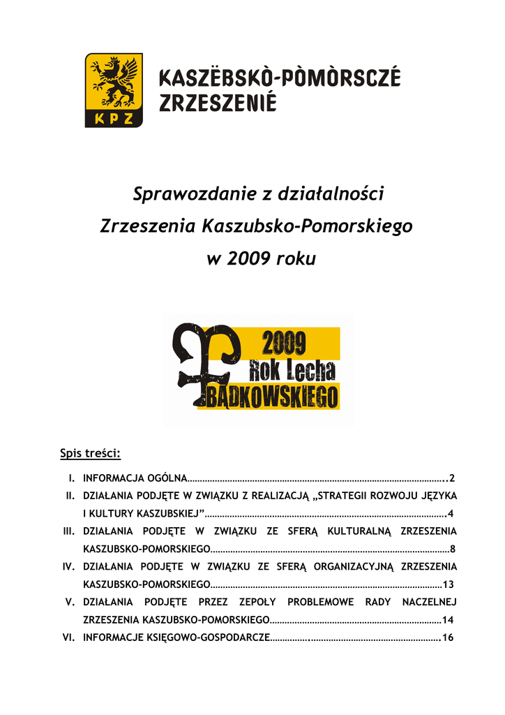 Sprawozdanie z działalności Zrzeszenia Kaszubsko-Pomorskiego w 2009 roku Spis treści: I. INFORMACJA OGÓLNA…………………………………………………………………………………………..2 II. DZIAŁANIA PODJĘTE W ZWIĄZKU Z REALIZACJĄ „STRATEGII ROZWOJU JĘZYKA I KULTURY KASZUBSKIEJ”…………………………………………………………………………………….4 III. DZIAŁANIA PODJĘTE W ZWIĄZKU ZE SFERĄ KULTURALNĄ ZRZESZENIA KASZUBSKO-POMORSKIEGO……………………………………………………………………………………8 IV. DZIAŁANIA PODJĘTE W ZWIĄZKU ZE SFERĄ ORGANIZACYJNĄ ZRZESZENIA KASZUBSKO-POMORSKIEGO…………………………………………………………………………………13 V. DZIAŁANIA PODJĘTE PRZEZ ZEPOŁY PROBLEMOWE RADY NACZELNEJ ZRZESZENIA KASZUBSKO-POMORSKIEGO……………………………………………………………14 VI. INFORMACJE KSIĘGOWO-GOSPODARCZE…………….…………………………………………….16 I. INFORMACJE OGÓLNE Nazwa stowarzyszenia: Adres: Numer KRS: Numer REGON: Data wpisu w Krajowym ZRZESZENIE KASZUBSKO-POMORSKIE 80-837 GDAŃSK, UL. STRAGANIARSKA 20-23, 0000228279 000808819 Rejestrze Sądowym: 23.02.2005 r. Dane dotyczące członków Zarządu Głównego: Imię i nazwisko lp. Funkcja Adres zamieszkania 1. Artur Jabłoński Prezes Czarny Młyn 7, 84-103 Łebcz 2. Tomasz Fopke Wiceprezes ds. kultury ul. Rewerenda 41F 80-209 Chwaszczyno 3. Eugeniusz Pryczkowski Wiceprezes ds. kontaktów z Oddziałami 4. Łukasz Grzędzicki ul. Krótka 2, 83-315 Wiceprezes ds. Szymbark organizacyjno-prawnych ul. Makowa 5, 80-297 Banino 5. Henryk Rohde Skarbnik ul. Kilińskiego 8/12, 81386 Gdynia 6. Grzegorz Świtała Sekretarz ul. Szkolna 29/1, 83-423 Wielki Klincz 7. Krzysztof Korda ul. Jaworowa 7 a m.3, 83Członek ds. kociewskich 110 Tczew 8. Andrzej Lemańczyk Członek ds. edukacji Borzyszkowy 25,77-130 Lipnica 9. Zygmunt Orzeł Członek ds. współpracy z Kościołem ul. Wyzwolenia 88, 84-120 Władysławowo ul. Zamkowa 40A, 83-300 Kartuzy 10. Kazimierz Formela Członek ds. gospodarczych 11. Malwina Kora ul. Mjr. Słabego 5/32, 80Członek ds. kontaktów z 298 Gdańsk młodzieżą 12 Iwona Makurat Członek ds. edukacji Łukasz Richert ul. Majkowskiego 11/3, 80Członek ds. kontaktów i 321 Gdańsk współpracy zagranicznej 13 2 ul. Kartuska 46b, 83-400 Kościerzyna 14 Mieczysław Konkol Członek ds. gospodarczych 15 Wojciech Kankowski Członek ds. samorządowych 16 Wojciech Józef Konkel Członek ds. projektów ul. Krzywa 4, 84-140 Jastarnia 83-330 Skrzeszewo 173 ul. Storczykowa 22 B/9, 80-177 Gdańsk Organami zarządzającymi Zrzeszenia są Rada Naczelna i Zarząd Główny. Rada Naczelna podejmuje uchwały zatwierdzające bilans i rachunek wyników. Wszystkie funkcje w Organach zarządzających Zrzeszenia pełnione są społecznie. Cele statutowe Zrzeszenia: 1/ rozbudzanie szerokiej inicjatywy dla wszechstronnego rozwoju, kulturowego, społecznego i gospodarczego Kaszub, Kociewia, Borów i całego Pomorza, 2/ kształtowanie demokratycznych stosunków w życiu regionu, 3/ rozwijanie kaszubsko-pomorskiej myśli społecznej i politycznej, 4/ kultywowanie i rozwijanie specyfiki kulturowej Kaszub, Kociewia, Borów i całego Pomorza. 5/ szerzenie w społeczeństwie (szczególnie wśród młodzieży) znajomości tradycji kaszubsko-pomorskich, 6/ dbałość o zachowanie walorów środowiska naturalnego. Do osiągnięcia powyższych celów Zrzeszenie dąży poprzez: 1/ pielęgnowanie oraz rozwijanie języka kaszubskiego i dialektów pomorskich, 2/ wskazywanie potrzeb z zakresu gospodarki, oświaty i kultury oraz życia społecznego, opracowywanie wniosków i opinii, 3/ prowadzenie działalności związanej z tworzeniem, popularyzacją wartości regionalnych, 4/ inicjowanie i prowadzenie różnorodnej działalności gospodarczej i pozagospodarczej, 5/ inicjowanie i organizowanie konferencji, seminariów, szkoleń i obozów, 6/ prowadzenie działalności klubowej, 7/ udzielanie członkom porad i pomocy, 8/ współdziałanie z innymi organizacjami i instytucjami w kraju i poza krajem, 9/ rozwijanie kontaktów z emigracją kaszubsko-pomorską, 10/ prowadzenie instytucji oświatowo-wychowawczych i kulturalnych oraz instytucji działających w zakresie ochrony środowiska, turystyki i krajoznawstwa. * * * W okresie sprawozdawczym zarówno Zarząd Główny, jak i Rada Naczelna odbywały regularnie zebrania. Łącznie odbyło się 6 zebrań RN: 17 stycznia – Gdańsk, 28 lutego – Gdańsk, 9 maja – Wieżyca, 20 czerwca – Gdańsk, 2-3 października – Puck, 5 grudnia – Toruń, oraz 9 posiedzeń ZG: 14 stycznia – Gdańsk, 11 lutego – Gdańsk, 24 marca – Gdańsk, 23 kwietnia - Gdańsk, 28 maja – Gdańsk, 17 czerwca – Gdańsk, 2 września – Gdańsk, 14 października – Gdańsk, 7 grudnia – Szymbark – Wieżyca, 22 grudnia Gdańsk 3 Najważniejsze tematy Rady Naczelnej to: Rok Lecha Bądkowskiego, Fundacja Kaszubsko-Pomorska Telewizja Regionalna, powołanie Dyrektora Wydawnictwa, III Kongres Kaszubski, II etap modernizacji obiektów ZKP w Wieżycy, sprawozdanie z działalności Rady Języka Kaszubskiego, polityka energetyczna Pomorza, inicjatywa Studentów z Krakowa. Zarząd w 2009 roku podjął 16 uchwał. Rada Naczelna w 2009 roku podjęła 20 uchwał. W ramach Rady Naczelnej działały 4 zespoły problemowe: Zespół ds. kultury, komunikacji i promocji, Zespół ds. edukacji (przewodnicząca: Judyta Śliwińska), Zespół ds. samorządu i gospodarki, Zespół ds. kościelnych (przewodniczący: Albin Bychowski). Prawo do ubiegania się o osobowość prawną przyznano następującym oddziałom: Jastarnia, Toruń, Konarzyny, Szemud. W okresie sprawozdawczym przyjęto 345 nowych członków, wykreślono 48. Funkcję Dyrektora Biura Zarządu Głównego pełnił Jerzy Michał Bujak, Funkcję Redaktora Naczelnego „Pomeranii” pełniła Iwona J