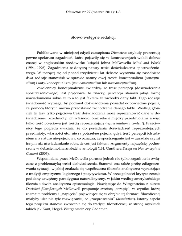 Diametros nr 27 (marzec 2011): 1-3 Słowo wstępne redakcji Publikowane w niniejszej edycji czasopisma Diametros artykuły prezentują pewne spektrum zagadnień, które pojawiły się w kontrowersjach wokół dobrze znanej w anglosaskim środowisku książki Johna McDowella Mind and World (1994, 1996). Zagadnienia te dotyczą natury treści doświadczenia spostrzeżeniowego. W toczącej się od ponad trzydziestu lat debacie wyróżnia się zasadniczo dwa rodzaje stanowisk w sprawie natury owej treści: konceptualizm (conceptualism) i anty-konceptualizm (non-conceptualism lub nonconceptualism). Zwolennicy konceptualizmu twierdzą, że treść percepcji (doświadczenia spostrzeżeniowego) jest pojęciowa, to znaczy, percepcja stanowi jakąś formę uświadomienia sobie, że to a to jest faktem, że zachodzi dany fakt. Tego rodzaju świadomość wymaga, by podmiot doświadczenia posiadał odpowiednie pojęcia, za pomocą których można przedstawić zachodzenie danego faktu. Według głosicieli tej tezy tylko pojęciowa treść doświadczenia może reprezentować dane w doświadczeniu przedmioty, ich własności oraz relacje między przedmiotami, a więc tylko treść pojęciowa jest treścią reprezentującą (representational content). Przeciwnicy tego poglądu uważają, że do posiadania doświadczeń reprezentujących przedmioty, własności etc., nie są potrzebne pojęcia, gdyż treść percepcji ich zdaniem ma naturę nie-pojęciową, co oznacza, że spostrzeganie jest w zasadzie czymś innym niż uświadamianie sobie, że coś jest faktem. Argumenty najczęściej podnoszone w debacie można znaleźć w antologii Y.H. Gunthera Essays on Nonconceptual Content (2003). Wspomniana praca McDowella porusza jednak nie tylko zagadnienia związane z problematyką treści doświadczenia. Stanowi ona także próbę zdiagnozowania sytuacji, w jakiej znalazła się współczesna filozofia analityczna wyrastająca z tradycji empiryzmu logicznego i pozytywizmu. W szczególności krytyce zostaje poddany zawężony paradygmat naturalistyczny, w jakim według amerykańskiego filozofa utkwiła analityczna epistemologia. Nawiązując do Wittgensteina z okresu Dociekań filozoficznych McDowell proponuje swoistą „terapię”, w wyniku której rozmaite problemy i „napięcia” pojawiające się w obrębie tej formacji filozoficznej miałyby ulec nie tyle rozwiązaniu, co „rozproszeniu” (dissolution). Istotny aspekt tego projektu stanowi zwrócenie się do tradycji filozoficznej, w stronę myślicieli takich jak Kant, Hegel, Wittgenstein czy Gadamer. 1 Słowo wstępne redakcji W niniejszym numerze specjalnym zamieszczamy artykuły krytycznie odnoszące się do Kantowskich inspiracji konceptualizmu McDowella, a także poddające krytyce sam ten pogląd. W wersji Kantowskiej teza konceptualizmu korzysta z rozróżnienia między samorzutnością wyższej władzy poznawczej – intelektu a receptywnością władzy niższej – zmysłowości. Można by ją zatem przedstawić w sposób następujący: samorzutność umysłu, wynikająca ze zdolności posługiwania się pojęciami (conceptual capacities), jest obecna na poziomie każdego procesu poznawczego – od samego tylko odbioru wrażenia zmysłowego po sformułowanie sądu posiadającego odpowiednią wartość poznawczą. Tematyka artykułów przedstawia się następująco: Leslie Stevenson rozważa Kantowską ideę „przewrotu kopernikańskiego”, analizując pojęcie przedmiotu przedstawienia występujące w Krytyce czystego rozumu. Podkreślając różnicę między przedstawieniem, rozumianym jako intencjonalna treść aktów poznawczych, a przedmiotem, do którego owa treść się odnosi, Stevenson pokazuje, w jaki sposób można uniknąć idealistycznej interpretacji Kanta, zgodnie z którą rzeczywistość poznawana byłaby jedynie wytworem ludzkich władz poznawczych. Przedmioty dostosowujące się do umysłu, w myśl „przewrotu”, to przedmioty rozumiane jako treść naszych aktów poznawczych, która może być zarówno niezależna od jednostkowych umysłów, jak i intersubiektywnie komunikowalna. Robert Hanna polemizuje z rozpowszechnionym poglądem, jakoby inspiracji dla konceptualizmu należało poszukiwać w Kantowskiej teorii poznania empirycznego. Jego zdaniem teoria ta, zwłaszcza w części dotyczącej naoczności zmysłowej (sinnliche Anschauung), dostarcza raczej podstaw dla anty-konceptualizmu. Stanowisko to nie musi prowadzić do problemu „mitu danych” (Myth of the Given), jak twierdzi McDowell, który błędnie identyfikuje anty-konceptualizm jako pewną wersję sensualistycznego poglądu na treść doświadczenia. Hanna charakteryzuje nie-pojęciową treść percepcji jako rodzaj pośrednika w przed-refleksyjnej relacji między podmiotem poznającym, istotą wyposażoną w zmysły i ucieleśnioną, a dziedziną przedmiotów doświadczenia. Willem deVries, nie rozstrzygając kontrowersji interpretacyjnych w odniesieniu do Kantowskiej teorii poznania empirycznego, wskazuje na trudności związane z podjętą przez McDowella próbą podważenia zasadności „dwuskładnikowej” teorii doświadczenia zaproponowanej przez Wilfrida Sellarsa. Zdaniem deVriesa, Sellars, którego teorię autor określa mianem transcendentalnego naturalizmu, dysponuje przekonywającymi racjami, by uznać, że dane zmysłowe stanowią nieredukowalny element konstytuujący treść doświadczenia. Przyjęcie tezy o ich istnieniu umożliwia po pierwsze wyjaśnienie takich zjawisk jak złudzenia 2 Słowo wstępne redakcji zmysłowe czy halucynacje, po drugie zaś pozwala uzasadnić stwierdzenie, że nasze doświadczenia odnoszą się do rzeczywistych, zewnętrznych wobec umysłu przedmiotów, których dotyczą wypowiedzi obserwacyjne i nasze przekonania. Christopher Norris umieszcza propozycję McDowella w szerszym kontekście obejmującym tradycję zarówno filozofii analitycznej (m.in. Quine, Davidson, Rorty), jak i kontynentalnej (Arystoteles, 