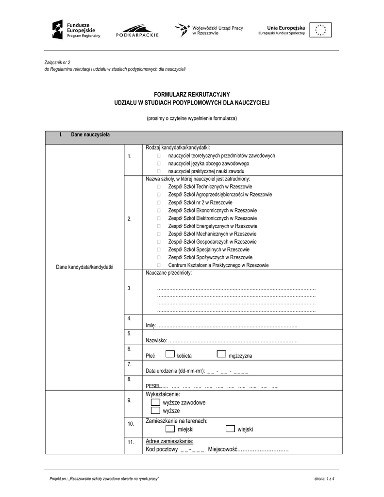Załącznik nr 2 do Regulaminu rekrutacji i udziału w studiach podyplomowych dla nauczycieli FORMULARZ REKRUTACYJNY UDZIAŁU W STUDIACH PODYPLOMOWYCH DLA NAUCZYCIELI (prosimy o czytelne wypełnienie formularza) I. Dane nauczyciela 1. 2. Dane kandydata/kandydatki Rodzaj kandydatka/kandydatki: nauczyciel teoretycznych przedmiotów zawodowych nauczyciel języka obcego zawodowego nauczyciel praktycznej nauki zawodu Nazwa szkoły, w której nauczyciel jest zatrudniony: Zespół Szkół Technicznych w Rzeszowie Zespół Szkół Agroprzedsiębiorczości w Rzeszowie Zespół Szkół nr 2 w Rzeszowie Zespół Szkół Ekonomicznych w Rzeszowie Zespół Szkół Elektronicznych w Rzeszowie Zespół Szkół Energetycznych w Rzeszowie Zespół Szkół Mechanicznych w Rzeszowie Zespół Szkół Gospodarczych w Rzeszowie Zespół Szkół Specjalnych w Rzeszowie Zespół Szkół Spożywczych w Rzeszowie Centrum Kształcenia Praktycznego w Rzeszowie Nauczane przedmioty: ……………………………………………………….………………………………… ……………………………………………………….………………………………… ……………………………………………………….………………………………… ……………………………………………………….………………………………… 3. 4. Imię: ………………………………………………………………………………. 5. Nazwisko: ………………………………………………………………………… 6. Płeć kobieta mężczyzna 7. Data urodzenia (dd-mm-rrrr): _ _ - _ _ - _ _ _ _ 8. PESEL….. ….. ….. ….. ….. ….. ….. ….. ….. ….. ….. 9. Wykształcenie: wyższe zawodowe wyższe 10. Zamieszkanie na terenach: miejski 11. wiejski Adres zamieszkania: Kod pocztowy _ _ - _ _ _ Miejscowość………………………… Projekt pn.: „Rzeszowskie szkoły zawodowe otwarte na rynek pracy” strona: 1 z 4 12. ulica ……………………………….…nr domu/lokalu…………………………… Adres zameldowania: Kod pocztowy _ _ - _ _ _ Miejscowość………………………… ulica ……………………………….…nr domu/lokalu…………………………… 13. Województwo: ………………………………………………………………………… 14. Powiat: ………….……………………………………………………………………… 15. Gmina: …………………………………………………………………………………. 16. 17. 18. 19. 20. 21. 22. 23. 24. 25. Telefon stacjonarny posiadam nie posiadam jeśli tak, to proszę podać numer ……………………………………………… Telefon komórkowy posiadam nie posiadam jeśli tak, to proszę podać numer ………………………………………………… Adres poczty elektronicznej (e-mail) posiadam nie posiadam jeśli tak, to proszę podać adres ……………………………………………………………. Status osoby na rynku pracy w chwili przystąpienia do projektu: ucząca się lub kształcąca1 osoba zatrudniona Przynależność do mniejszości narodowej lub etnicznej, migrant, osoba obcego pochodzenia: tak nie odmowa podania informacji Osoba bezdomna lub dotknięta wykluczeniem z dostępu do mieszkań: tak nie odmowa podania informacji Osoba przebywająca w gospodarstwie domowym bez osób pracujących (gospodarstwo domowe, w którym żaden członek nie pracuje; wszyscy członkowie są albo bezrobotni albo bierni zawodowo) tak nie odmowa podania informacji w tym: w gospodarstwie domowym z dziećmi pozostającymi na utrzymaniu tak nie odmowa podania informacji Osoba żyjąca w gospodarstwie składającym się z jednej osoby dorosłej i dzieci pozostających na utrzymaniu: tak nie odmowa podania informacji Osoba w innej niekorzystnej sytuacji społecznej (inne niż wymienione powyżej) proszę opisać tą sytuacje: tak nie odmowa podania informacji …………………………………………………………………………………………………. ………………………………………………………………………………………………….. Fakt bycia osobą niepełnosprawną2 tak nie odmowa podania informacji osoba ucząca się lub kształcąca się w ramach kształcenia formalnego i nieformalnego. osoba niepełnosprawna w rozumieniu ustawy z dnia 27 sierpnia 1997 r. o rehabilitacji zawodowej i społecznej oraz zatrudnianiu osób niepełnosprawnych (Dz. U. z 2011 r. Nr 127, poz. 721, z późn. zm.), a także osoba z zaburzeniami psychicznymi, o których mowa w ustawie z dnia 19 sierpnia 1994 r. o ochronie zdrowia psychicznego (Dz. U. 1994 nr 111, poz. 535), tj. osoba z odpowiednim orzeczeniem lub innym dokumentem poświadczającym stan zdrowia 1 2 Projekt pn.: „Rzeszowskie szkoły zawodowe otwarte na rynek pracy” strona: 2 z 4 Należy wpisać nazwę studiów podyplomowych zgodnie z listą dostępnych studiów podyplomowych dla danej Szkoły, dostępną w Zespołach szkół i Biurze projektu II. Forma wsparcia – studia podyplomowe dla nauczyciela Wybór formy wsparcia3 Nazwa studiów podyplomowych ……………………………………………………………………………………………………………………………………. ......................................................................................................... data i czytelny podpis nauczyciela przystępującego do udziału w studiach podyplomowych OŚWIADCZENIE Oświadczam, że: 1) zapoznałem/am się z Regulaminu rekrutacji i uczestnictwa w studiach podyplomowych dla nauczycieli w ramach projektu pn. „Rzeszowskie szkoły zawodowe otwarte na rynek pracy” i zobowiązuję się przestrzegać jego postanowień; 2) zostałem/am poinformowany, że projekt pn. „Rzeszowskie szkoły zawodowe otwarte na rynek pracy” jest współfinansowan