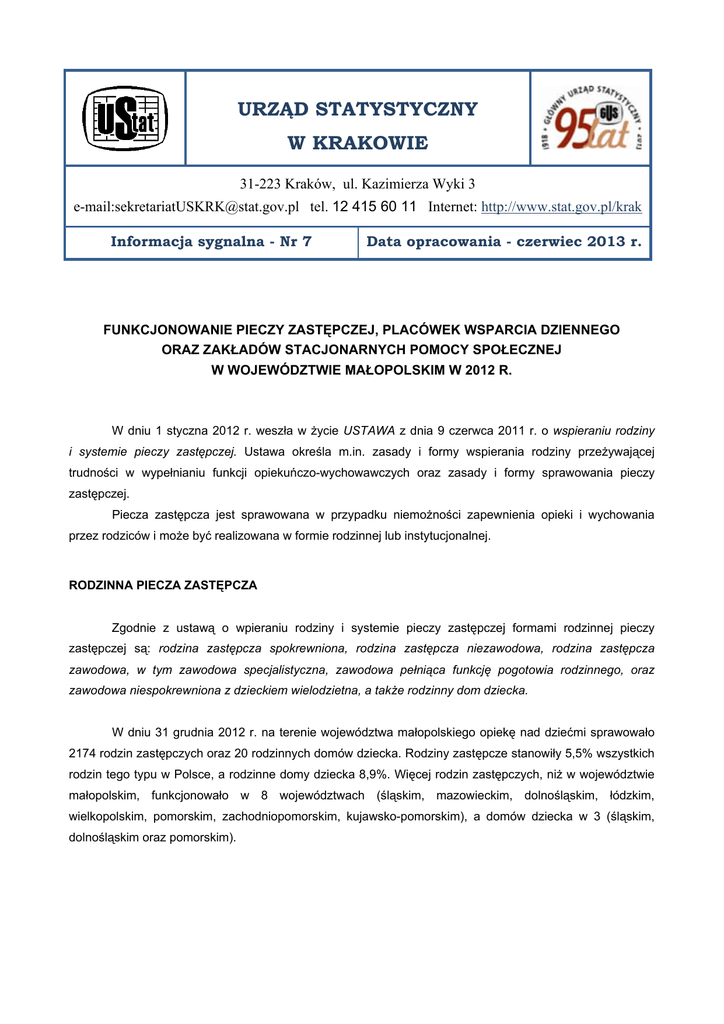 URZĄD STATYSTYCZNY W KRAKOWIE 31-223 Kraków, ul. Kazimierza Wyki 3 e-mail:[email protected] tel. 12 415 60 11 Internet: http://www.stat.gov.pl/krak Informacja sygnalna - Nr 7 Data opracowania - czerwiec 2013 r. FUNKCJONOWANIE PIECZY ZASTĘPCZEJ, PLACÓWEK WSPARCIA DZIENNEGO ORAZ ZAKŁADÓW STACJONARNYCH POMOCY SPOŁECZNEJ W WOJEWÓDZTWIE MAŁOPOLSKIM W 2012 R. W dniu 1 styczna 2012 r. weszła w życie USTAWA z dnia 9 czerwca 2011 r. o wspieraniu rodziny i systemie pieczy zastępczej. Ustawa określa m.in. zasady i formy wspierania rodziny przeżywającej trudności w wypełnianiu funkcji opiekuńczo-wychowawczych oraz zasady i formy sprawowania pieczy zastępczej. Piecza zastępcza jest sprawowana w przypadku niemożności zapewnienia opieki i wychowania przez rodziców i może być realizowana w formie rodzinnej lub instytucjonalnej. RODZINNA PIECZA ZASTĘPCZA Zgodnie z ustawą o wpieraniu rodziny i systemie pieczy zastępczej formami rodzinnej pieczy zastępczej są: rodzina zastępcza spokrewniona, rodzina zastępcza niezawodowa, rodzina zastępcza zawodowa, w tym zawodowa specjalistyczna, zawodowa pełniąca funkcję pogotowia rodzinnego, oraz zawodowa niespokrewniona z dzieckiem wielodzietna, a także rodzinny dom dziecka. W dniu 31 grudnia 2012 r. na terenie województwa małopolskiego opiekę nad dziećmi sprawowało 2174 rodzin zastępczych oraz 20 rodzinnych domów dziecka. Rodziny zastępcze stanowiły 5,5% wszystkich rodzin tego typu w Polsce, a rodzinne domy dziecka 8,9%. Więcej rodzin zastępczych, niż w województwie małopolskim, funkcjonowało w 8 województwach (śląskim, mazowieckim, dolnośląskim, łódzkim, wielkopolskim, pomorskim, zachodniopomorskim, kujawsko-pomorskim), a domów dziecka w 3 (śląskim, dolnośląskim oraz pomorskim). -2Mapa 1. Dzieci przebywające w rodzinnej pieczy zastępczej na 1 tys. dzieci do 18 roku życia w 2012 r. Stan w dniu 31 XII 6,4 4,3 6,2 3,1 4,2 3,9 6,8 4,5 6,1 3,2 5,5 3,0 5,7 2,9 5,4 2,7 5,9 2,9 5,3 5,3 2,7 - 3,2 (7) 3,9 - 4,5 (4) 4,1 2,7 5,3 - 5,7 (6) 5,9 - 6,8 (5) 5,3 U w a g a : Pominięto przedziały, w których zjawisko nie wystąpiło. Funkcję rodzinnej pieczy zastępczej pełniły 1352 małżeństwa oraz 842 osoby samotne. W większości – 61,8% - były to osoby spokrewnione z dzieckiem. Rodziny niezawodowe stanowiły 31,1% ogółu rodzinnej pieczy zastępczej, o charakterze pogotowia rodzinnego 2,6%, zawodowe - 1,4%, wielodzietne – 1,1%, zawodowe specjalistyczne – 1,0%, a rodzinne domy dziecka 0,9%. Najczęściej pełnienia funkcji rodzinnej pieczy zastępczej podejmowały się osoby w wieku 51-60 lat - 30,0% oraz w wieku 61-70 lat - 22,5%. Wiek osób pełniących funkcję rodzinnej pieczy zastępczej był zróżnicowany w zależności od typu rodziny. W rodzinach zastępczych spokrewnionych z dzieckiem 3/4 osób przekroczyło 50 rok życia. W zawodowych niespokrewnionych z dzieckiem wielodzietnych rodzinach zastępczych odsetek takich osób wyniósł 68,0%, a w niezawodowych, zawodowych oraz pełniących funkcję pogotowia rodzinnego ponad 30%. Z kolei osoby do 21 roku życia pełniły tylko funkcję rodziny zastępczej spokrewnionej (1,0%) oraz rodziny zastępczej niezawodowej (0,1%). Największą grupę wśród wychowanków stanowiły osoby w wieku 7-13 lat, ich udział w ogólnej liczbie dzieci wyniósł 37,5%. Dużą zbiorowość tworzyły również dzieci w wieku 14-17 lat – 32,8%. Dzieci w wieku 4-6 lat stanowiły 8,7%, a w wieku 3 lat i mniej – 8,4%. -3Wykres 1. Dzieci przebywające w rodzinnej pieczy zastępczej według wieku w 2012 r. Stan w dniu 31 XII osoby 1400 1200 1206 1000 1054 800 600 400 200 0 74 0 lat 402 281 197 1-3 4-6 7 - 13 14-17 18-24 lata W 2012 r. 320 dzieci w wieku do 18 roku życia opuściło rodzinną pieczę zastępczą. Najczęstszym powodem opuszczenia rodziny przez niepełnoletniego wychowanka był powrót do rodziny naturalnej (31,6%). Drugim w kolejności powodem, który dotyczył 29,1% wychowanków, było przekazanie dziecka do adopcji, kolejnym umieszczenie w innej formie rodzinnej pieczy zastępczej (14,7%). W instytucjonalnej pieczy zastępczej umieszczono 17,8% dzieci. Wśród 206 wychowanków pełnoletnich, którzy w roku 2012 opuścili rodzinną pieczę zastępczą, 1/4 założyła własne gospodarstwo, a 11,7% powróciło do rodziny naturalnej lub krewnych. Wykres 2. Dzieci, które opuściły rodzinną pieczę zastępczą w 2012 r. według powodów opuszczenia do 18 roku życia powróciły do rodziny naturalnej 101 umieszczone w innej formie rodzinnej pieczy zastępczej 47 przekazane do adopcji 93 umieszczone w instytytucjonalnej pieczy zastępczej 57 po 18 roku życia inny powód 22 usamodzielnione powróciły do rodziny naturalnej, krewnych usamodzielnione założyły własne gospodarstwo domowe 24 52 usamodzielnione inne 14 nieusamodzielnione 116 0 20 40 60 80 100 120 osoby Na 3214 dzieci przebywających w dniu 31 grudnia w rodzinnej pieczy zastępczej 402 ukończyło 18 rok życia. 175 dzieci to sieroty, pozostałe dzieci posiadały przynajmniej jednego rodzica. 314 dzieci posiadało orzeczenie o niepełnosprawności. INSTYTUCJONALNA PIECZA ZASTĘPCZA Instytucjonalna piecza zastępcza jest sprawowana w formie: placówki opiekuńczo-wychowawczej, regionalnej placówki opiekuńczo-terapeutycznej, interwencyjnego ośrodka preadobcyjnego. W 2012 r. na terenie województwa małopolskiego działały tylko placówki opiekuńczo-wychowawcze. Placówka opiekuńczo–wychowawcza może być prowadzona jako placówka typu socjalizacyjnego, interwencyjnego, specjalistyczno–terapeutycznego, rodzinnego lub łącząca zadania ww. placówek. -4Placówki te sprawują opiekę nad dziećmi i młodzieżą pozbawioną całkowicie lub częściowo opieki ze strony rodziny naturalnej. W dniu 31 grudnia 2012 r. na terenie województwa małopolskiego działały 73 placówki opiekuńczo-wychowawcze. Stanowiły one 8,7% wszystkich (841) placówek tego rodzaju w Polsce. Więcej placówek d