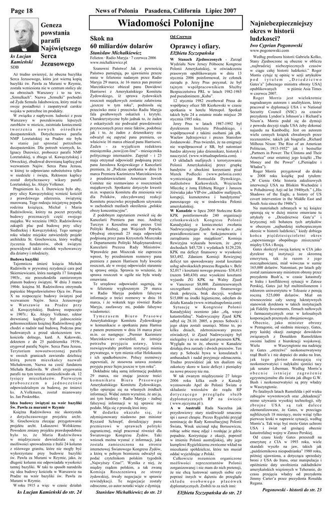 Page 18 ks Lucjan Kamieński News of Polonia Pasadena, California Lipiec 2007 Geneza powstania parafii Najświętszego Serca Jezusowego Wiadomości Polonijne Skok na 60 miliardów dolarów Od Czerwcu Stanisław Michałkiewicz Elżbieta Szczepańska Felieton · Radio Maryja · 7 czerwca 2006 www.michalkiewicz.pl Oprawcy i ofiary. Idea budowy świątyni na wzór bazyliki Św. Pawła za murami w Rzymie Księźna Radziwiłowa nie skorzystała z dotychczasowego projektu archt. St. Grochowicza zlecając przygotowanie projektu archt. Łukaszowi Wolskiemu. Powodem zmiany projektu prawdopodobnie było to, że Maria Radziwiłowa w międzyczasie dowiedziała się o możliwości sprowadzenia z Italii 24 kolumn z różowego granitu, które nie mogły być wykorzystane przy budowie bazyliki św. Pawła za Murami w Rzymie, jako, źe długość kolumn nie odpowiadała wysokości tamtej bazyliki. W taki to sposób narodziła się idea budowy kościoła w Warszawie na Pradze na wzór bazyliki św. Pawła za Murami w Rzymie. W roku 1915 a więc w czasie działań Szanowni Państwo! Jak z pewnością Państwo pamiętają, po ujawnieniu przeze mnie w felietonie nadanym przez Radio Maryja 29 marca, że 16 marca pan premier Marcinkiewicz obiecał panu Dawidowi Harrisowi z Amerykańskiego Komitetu Żydowskiego, iż sprawa żydowskich roszczeń majątkowych zostanie załatwiona „jeszcze w tym roku”, podniosła się przeciwko mnie i przeciwko Radiu Maryja fala gwałtownych oskarżeń i krytyki. Charakterystyczne było jednak to, że żaden z oskarżycieli nie podważał prawdziwości przytoczonych przez mnie faktów, podobnie jak i to, że żaden z dziennikarzy nie odważył się zapytać pana premiera, co właściwie 16 marca obiecał panu Harrisowi. Żaden - za wyjątkiem redaktora miesięcznika „now@on-line” - miesięcznika politycznego internautów. Zapytał - i 23 maja otrzymał odpowiedź podpisaną przez pana Jarosława Krajewskiego z Kancelarii premiera, że „Podczas spotkania w dniu 16 marca Premiera Kazimierza Marcinkiewicza z przedstawicielami American Jewish Comitee nie rozmawiano o roszczeniach majątkowych. Spotkanie dotyczyło kwestii m.in. wsparcia Komitetu dla zniesienia wiz dla Polaków, zdecydowanej reakcji Komitetu przeciwko przypadkom używania w zachodnich mediach określenia „polskie obozy koncentracyjne”. Z podobnym zapytaniem zwrócił się do Kancelarii Premiera pan mec. Andrzej Turczyn z Koszalina oraz prezes Unii Polityki Realnej, pan Wojciech Popiela. Obydwaj otrzymali 25 maja odpowiedź podpisaną przez pana Krzysztofa Miszczaka z Departamentu Polityki Międzynarodowej Kancelarii Prezesa Rady Ministrów. Wprawdzie pan Miszczak nie zaprzecza wprost, by przedmiotem rozmowy pana premiera z panem Harrisem były kwestie roszczeń, ale w swojej odpowiedzi starannie tę sprawę omija. Sprawia to wrażenie, że sprawa roszczeń w ogóle nie była wtedy omawiana. Te urzędowe odpowiedzi sugerują, że w felietonie wygłoszonym 29 marca w Radio Maryja podałem fałszywe informacje o treści rozmowy w dniu 16 marca, i że wskutek tego również Radio Maryja, zaufawszy mi, podało fałszywe wiadomości. Tymczasem Biuro Prasowe Amerykańskiego Komitetu Żydowskiego w komunikacie o spotkaniu pana Harrisa z panem premierem w dniu 16 marca pisze m.in. co następuje: „Premier Kazimierz Marcinkiewicz stwierdził, że istnieje potrzeba przyjęcia ustawy, która rozwiązywałaby problem restytucji mienia prywatnego, w tym mienia ofiar Holokaustu i ich spadkobierców. Polscy rozmówcy zapewniali, że stosowna ustawa zostanie przyjęta przez Sejm jeszcze w tym roku”. Dokładnie taką samą informację podałem 29 marca, nie znając jeszcze treści komunikatu Biura Prasowego Amerykańskiego Komitetu Żydowskiego, tylko opierajac się na własnych źródłach informacji. Widać zatem wyrażnie, że ani ja, ani tym bardziej - Radio Maryja - żadnej fałszywej informacji w tej sprawie nie podało. Mija się z prawdą ktoś inny. W dodatku okazało się, że zdymisjonowany niedawno pan minister Ryszard Schnepf, doradzający panu premierowi w sprawach polityki zagranicznej, mógł pracować również dla Światowego Kongresu Żydów. Taki wniosek można wysnuć z informacji, jaka została zamieszczona na stronie internetowej Światowego Kongresu Żydów, a którą w pełnym brzmieniu odważył się podać czytelnikom polskim tygodnik „Najwyższy Czas!”. Wynika z niej, że między rządem polskim, a tak zwaną Komisja Roszczeniową ze strony żydowskiej, trwały negocjacje w sprawie rewindykacji. Te negocjacje zostały odroczone, co autor notatki wiąże z dymisją W Stanach Zjednoczonych - Zarząd Wydziału New Jersey Północne Kongresu Polonii Amerykańskiej, w oświadczeniu prasowym opublikowanym w dniu 13 stycznia 2006 poinformował, że członek zarządu p. Jerzy Prus przyznał, że był tajnym współpracownikiem Służby Bezpieczeństwa PRL w latach 1982-1985 pod pseudonimem „Kuba”. 12 stycznia 1982 zwerbował Prusa do współpracy oficer SB Kierkowski w czasie spotkania w hotelu Metropol. Spotkań takich było 24 a ostatnie miało miejsce 20 stycznia 1985 roku. Jerzy Prus w latach 1987-1992 był dyrektorem Instytutu Piłsudskiego, i współpracował z takimi osobami jak płk. Wacław Jędrzejewicz i prezes Stanisław Jordanowski . Prus twierdzi, że na emigracji nie współpracował z SB, był natomiast bardzo aktywny jako dziennikarz, historyk i nauczyciel. (www.wirtualnapolonia.com). O układach mafijnych i terroryzowaniu Polonii Amerykańskiej przez grupkę bandytów z ubeckimi korzeniami pisał Marek Podlecki (www.polonia.com) wymieniając Romualda Dymskiego, małżeństwo Karkowskich, Wojciecha Mleczkę z żoną Elżbietą Ringer i Janusza Jóźwiaka jako VIP-ów „układów mafijnych, korupcji, kumoterstwa i bandytyzmu” panoszącego się w środowisku Polonii amerykańskiej. W Kanadzie w lipcu 2005 Stołeczne Koło KPK poinformowało 240 organizacji człon ko ws kich K