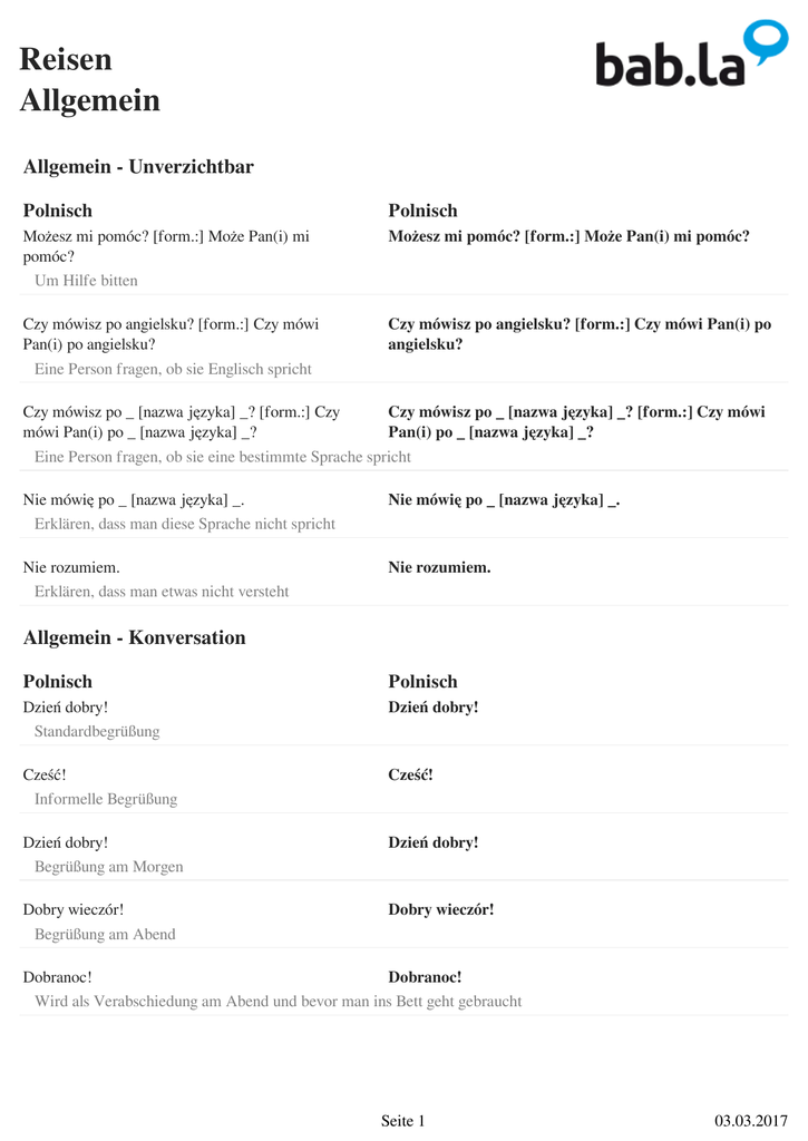 Reisen Allgemein Allgemein - Unverzichtbar Polnisch Polnisch Możesz mi pomóc? [form.:] Może Pan(i) mi pomóc? Um Hilfe bitten Możesz mi pomóc? [form.:] Może Pan(i) mi pomóc? Czy mówisz po angielsku? [form.:] Czy mówi Pan(i) po angielsku? Eine Person fragen, ob sie Englisch spricht Czy mówisz po angielsku? [form.:] Czy mówi Pan(i) po angielsku? Czy mówisz po _ [nazwa języka] _? [form.:] Czy Czy mówisz po _ [nazwa języka] _? [form.:] Czy mówi mówi Pan(i) po _ [nazwa języka] _? Pan(i) po _ [nazwa języka] _? Eine Person fragen, ob sie eine bestimmte Sprache spricht Nie mówię po _ [nazwa języka] _. Erklären, dass man diese Sprache nicht spricht Nie mówię po _ [nazwa języka] _. Nie rozumiem. Erklären, dass man etwas nicht versteht Nie rozumiem. Allgemein - Konversation Polnisch Polnisch Dzień dobry! Standardbegrüßung Dzień dobry! Cześć! Informelle Begrüßung Cześć! Dzień dobry! Begrüßung am Morgen Dzień dobry! Dobry wieczór! Begrüßung am Abend Dobry wieczór! Dobranoc! Dobranoc! Wird als Verabschiedung am Abend und bevor man ins Bett geht gebraucht Seite 1 03.03.2017 Reisen Allgemein Jak się masz? [form.:] Jak się Pan(i) ma? Jak się masz? [form.:] Jak się Pan(i) ma? Frage nach dem Befinden der Person am Anfang des Gesprächs Dobrze, dziękuję. Dobrze, dziękuję. Eine höfliche Antwort auf die Frage "Wie geht es Dir?" Jak się nazywasz? [form.:] Jak się Pan(i) nazywa? Eine andere Person nach dem Namen fragen Jak się nazywasz? [form.:] Jak się Pan(i) nazywa? Nazywam się ___. Einer Person den eigenen Namen sagen Nazywam się ___. Skąd pochodzisz? [form.:] Skąd Pan(i) pochodzi? Fragen, woher jemand kommt Skąd pochodzisz? [form.:] Skąd Pan(i) pochodzi? Pochodzę z ___. Antworten, woher du kommst Pochodzę z ___. Ile masz lat? [form.:] Ile ma Pan(i) lat? Fragen, wie alt jemand ist Ile masz lat? [form.:] Ile ma Pan(i) lat? Mam ___ lat(a). Antworten, wie alt du bist Mam ___ lat(a). Tak Positive Antwort Tak Nie Negative Antwort Nie Proszę Proszę Höflichkeitsformel zur Unterstreichung einer Aufforderung oder Frage Proszę bardzo! Proszę bardzo! Wird gebraucht, wenn eine Person einer anderen etwas gibt Dziękuję. Jemanden danken Dziękuję. Seite 2 03.03.2017 Reisen Allgemein Dziękuję bardzo. Dziękuję bardzo. Wird gebraucht, wenn man jemanden herzlich dankt Proszę bardzo! / Nie ma za co! Höfliche Antwort auf "Danke" Proszę bardzo! / Nie ma za co! Przepraszam. Sich für etwas entschuldigen Przepraszam. Przepraszam. Um die Aufmerksamkeit von jemanden bitten Przepraszam. Nic się nie stało. Nic się nie stało. Auf eine Entschuldigung antworten, falls Du sie akzeptiert hast Nie ma sprawy. Nie ma sprawy. Auf eine Entschuldigung antworten, falls Du sie akzeptiert hast Uwaga! Jemanden auf eine Gefahr aufmerksam machen Uwaga! Jestem głodny/-a. Wird gebraucht, wenn man hungrig ist Jestem głodny/-a. Chce mi się pić. Wird gebraucht, wenn man durstig ist Chce mi się pić. Jestem zmęczony/-a. Wird gebraucht, wenn man müde ist Jestem zmęczony/-a. Źle się czuję. Wird gebraucht, wenn man krank ist Źle się czuję. Nie wiem. Du weißt die Antwort auf eine Frage nicht Nie wiem. Miło było cię poznać. [form.:] Miło było Panią/Pana poznać. Höflicher Abschiedssatz nach einem ersten Treffen Miło było cię poznać. [form.:] Miło było Panią/Pana poznać. Seite 3 03.03.2017 Reisen Allgemein Do widzenia! Sich höflich verabschieden Do widzenia! Allgemein - Beschwerden Polnisch Polnisch Chciał(a)bym złożyć skargę. Chciał(a)bym złożyć skargę. Auf höfliche Art und Weise eine Beschwerde äußern Kto tu rządzi? Herausfinden, wer zuständig ist Kto tu rządzi? To jest absolutnie niedopuszczalne! To jest absolutnie niedopuszczalne! Nachdrücklich seine Unzufriedenheit zum Ausdruck bringen Żądam zwrotu pieniędzy! Eine Rückerstattung fordern Żądam zwrotu pieniędzy! Czekamy ponad godzinę. Sich über lange Wartezeiten beschweren Czekamy ponad godzinę. Allgemein - Fluchen Polnisch Polnisch To jedzenie smakuje jak gówno! To jedzenie smakuje jak gówno! Auf unhöfliche Art und Weise seine Unzufriedenheit mit dem Essen ausdrücken Ten napój/drink smakuje jak szczyny! Ten napój/drink smakuje jak szczyny! Auf unhöfliche Art und Weise seine Unzufriedenheit über ein Getränk ausdrücken To miejsce to obrzydliwa nora! To miejsce to obrzydliwa nora! Sich auf unhöfliche Art und Weise über einen Ort äußern Ten samochód to wrak! Ten samochód to wrak! Fluchend zum Ausdruck bringen, dass ein Auto in keinem guten Zustand ist Obsługa jest do dupy! Obsługa jest do dupy! Auf unhöfliche Art und Weise seine Unzufriedenheit mit dem Service ausdrücken Seite 4 03.03.2017 Reisen Allgemein To jest totalne zdzierstwo! To jest totalne zdzierstwo! Sich auf unhöfliche Art und Weise über den Preis beschweren Gówno prawda! Gówno prawda! Unglaube über etwas ausdrücken, das jemand gesagt hat Kretyn/Kretynka! Kretyn/Kretynka! Eine Person beleidigen indem man ihre/seine Intelligenz kritisiert Gówno wiesz! Gówno wiesz! Eine Person beleidigen indem man ihr/sein sein Wissen kritisiert Odwal się! Odwal się! Auf unhöfliche Art und Weise einer Person mitteilen, sofort zu gehen Załatwmy to na zewnątrz! Załatwmy to na zewnątrz! Einer Person sagen, außerhalb einer Bar oder Diskothek zu kämpfen Seite 5 Powered by TCPDF (www.tcpdf.org) 03.03.2017