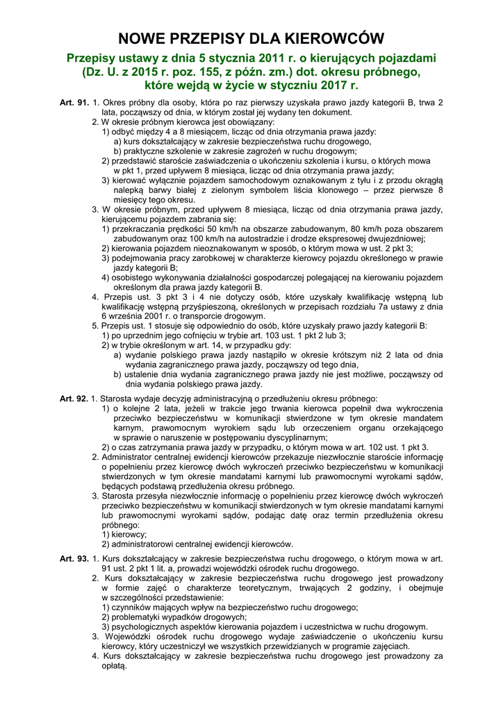 NOWE PRZEPISY DLA KIEROWCÓW Przepisy ustawy z dnia 5 stycznia 2011 r. o kierujących pojazdami (Dz. U. z 2015 r. poz. 155, z późn. zm.) dot. okresu próbnego, które wejdą w życie w styczniu 2017 r. Art. 91. 1. Okres próbny dla osoby, która po raz pierwszy uzyskała prawo jazdy kategorii B, trwa 2 lata, począwszy od dnia, w którym został jej wydany ten dokument. 2. W okresie próbnym kierowca jest obowiązany: 1) odbyć między 4 a 8 miesiącem, licząc od dnia otrzymania prawa jazdy: a) kurs dokształcający w zakresie bezpieczeństwa ruchu drogowego, b) praktyczne szkolenie w zakresie zagrożeń w ruchu drogowym; 2) przedstawić staroście zaświadczenia o ukończeniu szkolenia i kursu, o których mowa w pkt 1, przed upływem 8 miesiąca, licząc od dnia otrzymania prawa jazdy; 3) kierować wyłącznie pojazdem samochodowym oznakowanym z tyłu i z przodu okrągłą nalepką barwy białej z zielonym symbolem liścia klonowego – przez pierwsze 8 miesięcy tego okresu. 3. W okresie próbnym, przed upływem 8 miesiąca, licząc od dnia otrzymania prawa jazdy, kierującemu pojazdem zabrania się: 1) przekraczania prędkości 50 km/h na obszarze zabudowanym, 80 km/h poza obszarem zabudowanym oraz 100 km/h na autostradzie i drodze ekspresowej dwujezdniowej; 2) kierowania pojazdem nieoznakowanym w sposób, o którym mowa w ust. 2 pkt 3; 3) podejmowania pracy zarobkowej w charakterze kierowcy pojazdu określonego w prawie jazdy kategorii B; 4) osobistego wykonywania działalności gospodarczej polegającej na kierowaniu pojazdem określonym dla prawa jazdy kategorii B. 4. Przepis ust. 3 pkt 3 i 4 nie dotyczy osób, które uzyskały kwalifikację wstępną lub kwalifikację wstępną przyśpieszoną, określonych w przepisach rozdziału 7a ustawy z dnia 6 września 2001 r. o transporcie drogowym. 5. Przepis ust. 1 stosuje się odpowiednio do osób, które uzyskały prawo jazdy kategorii B: 1) po uprzednim jego cofnięciu w trybie art. 103 ust. 1 pkt 2 lub 3; 2) w trybie określonym w art. 14, w przypadku gdy: a) wydanie polskiego prawa jazdy nastąpiło w okresie krótszym niż 2 lata od dnia wydania zagranicznego prawa jazdy, począwszy od tego dnia, b) ustalenie dnia wydania zagranicznego prawa jazdy nie jest możliwe, począwszy od dnia wydania polskiego prawa jazdy. Art. 92. 1. Starosta wydaje decyzję administracyjną o przedłużeniu okresu próbnego: 1) o kolejne 2 lata, jeżeli w trakcie jego trwania kierowca popełnił dwa wykroczenia przeciwko bezpieczeństwu w komunikacji stwierdzone w tym okresie mandatem karnym, prawomocnym wyrokiem sądu lub orzeczeniem organu orzekającego w sprawie o naruszenie w postępowaniu dyscyplinarnym; 2) o czas zatrzymania prawa jazdy w przypadku, o którym mowa w art. 102 ust. 1 pkt 3. 2. Administrator centralnej ewidencji kierowców przekazuje niezwłocznie staroście informację o popełnieniu przez kierowcę dwóch wykroczeń przeciwko bezpieczeństwu w komunikacji stwierdzonych w tym okresie mandatami karnymi lub prawomocnymi wyrokami sądów, będących podstawą przedłużenia okresu próbnego. 3. Starosta przesyła niezwłocznie informację o popełnieniu przez kierowcę dwóch wykroczeń przeciwko bezpieczeństwu w komunikacji stwierdzonych w tym okresie mandatami karnymi lub prawomocnymi wyrokami sądów, podając datę oraz termin przedłużenia okresu próbnego: 1) kierowcy; 2) administratorowi centralnej ewidencji kierowców. Art. 93. 1. Kurs dokształcający w zakresie bezpieczeństwa ruchu drogowego, o którym mowa w art. 91 ust. 2 pkt 1 lit. a, prowadzi wojewódzki ośrodek ruchu drogowego. 2. Kurs dokształcający w zakresie bezpieczeństwa ruchu drogowego jest prowadzony w formie zajęć o charakterze teoretycznym, trwających 2 godziny, i obejmuje w szczególności przedstawienie: 1) czynników mających wpływ na bezpieczeństwo ruchu drogowego; 2) problematyki wypadków drogowych; 3) psychologicznych aspektów kierowania pojazdem i uczestnictwa w ruchu drogowym. 3. Wojewódzki ośrodek ruchu drogowego wydaje zaświadczenie o ukończeniu kursu kierowcy, który uczestniczył we wszystkich przewidzianych w programie zajęciach. 4. Kurs dokształcający w zakresie bezpieczeństwa ruchu drogowego jest prowadzony za opłatą. –2– Art. 94. 1. Praktyczne szkolenie w zakresie zagrożeń w ruchu drogowym, o którym mowa w art. 91 ust. 2 pkt 1 lit. b, prowadzi odpłatnie ośrodek doskonalenia techniki jazdy. 2. Praktyczne szkolenie w zakresie zagrożeń w ruchu drogowym jest przeprowadzane w formie ćwiczeń praktycznych, trwających 1 godzinę, i ma na celu: 1) uświadomienie niebezpieczeństw wynikających z nadmiernej i niedostosowanej do warunków ruchu prędkości; 2) kształtowanie postawy defensywnej u osoby szkolonej. 3. Ośrodek doskonalenia techniki jazdy wydaje zaświadczenie o ukończeniu szkolenia kierowcy, który uczestniczył we wszystkich przewidzianych w programie zajęciach.