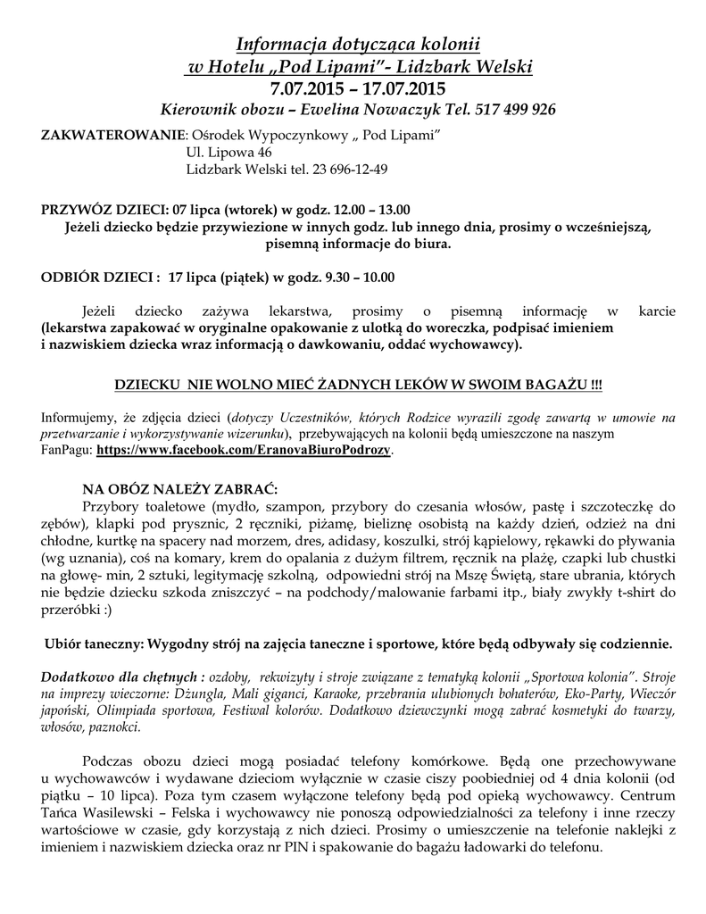 Informacja dotycząca kolonii w Hotelu „Pod Lipami”- Lidzbark Welski 7.07.2015 – 17.07.2015 Kierownik obozu – Ewelina Nowaczyk Tel. 517 499 926 ZAKWATEROWANIE: Ośrodek Wypoczynkowy „ Pod Lipami” Ul. Lipowa 46 Lidzbark Welski tel. 23 696-12-49 PRZYWÓZ DZIECI: 07 lipca (wtorek) w godz. 12.00 – 13.00 Jeżeli dziecko będzie przywiezione w innych godz. lub innego dnia, prosimy o wcześniejszą, pisemną informacje do biura. ODBIÓR DZIECI : 17 lipca (piątek) w godz. 9.30 – 10.00 Jeżeli dziecko zażywa lekarstwa, prosimy o pisemną informację w (lekarstwa zapakować w oryginalne opakowanie z ulotką do woreczka, podpisać imieniem i nazwiskiem dziecka wraz informacją o dawkowaniu, oddać wychowawcy). karcie DZIECKU NIE WOLNO MIEĆ ŻADNYCH LEKÓW W SWOIM BAGAŻU !!! Informujemy, że zdjęcia dzieci (dotyczy Uczestników, których Rodzice wyrazili zgodę zawartą w umowie na przetwarzanie i wykorzystywanie wizerunku), przebywających na kolonii będą umieszczone na naszym FanPagu: https://www.facebook.com/EranovaBiuroPodrozy. NA OBÓZ NALEŻY ZABRAĆ: Przybory toaletowe (mydło, szampon, przybory do czesania włosów, pastę i szczoteczkę do zębów), klapki pod prysznic, 2 ręczniki, piżamę, bieliznę osobistą na każdy dzień, odzież na dni chłodne, kurtkę na spacery nad morzem, dres, adidasy, koszulki, strój kąpielowy, rękawki do pływania (wg uznania), coś na komary, krem do opalania z dużym filtrem, ręcznik na plażę, czapki lub chustki na głowę- min, 2 sztuki, legitymację szkolną, odpowiedni strój na Mszę Świętą, stare ubrania, których nie będzie dziecku szkoda zniszczyć – na podchody/malowanie farbami itp., biały zwykły t-shirt do przeróbki :) Ubiór taneczny: Wygodny strój na zajęcia taneczne i sportowe, które będą odbywały się codziennie. Dodatkowo dla chętnych : ozdoby, rekwizyty i stroje związane z tematyką kolonii „Sportowa kolonia”. Stroje na imprezy wieczorne: Dżungla, Mali giganci, Karaoke, przebrania ulubionych bohaterów, Eko-Party, Wieczór japoński, Olimpiada sportowa, Festiwal kolorów. Dodatkowo dziewczynki mogą zabrać kosmetyki do twarzy, włosów, paznokci. Podczas obozu dzieci mogą posiadać telefony komórkowe. Będą one przechowywane u wychowawców i wydawane dzieciom wyłącznie w czasie ciszy poobiedniej od 4 dnia kolonii (od piątku – 10 lipca). Poza tym czasem wyłączone telefony będą pod opieką wychowawcy. Centrum Tańca Wasilewski – Felska i wychowawcy nie ponoszą odpowiedzialności za telefony i inne rzeczy wartościowe w czasie, gdy korzystają z nich dzieci. Prosimy o umieszczenie na telefonie naklejki z imieniem i nazwiskiem dziecka oraz nr PIN i spakowanie do bagażu ładowarki do telefonu. UWAGA!!! Przez pierwsze trzy dni nie dzwonimy do dzieci. Od 4 dnia kolonii (10 lipca) istnieją dwie możliwości kontaktu z dzieckiem: 1. Dzwonimy podczas godzin posiłków tj. 8.00 - 8.30, 13.00 - 13.30 - tel. 517 499 862 2. Dzwonimy w czasie ciszy poobiedniej na numer telefonu komórkowego dziecka w godz. 13.45- 14.15 Nie będzie możliwości poproszenia dzieci do tel. o innej porze dnia. W przypadku rezygnacji w trakcie trwania obozu nie zwracamy żadnych kosztów. Kierownik obozu- Ewelina Nowaczyk, Tel 517 499 926. ( telefonować w nagłych przypadkach lub prosimy o przesłanie informacji sms-em – skontaktujemy się tak szybko jak to będzie możliwe). Prosimy jednocześnie o informowanie kierownika o życzeniach lub uwagach, które dziecko Państwo przekazało telefonicznie, a o których my możemy nie wiedzieć. Telefon będzie aktywny od pierwszego dnia kolonii. Drodzy Rodzice !!! Serdecznie prosimy, by odwiedzać dzieci jedynie w wyjątkowej potrzebie, gdyż spotkanie takie wzmaga tęsknotę za domem, a chcielibyśmy, aby dziecko pozostało z nami do końca obozu.