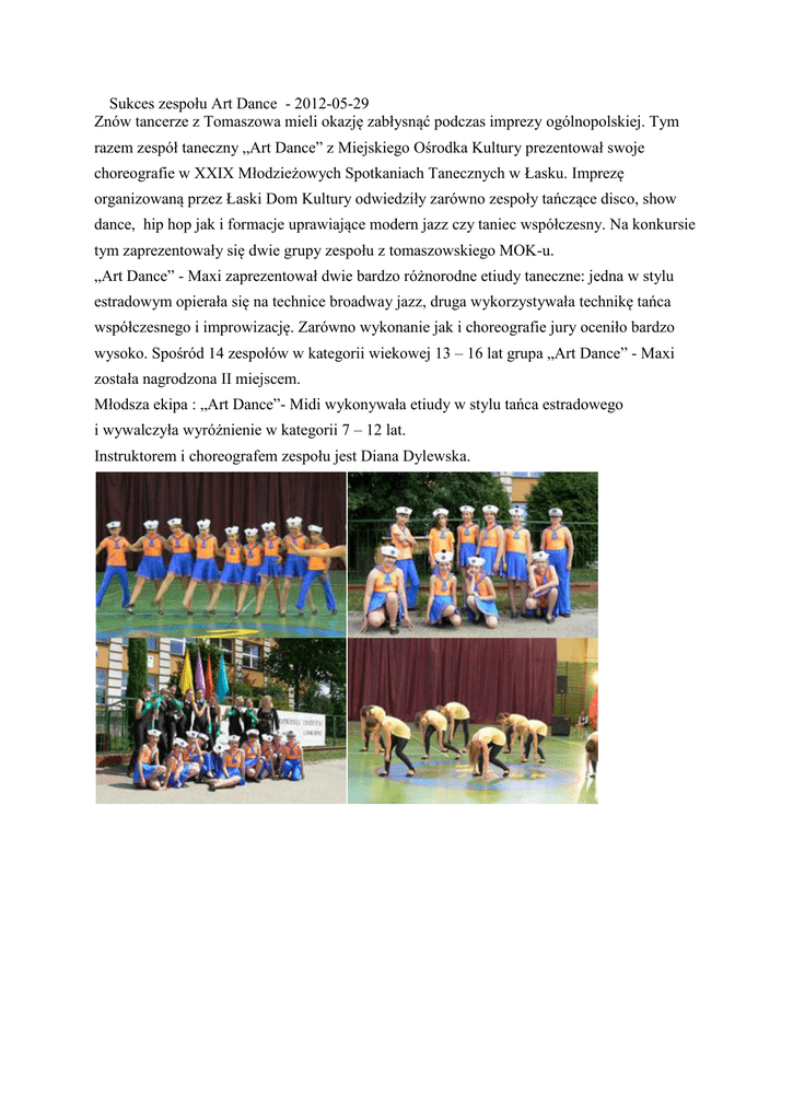 Sukces zespołu Art Dance - 2012-05-29 Znów tancerze z Tomaszowa mieli okazję zabłysnąć podczas imprezy ogólnopolskiej. Tym razem zespół taneczny „Art Dance” z Miejskiego Ośrodka Kultury prezentował swoje choreografie w XXIX Młodzieżowych Spotkaniach Tanecznych w Łasku. Imprezę organizowaną przez Łaski Dom Kultury odwiedziły zarówno zespoły tańczące disco, show dance, hip hop jak i formacje uprawiające modern jazz czy taniec współczesny. Na konkursie tym zaprezentowały się dwie grupy zespołu z tomaszowskiego MOK-u. „Art Dance” - Maxi zaprezentował dwie bardzo różnorodne etiudy taneczne: jedna w stylu estradowym opierała się na technice broadway jazz, druga wykorzystywała technikę tańca współczesnego i improwizację. Zarówno wykonanie jak i choreografie jury oceniło bardzo wysoko. Spośród 14 zespołów w kategorii wiekowej 13 – 16 lat grupa „Art Dance” - Maxi została nagrodzona II miejscem. Młodsza ekipa : „Art Dance”- Midi wykonywała etiudy w stylu tańca estradowego i wywalczyła wyróżnienie w kategorii 7 – 12 lat. Instruktorem i choreografem zespołu jest Diana Dylewska.