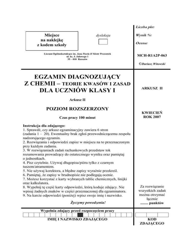 Liczba pkt: iejsce Miejsce nana naklejkę naklejkę z zkodem szkoły kodem szkoły dysleksja Wynik %: Ocena: Liceum Ogólnokształcące im. Jana Pawła II Sióstr Prezentek ul. ks. J. Jałowego 1 35 – 010 Rzeszów MCH-R1A2P-063 ©Dariusz Witowski EGZAMIN DIAGNOZUJĄCY Z CHEMII – TEORIE KWASÓW I ZASAD DLA UCZNIÓW KLASY I ARKUSZ II Arkusz II POZIOM ROZSZERZONY Czas pracy 100 minut Instrukcja dla zdającego: 1. Sprawdź, czy arkusz egzaminacyjny zawiera 6 stron (zadania 1 – 20). Ewentualny brak zgłoś przewodniczącemu zespołu nadzorującego egzamin. 2. Rozwiązania i odpowiedzi zapisz w miejscu na to przeznaczonym przy każdym zadaniu. 3. W rozwiązaniach zadań rachunkowych przedstaw tok rozumowania prowadzący do ostatecznego wyniku oraz pamiętaj o jednostkach. 4. Pisz czytelnie. Używaj długopisu/pióra tylko z czarnym tuszem/atramentem. 5. Nie używaj korektora, a błędne zapisy wyraźnie przekreśl. 6. Pamiętaj, że zapisy w brudnopisie nie podlegają ocenie. 7. Możesz korzystać z karty wybranych tablic chemicznych, linijki oraz kalkulatora. 8. Wypełnij tę część karty odpowiedzi, którą koduje zdający. Nie wpisuj żadnych znaków w części przeznaczonej dla egzaminatora. 9. Na karcie odpowiedzi (poniżej) wpisz swoje imię i nazwisko. Życzymy powodzenia! KWIECIEŃ ROK 2007 Za rozwiązanie wszystkich zadań można otrzymać łącznie ........ punktów Wypełnia zdający przed rozpoczęciem pracy IMIĘ I NAZWISKO ZDAJĄCEGO KOD ZDAJĄCEGO Zadanie 1 (4 pkt.) Dane są cząstki: SO32- i HS- . Zaklasyfikuj je do kwasów lub zasad według teorii Brönsteda. Uzasadnij swoją decyzję pisząc odpowiednie równania reakcji. SO3 2HS- - ......................................................... ......................................................... Równania reakcji: ............................................................................................................................... Zadanie 2 (1 pkt.) Amoniak i aminy wg teorii Brönsteda są zasadami, bo przyjmuje proton zgonie z reakcją: CH3NH2 + H2O → CH3NH3+ + OHWyjaśnij, dlaczego amoniak może przyjąć proton? .................................................................................................................................................................... Zadanie 3 (2 pkt.) Poniżej przedstawiono dwa równania reakcji: I. H2O + HCO3- → H3O+ + CO32II. H2O + NH3 → NH4+ + OH- Wpisz w odpowiednie miejsca do tabeli wzory dwóch sprzężonych par kwas – zasada (według protonowej teorii Brönsteda) dla każdego równania reakcji przebiegającej według ogólnego schematu: ┌—————————————┐ kwas1 + zasada2 → kwas2 + zasada1 └————┘ kwas1 – zasada1 Równanie reakcji I kwas2 – zasada2 kwas1 – zasada1 Równanie reakcji II kwas2– zasada2 Zadanie 4 (2 pkt.) Jaką rolę wg teorii Brönsteda-Lowry’ego pełni woda w reakcji hydrolizy fluorku sodu? Zapisz tę reakcję w formie jonowej skróconej. .................................................................................................................................................................... Zadanie 5 (3 pkt.) Zgodnie z teorią Brönsteda-Lowry’ego kwasami są związki oddające protony (jony wodorowe), a zasadami związki przyłączające protony (jony wodorowe). Zgodnie z tą teorią woda w reakcjach przedstawionych równaniami: I. H2O + NH3 → NH4+ + OHII. H2O + HI → H3O- + IIII. H2O + SO32- → HCO3- + OH- zachowuje się jak: I II III Zadanie 6 (2 pkt.) W których z podanych niżej równań reakcji proteolitycznych woda zachowuje się jak kwas, a w których jak zasada w ujęciu teorii Brönsteda - Lowry’ego: a. SO32- + H2O → HSO3- + OHb. HSO4- + H2O → H3O+ + SO4 2c. HCOO- + H2O → COOH + OHd. H2S + H2O → H3O+ + HSe. NH3 + H2O → NH4+ + OHWpisz swoje wnioski do tabeli: kwas zasada Zadanie 7 (3 pkt.) Poniżej podano kilkanaście związków chemicznych lub jonów. Które z nich zaliczysz do kwasów Brönsteda? Zn(NH3)42+, NH3, H2O, HS-, HBr, CsOH, CO32-, SO32-, NH4+, H2PO42-, HCN, HBO32.................................................................................................................................................................... Zadanie 8 (4 pkt.) Zgodnie z protonową teorią kwasów i zasad Brönsteda kwas jest donorem protonów a zasada ich akceptorem. Wybierz spośród poniższych zdanie prawdziwe: Dokończ poniższe zdania wpisując w wolne miejsca słowa: „kwasem” lub „zasadą”. 1) Jon H3O+ jest wyłącznie......................................................................................................................... 2) Jon Br- jest wyłącznie ............................................................................................................................ 3) Jon BrO3- jest wyłącznie......................................................................................................................... 4) Jon CN- jest wyłącznie .......................................................................................................................... Zadanie 9 (3 pkt.) Dopisz drugą formę tak, aby powstała sprzężona według Brönsteda para: kwas — zasada: 1) Cl- — ....................................................................... 2) H3O+ — ..................................................................... 3) HS- — ........................................................................ Zadanie 10 (2 pkt.) Wskaż kwas Lewisa, który nie jest kwasem według Arheniusa ani według Brönsteda: A. CN- B.C2H5OH2+ C. H3O+ D.Cu2+ Zadanie 11 (3 pkt.) Wypisz poprawnie, która z substancji może występować zarówno jako kwas i jako zasada Brönsteda: Cu(NH3)42+, HBO32-, HAsO42-, KOH, HCO3-, HSO3-, NH4+, NH3, H2O, HS-, HI, H2PO42-, CN-, .................................................................................................................................................................... Z