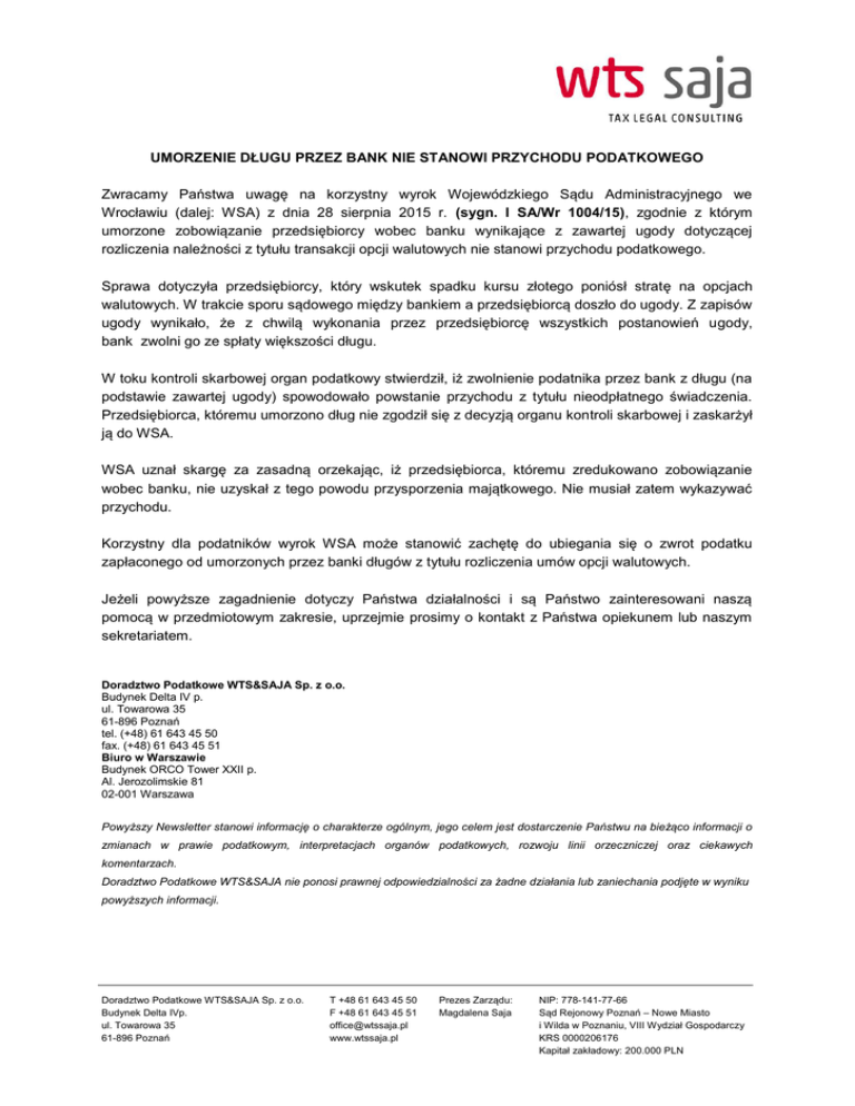 UMORZENIE DŁUGU PRZEZ BANK NIE STANOWI PRZYCHODU PODATKOWEGO Zwracamy Państwa uwagę na korzystny wyrok Wojewódzkiego Sądu Administracyjnego we Wrocławiu (dalej: WSA) z dnia 28 sierpnia 2015 r. (sygn. I SA/Wr 1004/15), zgodnie z którym umorzone zobowiązanie przedsiębiorcy wobec banku wynikające z zawartej ugody dotyczącej rozliczenia należności z tytułu transakcji opcji walutowych nie stanowi przychodu podatkowego. Sprawa dotyczyła przedsiębiorcy, który wskutek spadku kursu złotego poniósł stratę na opcjach walutowych. W trakcie sporu sądowego między bankiem a przedsiębiorcą doszło do ugody. Z zapisów ugody wynikało, że z chwilą wykonania przez przedsiębiorcę wszystkich postanowień ugody, bank zwolni go ze spłaty większości długu. W toku kontroli skarbowej organ podatkowy stwierdził, iż zwolnienie podatnika przez bank z długu (na podstawie zawartej ugody) spowodowało powstanie przychodu z tytułu nieodpłatnego świadczenia. Przedsiębiorca, któremu umorzono dług nie zgodził się z decyzją organu kontroli skarbowej i zaskarżył ją do WSA. WSA uznał skargę za zasadną orzekając, iż przedsiębiorca, któremu zredukowano zobowiązanie wobec banku, nie uzyskał z tego powodu przysporzenia majątkowego. Nie musiał zatem wykazywać przychodu. Korzystny dla podatników wyrok WSA może stanowić zachętę do ubiegania się o zwrot podatku zapłaconego od umorzonych przez banki długów z tytułu rozliczenia umów opcji walutowych. Jeżeli powyższe zagadnienie dotyczy Państwa działalności i są Państwo zainteresowani naszą pomocą w przedmiotowym zakresie, uprzejmie prosimy o kontakt z Państwa opiekunem lub naszym sekretariatem. Doradztwo Podatkowe WTS&SAJA Sp. z o.o. Budynek Delta IV p. ul. Towarowa 35 61-896 Poznań tel. (+48) 61 643 45 50 fax. (+48) 61 643 45 51 Biuro w Warszawie Budynek ORCO Tower XXII p. Al. Jerozolimskie 81 02-001 Warszawa Powyższy Newsletter stanowi informację o charakterze ogólnym, jego celem jest dostarczenie Państwu na bieżąco informacji o zmianach w prawie podatkowym, interpretacjach organów podatkowych, rozwoju linii orzeczniczej oraz ciekawych komentarzach. Doradztwo Podatkowe WTS&SAJA nie ponosi prawnej odpowiedzialności za żadne działania lub zaniechania podjęte w wyniku powyższych informacji. Doradztwo Podatkowe WTS&SAJA Sp. z o.o. Budynek Delta IVp. ul. Towarowa 35 61-896 Poznań T +48 61 643 45 50 F +48 61 643 45 51 [email protected] www.wtssaja.pl Prezes Zarządu: Magdalena Saja NIP: 778-141-77-66 Sąd Rejonowy Poznań – Nowe Miasto i Wilda w Poznaniu, VIII Wydział Gospodarczy KRS 0000206176 Kapitał zakładowy: 200.000 PLN