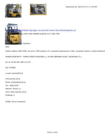 Stworzono dn. 2012-07-27, nr 121793 Oferta z działu Giełda Sprzętu na stronie www.forumtransportu.pl Model: Wózek widłowy GPW 3200 ZREMB GLIWICE 3.2T 1993 TANI Cena: 9900 Rocznik: 1993 Lokalizacja: Oborniki-Uścikowo Opis: Wózek widłowy GPW 3200, rok prod. 1993 udźwig 3.2T, wysokość podnoszenia 3.30m, wysokość masztu w stanie złożonym ADRESY/KONTAKTY: POMAX WÓZKI WIDŁOWE s.c. 64-600 OBORNIKI WLKP. UŚCIKOWO 21 c tel. 61 29 66 382, 508 123 237 GG 1719683 e-mail: [email protected] www.pomax.22.pl Email: [email protected] Tel.: 508123237 Oferent: Pomax s.c. www: http://pomax.22.pl Przebieg: 0 Źródło: forum transportu Strona 1/{nb}