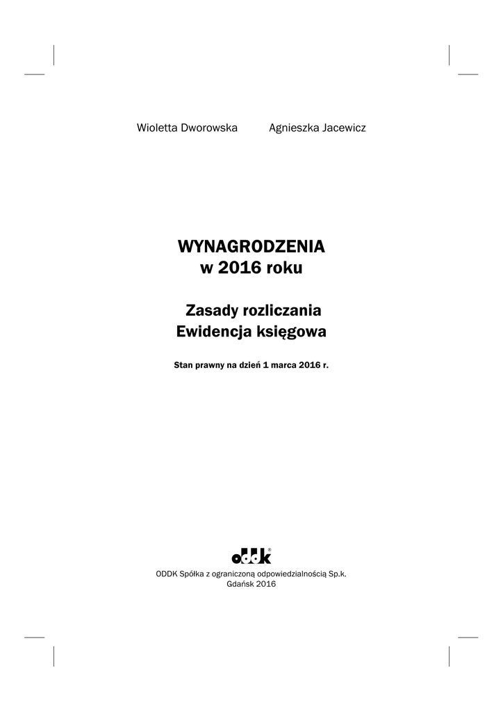 Wioletta Dworowska Agnieszka Jacewicz WYNAGRODZENIA w 2016 roku Zasady rozliczania Ewidencja księgowa Stan prawny na dzień 1 marca 2016 r. ODDK Spółka z ograniczoną odpowiedzialnością Sp.k. Gdańsk 2016 Spis treści Wykaz skrótów . . . . . . . . . . . . . . . . . . . . . . . . . . . . . . . . . . . . . 7 Rozdział I Zagadnienia wprowadzające . . . . . . . . . . . . . . . . . . . . . . . . . . . . . 9 1. Stosunek pracy – jego istota, rodzaje umów o pracę . . . . . . . . . . . . . . . . 9 2. Czas pracy i jego ewidencja . . . . . . . . . . . . . . . . . . . . . . . . . . . . 14 3. Regulamin pracy, regulamin wynagradzania – jako podstawa systemu wynagrodzeń w firmie . . . . . . . . . . . . . . . . . . . . . . . . . . . . . . . 20 3.1. Regulamin pracy . . . . . . . . . . . . . . . . . . . . . . . . . . . . . . . 20 3.2. Regulamin wynagradzania . . . . . . . . . . . . . . . . . . . . . . . . . . 21 4. Praktyka absolwencka . . . . . . . . . . . . . . . . . . . . . . . . . . . . . . . 22 Rozdział II Wynagrodzenie ze stosunku pracy . . . . . . . . . . . . . . . . . . . . . . . . . . 27 1. Zagadnienia wstępne . . . . . . . . . . . . . . . . . . . . . . . 2. Wynagrodzenie zasadnicze . . . . . . . . . . . . . . . . . . . . 3. Wynagrodzenie dodatkowe . . . . . . . . . . . . . . . . . . . . 3.1. Dodatek za pracę w godzinach nadliczbowych . . . . . . . 3.2. Dodatek za pracę w porze nocnej . . . . . . . . . . . . . . 3.3. Dodatek za czas dyŜuru. . . . . . . . . . . . . . . . . . . . 3.4. Premie, nagrody. . . . . . . . . . . . . . . . . . . . . . . . 3.5. Dodatki wyrównawcze . . . . . . . . . . . . . . . . . . . . 3.6. Dodatek za rozłąkę . . . . . . . . . . . . . . . . . . . . . . 3.7. Pozostałe dodatki . . . . . . . . . . . . . . . . . . . . . . . 3.8. Wypłata z zysku . . . . . . . . . . . . . . . . . . . . . . . 4. Odprawy, odszkodowania . . . . . . . . . . . . . . . . . . . . . 4.1. Odprawa rentowa i emerytalna. . . . . . . . . . . . . . . . 4.2. Odprawa pośmiertna . . . . . . . . . . . . . . . . . . . . . 4.3. Odprawa z tytułu rozwiązania umowy o pracę z przyczyn niedotyczących pracownika . . . . . . . . . . . . . . . . . 4.4. Ustalanie wysokości odpraw . . . . . . . . . . . . . . . . . 4.5. Inne odszkodowania . . . . . . . . . . . . . . . . . . . . . 5. Dokumentowanie wynagrodzeń . . . . . . . . . . . . . . . . . . 5.1. Karta pracy . . . . . . . . . . . . . . . . . . . . . . . . . . 5.2. Karta przychodów . . . . . . . . . . . . . . . . . . . . . . 5.3. Lista płac . . . . . . . . . . . . . . . . . . . . . . . . . . . . . . . . . . . . . . . . . . . . . . . . . . . . . . . . . . . . . . . . . . . . . . . . . . . . . . . . . . . . . . . . . . . . . . . . . . . . . . . . . . . . . . . . . . . . . . . . . . . . . . . . . . . . . . . . . . . 27 34 36 37 46 48 50 50 53 53 53 54 54 55 . . . . . . . . . . . . . . . . . . . . . . . . . . . . . . . . . . . . . . . . . . . . . . . . . . . . . . . . 56 58 59 62 62 62 66 Rozdział III Wynagrodzenie za czas niewykonywania pracy . . . . . . . . . . . . . . . . . . . 71 1. Urlop wypoczynkowy. . . . . . . . . 1.1. Pierwszy urlop wypoczynkowy 1.2. Urlop w kolejnych latach pracy 1.3. Urlop na Ŝądanie pracownika . . . . . . . . . . . . . . . . . . . . . . . . . . . . . . . . . . . . . . . . . . . . . . . . . . . . . . . . . . . . . . . . . . . . . . . . . . . . . . . . . . . . . . . . . . . . . 71 74 76 79 3 Spis treści 2. 3. 4. 5. 6. 7. 1.4. Urlop wypoczynkowy po urlopie wychowawczym . . . . . . . . . . . . . 80 Zasady udzielania urlopów . . . . . . . . . . . . . . . . . . . . . . . . . . . . 81 Wynagrodzenie za czas urlopu . . . . . . . . . . . . . . . . . . . . . . . . . . 83 Ekwiwalent za niewykorzystany urlop . . . . . . . . . . . . . . . . . . . . . . 88 Niezdolność do pracy – wynagrodzenie chorobowe . . . . . . . . . . . . . . . 93 Wynagrodzenie za przepracowaną część miesiąca . . . . . . . . . . . . . . . 105 Niewykonywanie pracy a prawo do wynagrodzenia . . . . . . . . . . . . . . 107 7.1. Przerwy w czasie pracy . . . . . . . . . . . . . . . . . . . . . . . . . . . 107 7.2. DyŜur. . . . . . . . . . . . . . . . . . . . . . . . . . . . . . . . . . . . . 109 7.3. Przestój. . . . . . . . . . . . . . . . . . . . . . . . . . . . . . . . . . . . 110 7.4. Powstrzymanie się od pracy na skutek zagroŜenia . . . . . . . . . . . . . 111 7.5. Badania lekarskie . . . . . . . . . . . . . . . . . . . . . . . . . . . . . . 112 7.6. Zwolnienie na poszukiwanie pracy. . . . . . . . . . . . . . . . . . . . . 114 7.7. Zwolnienie z obowiązku wykonywania pracy . . . . . . . . . . . . . . . 114 Rozdział IV Obowiązkowe obciąŜenia wynagrodzeń . . . . . . . . . . . . . . . . . . . . . . 117 1. 2. 3. 4. 5. Ubezpieczenia społeczne . . . . . . . . . . . . . . . . . . . . . . . . Ubezpieczenie zdrowotne . . . . . . . . . . . . . . . . . . . . . . . Fundusze pozaubezpieczeniowe . . . . . . . . . . . . . . . . . . . . Podatek dochodowy od osób fizycznych . . . . . . . . . . . . . . . Obowiązkowe obciąŜenia wynagrodzeń – sposób ujęcia w liście płac . . . . . . . . . . . . . . . . . . . . . . . . . 117 124 128 139 147 Rozdział V Potrącenia z wynagrodzenia . . . . . . . . . . . . . . . . . . . . . . . . . . . . 151 1. Potrącenia niewymagające zgody pracownika. . . . . . . 1.1. Potrącenia z wynagrodzenia za pracę. . . . . . . . . 1.2. Potrącenia z zasiłków z ubezpieczenia społecznego 2. Potrącenia dobrowolne . . . . . . . . . . . . . . . . . . . . . . . . . . . . . . . . . . . . . . . . . . . . . . . . . . . . . . . . . . . . . . . 153 153 162 163 Rozdział VI Obowiązki pracodawcy związane z rozliczaniem i wypłacaniem wynagrodzeń . . . . . . . . . . . . . . . . . . . . . . . . . . . . . . . . . . . . . 165 1. Obowiązki pracodawcy wobec urzędu skarbowego . . . . . . . . . . . . 1.1. Obowiązki jako płatnika i inkasenta . . . . . . . . . . . . . . . . . 1.2. Miesięczne i roczne rozliczenia z urzędem skarbowym .