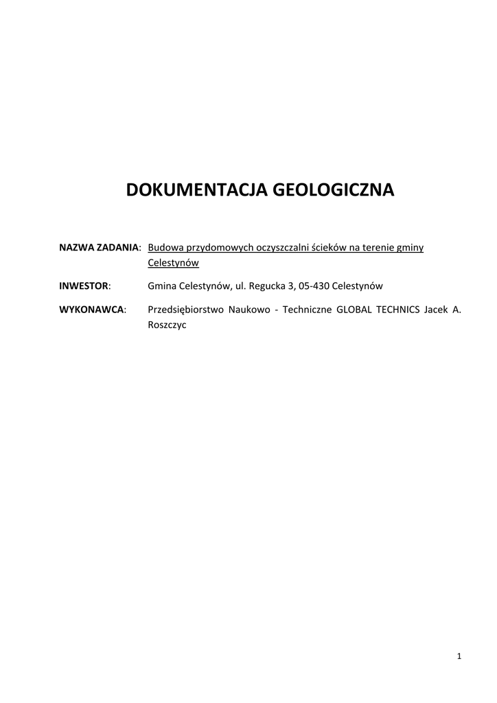 DOKUMENTACJA GEOLOGICZNA NAZWA ZADANIA: Budowa przydomowych oczyszczalni ścieków na terenie gminy Celestynów INWESTOR: Gmina Celestynów, ul. Regucka 3, 05-430 Celestynów WYKONAWCA: Przedsiębiorstwo Naukowo - Techniczne GLOBAL TECHNICS Jacek A. Roszczyc 1 Spis treści Spis treści ............................................................................................................................................. 2 I. Charakterystyka planowanej inwestycji .................................................................................... 3 II. Zakres wykonanych prac geologicznych .................................................................................... 3 III. Charakterystyka terenu badań ............................................................................................... 4 IV. Geotechniczne warunki posadowienia .................................................................................. 7 V. Wnioski ......................................................................................................................................... 8 VI. Załączniki .................................................................................................................................. 8 2 I. Charakterystyka planowanej inwestycji Administracyjnie teren badań - Gmina Celestynów Gmina Celestynów położona jest w środkowej części powiatu otwockiego, w odległości ok. 30km od Warszawy. Graniczy ze wszystkimi gminami powiatu, za wyjątkiem gminy miejsko – wiejskiej Józefów. Celem zadania jest rozpoznanie warunków gruntowo - wodnych dla projektowanych lokalizacji przydomowych oczyszczalni ścieków. II. Zakres wykonanych prac geologicznych Otwory badawcze wyznaczono w terenie w punktach wskazanych przez Inwestora na podstawie mapy sytuacyjno- wysokościowej w skali 1 : 1 000 i rozpoznania terenu. Opracowanie wykonano na podstawie wizji lokalnej , określono profile analityczne otworów, parametr wiodący geotechniczny gruntów oraz głębokość wystąpień wód gruntowych. Wiercenia wykonano w czerwcu 2015 r. Wykonano po 2 odwierty badawcze na każdej działce do głębokości 4 m. Otwory wykonano systemem okrętnym przy użyciu oczkowego wiertła Edelmana o średnicy 70 mm. Otwory po opróbowaniu zlikwidowano. Prowadzenie badań zgodnie z w/w zasadami nie pogorszyło stanu środowiska. 3 III. Charakterystyka terenu badań A. Lokalizacja Projektowane przydomowe oczyszczalnie ścieków zlokalizowane są na terenie gminy Celestynów. Opracowanie obejmuje następujące miejscowości: Lp. Miejscowość Działka 1 Dyzin 151 2 Jatne 107 3 Jatne 121/3, 121/4 4 Lasek 113/2 5 Ostrów 147/3 6 Ostrów 26 7 Ostrów 211 8 Podbiel 218 9 Podbiel 224/2 10 Podbiel 234 11 Podbiel 398 12 Podbiel 402 13 Podbiel 424/2 14 Podbiel 680/1 15 Podbiel 692/2 16 Podbiel 1435,1428 17 Podbiel 1436 18 Podbiel 2367/2 19 Podbiel 2370 4 B. 20 Podbiel 3053/3 21 Ponurzyca 1225 22 Regut 1189/2 23 Regut 1207/1 24 Regut 1469/1, 1469/2 25 Zabieżki 47 26 Zabieżki 95 27 Zabieżki 102 28 Zabieżki 119 29 Zabierzki 185 30 Zabieżki 220 Geologia Obszar gminy Celestynów charakteryzuje się średnio urozmaiconą powierzchnią terenu. Zgodnie z regionalizacją fizyczno- geograficzną według J. Kondrackiego (1998) gmina położona jest w obrębie dwóch bardzo różnych mezoregionów Niziny Środkowomazowieckiej: Doliny Środkowej Wisły i Równiny Garwolińskiej. Każdy z nich kształtowany był przez inny zespół procesów geologicznych. Granica pomiędzy nimi wyznaczana jest przez zbocze doliny i przebiega przez miejscowości: Tabor i Podbiel Formy terenu na omawianym obszarze powstały głównie w wyniku procesów denudacyjnych i fluwialnych. W wyniku zatarcia form glacjalnych, w krajobrazie dominują płaskie równiny denudacyjne i tarasy rzeczne urozmaicone występowaniem wydm. Kulminacje wydmowych wałów w okolicach Celestynowa i Zabieżek osiągają wysokość 150 –155 m n.p.m. Podłożony we wschodniej części powiatu mezoregion Równiny Garwolińskiej uformował się w okresie recesji zlodowaceń środkowopolskich. Stanowi on silnie zdenudowaną i zerodowaną wysoczyznę polodowcową zlodowacenia Warty (stadiału mazowieckopodlaskiego zlodowacenia środkowopolskiego). Od chwili recesji tego lądolodu powierzchnia akumulacyjna wysoczyzny podlegała prawie wyłącznie procesom niszczenia. Mezoregion Doliny Środkowej Wisły ukształtował się w plejstocenie głównie w wyniku powtarzających się cyklicznie procesów erozji i akumulacji rzecznej. Szeroka i głęboka dolina pra-Wisły utworzona w interglacjale mazowieckim (Wielkim), wypełniona osadami glacjalnymi w trakcie zlodowaceń środkowopolskich (Odry i Warty), w okresie interglacjału eemskiego odtworzona została przez rzekę mniej więcej w tym samym miejscu. Dzisiejszy kształt dolina Wisły w obrębie gminy Celestynów uzyskała w okresie ostatniego zlodowacenia (Wisły). Utworzyły się wówczas nadzalewowe tarasy plejstoceńskie. Granica między obu starszymi tarasami plejstoceńskimi jest bardzo słabo czytelna w terenie. Stosunkowo płaską powierzchnię obu wyższych tarasów plejstoceńskich urozmaicają wydmy osiągające wysokość do 22 m, powstałe u schyłku ostatniego zlodowacenia - stąd inna, wspólna nazwa tych tarasów- taras wydmowy. Najniższy z tarasów plejstoceńskich- praski - powstały u schyłku zlodowacenia wznosi się 6-10 m nad poziom Wisły. Dolina Środkowej Wisły obejmuje stosunkowo niewielki fragment gminy. Jest to obszar położony w części 5 południowo-zachodniej, w obrębie terenu cennego pod względem przyrodniczym, jaki stanowi zespół bagienno- łąkowy torfowiska Całowanie. C. Hydrografia Na terenie gminy Celestynów użytkowe poziomy wodonośne występują w utworach czwartorzędowych i trzeciorzędowych. Wody podziemne w utworach czwartorzędowych W utworach czwartorzędowych wody występują w obrębie dwóch struktur hydrogeologicznych, różniących się genezą, 