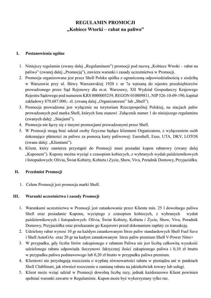 REGULAMIN PROMOCJI „Kobiece Wtorki – rabat na paliwo” I. Postanowienia ogólne 1. Niniejszy regulamin (zwany dalej „Regulaminem”) promocji pod nazwą „Kobiece Wtroki – rabat na paliwo” (zwanej dalej „Promocją”), zawiera warunki i zasady uczestnictwa w Promocji. 2. Promocja organizowana jest przez Shell Polska spółka z ograniczoną odpowiedzialnością z siedzibą w Warszawie przy ul. Bitwy Warszawskiej 1920 r. nr 7a wpisaną do rejestru przedsiębiorców prowadzonego przez Sąd Rejonowy dla m.st. Warszawy, XII Wydział Gospodarczy Krajowego Rejestru Sądowego pod numerem KRS 0000005239, REGON 010809811, NIP 526-10-09-190, kapitał zakładowy 870.687.000,- zł. (zwaną dalej „Organizatorem” lub „Shell”). 3. Promocja prowadzona jest wyłącznie na terytorium Rzeczpospolitej Polskiej, na stacjach paliw prowadzonych pod marka Shell, których lista stanowi Załącznik numer 1 do niniejszego regulaminu (zwanych dalej: „Stacjami”). 4. Promocja nie łączy się z innymi promocjami prowadzonymi przez Shell. 5. W Promocji mogą brać udział osoby fizyczne będące klientami Organizatora, z wyłączeniem osób dokonujące płatności za paliwo za pomocą karty paliwowej: Euroshell, Esso, UTA, DKV, LOTOS (zwane dalej: „Klientami”). 6. Klient, który zamierza przystąpić do Promocji musi posiadać kupon rabatowy (zwany dalej „Kuponem”). Kupony można wyciąć z czasopism kobiecych, z wybranych wydań październikowych i listopadowych: Olivia, Świat Kobiety, Kobieta i Zycie, Show, Viva, Poradnik Domowy, Przyjaciółka. II. Przedmiot Promocji 1. Celem Promocji jest promocja marki Shell. III. Warunki uczestnictwa i zasady Promocji 1. Warunkami uczestnictwa w Promocji jest zatankowanie przez Klienta min. 25 l dowolnego paliwa Shell oraz posiadanie Kuponu, wyciętego z czasopism kobiecych, z wybranych wydań październikowych i listopadowych: Olivia, Świat Kobiety, Kobieta i Życie, Show, Viva, Poradnik Domowy, Przyjaciółka oraz przekazanie go Kasjerowi przed dokonaniem zapłaty za transakcję. 2. Udzielony rabat wynosi 10 gr na każdym zatankowanym litrze paliw standardowych Shell Fuel Save i Shell AutoGAs oraz 20 gr na kadym zatankowanym litrze paliw premium Shell V-Power Nitro+ 3. W przypadku, gdy liczba litrów zakupionego z rabatem Paliwa nie jest liczbą całkowitą wysokość udzielonego rabatu odpowiada iloczynowi faktycznej ilości zakupionego paliwa i 0,10 zł brutto w przypadku paliwa podstawowego lub 0,20 zł brutto w przypadku paliwa premium. 4. Klientowi nie przysługują roszczenia o wypłatę równowartości rabatu w pieniądzu ani w punktach Shell ClubSmart, jak również roszczenie o zamianę rabatu na jakiekolwiek towary lub usługi. 5. Klient może wziąć udział w Promocji dowolną liczbę razy, jednak każdorazowo Klient powinien spełniać warunki zawarte w Regulaminie. Kupon może być wykorzystany tylko raz. 6. Nie ma możliwości łączenia Kuponów Rabatowych z innymi kuponami promocyjnymi w celu zwielokrotnienia wartości Rabatu oraz łączenie Kuponów Rabatowych z innymi promocjami dostępnymi na Stacji Paliw. 7. Za paliwa Shell zatankowane z rabatem nie są przyznawane Punkty Shell ClubSmart w liczbie standardowo określonej za tego typu transakcje w okresie poza promocyjnym. Za transakcję promocyjną dokonaną z wykorzystaniem Kuponu, Klient, będący jednocześnie członkiem klubu Shell ClubSmart, otrzyma 100 punktów, IV. Czas trwania Promocji 1. Promocja obowiązuje jedynie we wtorki w okresie od 13.09.2016 r. do 25.10.2016 r. Rozpoczyna się we wtorek 13.09.2016 r. i jest ważna w każdy wtorek w czasie trwania Promocji tj: 13, 20, 27 września oraz 4, 11, 18, 25 października. V. Postępowanie reklamacyjne Wszelkie reklamacje związane z przebiegiem Promocji mogą być zgłaszane Organizatorowi na adres: Biuro Obsługi Klienta, Shell Polska Sp. z o.o., Oddział w Zabierzowie, ul. Krakowska 280, 32-080 Zabierzów z dopiskiem: ”Kobiece Wtorki – rabat na paliwo” pod nr tel.: 800 080 014, infolinia czynna od poniedziałku do piątku od 8:00 do 17:00 albo za pośrednictwem poczty elektronicznej na adres email: [email protected], wraz z opisem reklamacji. Organizator ustosunkuje się do reklamacji zgłoszonej przez Uczestnika Promocji nie później niż w ciągu 14 dni od dnia jej zgłoszenia Organizatorowi, zgodnie z ust. 1 powyżej. VI. Postanowienia końcowe 1. Przystępując do Promocji uczestnik wyraża zgodę na treść Regulaminu i zobowiązuje się przestrzegać jego postanowień. 2. Regulamin jest dostępny do wglądu w siedzibie Shell, na Stacjach oraz na stronie internetowej www.shell.pl 3. Rabat przyznawany jest tylko na podstawie oryginalnego, nieuszkodzonego Kuponu. 4. Postanowienia Regulaminu są podstawą prowadzenia Promocji, a ich interpretacja powinna być dokonywana zgodnie z powszechnie obowiązującymi przepisami prawa. 5. Wszelkie informacje o Promocji dostępne w materiałach reklamowych mają jedynie charakter informacyjny. 6. W zakresie nieuregulowanym w niniejszym regulaminie zastosowanie mają powszechnie obowiązujące przepisy prawa.