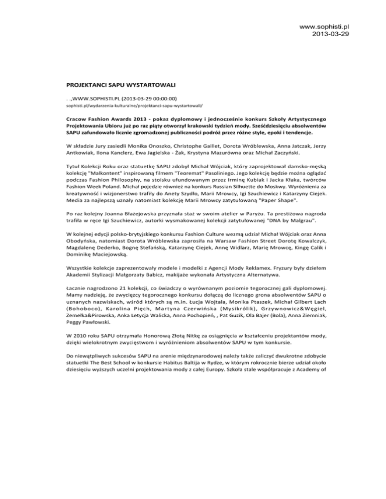 www.sophisti.pl 2013-03-29 PROJEKTANCI SAPU WYSTARTOWALI . .,WWW.SOPHISTI.PL (2013-03-29 00:00:00) sophisti.pl/wydarzenia-kulturalne/projektanci-sapu-wystartowali/ Cracow Fashion Awards 2013 - pokaz dyplomowy i jednocześnie konkurs Szkoły Artystycznego Projektowania Ubioru już po raz piąty otworzył krakowski tydzień mody. Sześćdziesięciu absolwentów SAPU zafundowało licznie zgromadzonej publiczności podróż przez różne style, epoki i tendencje. W składzie Jury zasiedli Monika Onoszko, Christophe Gaillet, Dorota Wróblewska, Anna Jatczak, Jerzy Antkowiak, Ilona Kanclerz, Ewa Jagielska - Żak, Krystyna Mazurówna oraz Michał Zaczyński. Tytuł Kolekcji Roku oraz statuetkę SAPU zdobył Michał Wójciak, który zaprojektował damsko-męską kolekcję "Malkontent" inspirowaną filmem "Teoremat" Pasoliniego. Jego kolekcję będzie można oglądać podczas Fashion Philosophy, na stoisku ufundowanym przez Irminę Kubiak i Jacka Kłaka, twórców Fashion Week Poland. Michał pojedzie również na konkurs Russian Silhuette do Moskwy. Wyróżnienia za kreatywność i wizjonerstwo trafiły do Anety Szydło, Marii Mrowcy, Igi Szuchiewicz i Katarzyny Ciejek. Media za najlepszą uznały natomiast kolekcję Marii Mrowcy zatytułowaną "Paper Shape". Po raz kolejny Joanna Błażejowska przyznała staż w swoim atelier w Paryżu. Ta prestiżowa nagroda trafiła w ręce Igi Szuchiewicz, autorki wysmakowanej kolekcji zatytułowanej "DNA by Malgrau". W kolejnej edycji polsko-brytyjskiego konkursu Fashion Culture wezmą udział Michał Wójciak oraz Anna Obodyńska, natomiast Dorota Wróblewska zaprosiła na Warsaw Fashion Street Dorotę Kowalczyk, Magdalenę Dederko, Bognę Stefańską, Katarzynę Ciejek, Annę Widlarz, Marię Mrowcę, Kingę Calik i Dominikę Maciejowską. Wszystkie kolekcje zaprezentowały modele i modelki z Agencji Mody Reklamex. Fryzury były dziełem Akademii Stylizacji Małgorzaty Babicz, makijaże wykonała Artystyczna Alternatywa. Łacznie nagrodzono 21 kolekcji, co świadczy o wyrównanym poziomie tegorocznej gali dyplomowej. Mamy nadzieję, że zwycięzcy tegorocznego konkursu dołączą do licznego grona absolwentów SAPU o uznanych nazwiskach, wśród których są m.in. Łucja Wojtala, Monika Ptaszek, Michał Gilbert Lach (Bohoboco), Karolina Pięch, Martyna Czerwińska (Mysikrólik), Grzywnowicz&Węgiel, Zemełka&Pirowska, Anka Letycja Walicka, Anna Pochopień, , Pat Guzik, Ola Bajer (Bola), Anna Ziemniak, Peggy Pawłowski. W 2010 roku SAPU otrzymała Honorową Złotą Nitkę za osiągnięcia w kształceniu projektantów mody, dzięki wielokrotnym zwycięstwom i wyróżnieniom absolwentów SAPU w tym konkursie. Do niewątpliwych sukcesów SAPU na arenie międzynarodowej należy także zaliczyć dwukrotne zdobycie statuetki The Best School w konkursie Habitus Baltija w Rydze, w którym rokrocznie bierze udział około dziesięciu wyższych uczelni projektowania mody z całej Europy. Szkoła stale współpracuje z Academy of www.sophisti.pl 2013-03-29 Design and Haute Couture w Walencji oraz ze Szkołą Projektowania Mody "Fahmoda" w Hannoverze, w których słuchacze szkoły odbywają nawet półroczne staże. Absolwenci i studenci szkoły mieli również okazję odbyć praktyki i staże w atelier Johna Galliano, Jenny O (Osterhoudt), Balenciagi, Alexandra McQuenna i Dawida Tomaszewskiego w Berlinie. Od kilku lat w ramach programu Leonardo da Vinci na wymianę młodzieżową przyjeżdża do SAPU kilkunastu studentów z Niemiec i Słowacji. Międzynarodową atmosferę w szkole od lat stwarza także liczna grupa studentów zagranicznych, m.in. z : USA, Kanady, Rosji, Ukrainy, Mołdawii, Gruzji, Grecji, Słowacji, Austrii i Niemiec, którzy uczyli się lub wciąż pobierają naukę. Od października 2013 roku SAPU otwiera również specjalną grupę, w której wszystkie przedmioty będą prowadzone w języku angielskim. Naukę w języku angielskim będą mogli pobierać zarówno obcokrajowcy jak i polscy studenci, którzy chcieliby podszlifować język. Pozostałe nagrody Cracow Fashion Awards 2013: publikacja kolekcji na łamach "Fashion Magazine" - Maria Mrowca publikacja kolekcji na łamach "Lounge Magazine" - Maria Mrowca publikacja kolekcji na łamach "Rynku Mody" - Maria Mrowca publikacja kolekcji na łamach "Dziennika Polskiego - Maria Mrowca publikacja kolekcji na łamach wydawnictwa "Promedia" - Anna Obodyńska publikacja kolekcji na łamach "Mody w Polsce" - Bogna Stefańska publikacja kolekcji na łamach "The Stylisto" - Małgorzata Siwiec-Polikowska nagroda przyznana przez Agencję TV Fashion Film - Marta Świerk nagroda przyznana przez firmę Ariadna S.A - Natalia Woźniak wywiad na łamach Radio Eska - Maria Mrowca pokaz kolekcji podczas Ogólnopolskiego Konkursu dla Pasjonatów Mody Young Fashion Day - Sabina Chwastyk, Katarzyna Włodarczyk pokaz kolekcji w ramach Multiglass Festival w Krośnie - Dominika Lubska, Maria Kacperska, Katarzyna Zięba, Kinga Janowska, Katarzyna Pach, Dominika Maciejowska nagroda przyznana przez Ilonę Kanclerz - prezentacje kolekcji podczas cyklu imprez "Wybory Kobiet Sukcesu Regionów Polski" oraz nieodpłatne stoisko podczas Targów Poznańskich- Sabina Chwastyk, Iga www.sophisti.pl 2013-03-29 Szuchiewicz, Katarzyna Ciejek, Aneta Szydło i Kinga Calik publikacja kolekcji na łamach portalu Kulturaonline.pl - Bogna Stefańska publikacja kolekcji na łamach portalu Interia.pl - Katarzyna Kasza nagroda przyznana przez firmę Sephora - Michał Wójciak nagroda przyznana przez firmę Deichmann - Katarzyna Zięba, Sylwia Kasela nagroda przyznana przez Akademię Stylizacji M.P.Babicz - Dominika Maciejowska, Kwiatosława Depret, Sabina Chwastyk nagroda przyznana przez firmę Bielenda - Maria Mrowca nagroda przyznana przez Instytut Konfucjusza - Aleksandra Wanatowicz nagroda przyznana przez producenta bielizny Ewa Bien - Bogna Stefańska nagroda przyznana przez Slow Fashion Cafe - Katarzyna Ciejek Organizatorzy: Szkoła Artystycz