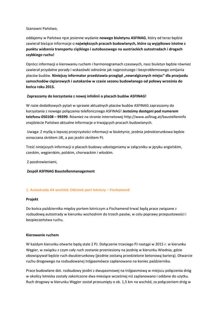 Szanowni Państwo, oddajemy w Państwa ręce jesienne wydanie nowego biuletynu ASFINAG, który od teraz będzie zawierał bieżące informacje o największych pracach budowlanych, które są wyjątkowo istotne z punktu widzenia transportu ciężkiego i autobusowego na austriackich autostradach i drogach szybkiego ruchu! Oprócz informacji o kierowaniu ruchem i harmonogramach czasowych, nasz biuletyn będzie również zawierał przydatne porady i wskazówki odnośnie jak najprostszego i bezproblemowego omijania placów budów. Niniejszy informator przedstawia przegląd „newralgicznych miejsc” dla przejazdu samochodów ciężarowych i autokarów w czasie sezonu budowlanego od połowy września do końca roku 2015. Zapraszamy do korzystania z nowej infolinii o placach budów ASFINAG! W razie dodatkowych pytań w sprawie aktualnych placów budów ASFINAG zapraszamy do korzystania z nowego połączenia telefonicznego ASFINAG! Jesteśmy dostępni pod numerem telefonu 050108 – 99399. Również na stronie internetowej http://www.asfinag.at/baustelleninfo znajdziecie Państwo aktualne informacje o trwających pracach budowlanych. Uwaga: Z myślą o lepszej przejrzystości informacji w biuletynie, jezdnia jednokierunkowa będzie oznaczana skrótem JJK, a pas jezdni skrótem PJ. Treść niniejszych informacji o placach budowy udostępniamy w załączniku w języku angielskim, czeskim, węgierskim, polskim, chorwackim i włoskim. Z pozdrowieniami, Zespół ASFINAG Baustellenmanagement 1. Autostrada A4 wschód: Odcinek port lotniczy – Fischamend Projekt Do końca października między portem lotniczym a Fischamend trwać będą prace związane z rozbudową autostrady w kierunku wschodnim do trzech pasów, w celu poprawy przepustowości i bezpieczeństwa ruchu. Kierowanie ruchem W każdym kierunku otwarte będą stale 2 PJ. Dołączenie trzeciego PJ nastąpi w 2015 r. w kierunku Węgier, w związku z czym cały ruch zostanie przeniesiony na jezdnię w kierunku Wiednia, gdzie obowiązywał będzie ruch dwukierunkowy (jezdnie zostaną przedzielone betonową barierą). Otwarcie ruchu drogowego na rozbudowanej trójpasmówce zaplanowano na koniec października. Prace budowlane dot. rozbudowy jezdni z dwupasmowej na trójpasmową w miejscu połączenia dróg w okolicy lotniska zostały zakończone dwa miesiące wcześniej niż zaplanowano i oddane do użytku. Ruch drogowy w kierunku Węgier został przesunięty o ok. 1,5 km na wschód, za połączeniem dróg w okolicy lotniska. Ogólna długość budowy została w ten sposób skrócona z siedmiu do zaledwie 5,5 kilometrów. Wskazówka ASFINAG dla transportu ciężkiego W obu kierunkach obowiązuje: Szerokość prawego PJ wynosi 3,5 m i tym samym pas jest przystosowany do ruchu samochodów ciężarowych i autokarów. Szerokość lewego PJ wynosi 2,75 m – w związku z czym na tym pasie obowiązuje zakaz jazdy pojazdów o szerokości przekraczającej 2 metry. UWAGA: Monitorowanie prędkości za pomocą instalacji Section-Control, maksymalna prędkość 80 km/h na całym terenie budowy 2. Autostrada A4 wschód: Odcinek Neusiedl – Gols/Weiden Projekt Jeszcze do końca października potrwają prace związane z wymianą pasa jezdni, zjazdów i połączeń. ASFINAG zainstaluje nowe tablice i znaki drogowe i wprowadzi szereg środków poprawiających bezpieczeństwo na odcinku. Kierowanie ruchem Dla ruchu otwarte będą zawsze dwa PJ w każdym kierunku. Dwa PJ w jednym kierunku w ruchu dwukierunkowym będą od siebie przedzielone. Wskazówka ASFINAG dla transportu ciężkiego • Dla kierowców udających się w kierunku Węgier: dwa PJ są zwężone i transport ciężki może odbywać się tylko na pierwszym PJ, zaś drugi PJ ze względu na niedostateczną szerokość nie jest przejezdny. • Dla kierowców udających się w kierunku Wiednia: 2 PJ są od siebie oddzielone, ale ze względu na dostateczną szerokość mogą nimi przejeżdżać samochody ciężarowe i autokary. Dojazd do połączeń Weiden/Gols, Gewerbepark oraz Neusiedl jest możliwy tylko pierwszym PJ, w związku z tym prosimy z odpowiednim wyprzedzeniem zajmować właściwy pas jezdni! UWAGA: Monitorowanie prędkości za pomocą radarów na jezdniach w obu kierunkach. 3. Autostrada A2 południe: Odcinek Arnwiesen Projekt Od końca lipca do końca listopada potrwa remont JKK do Włoch obejmujący również wzmocnienie środkowej przegrody w celu poprawy bezpieczeństwa. Kierowanie ruchem W każdym kierunku otwarte będą stale 2 PJ. Remont będzie przeprowadzany w kierunku Włoch, w związku z czym cały ruch zostanie przeniesiony na jezdnię w kierunku Wiednia, gdzie obowiązywał będzie ruch dwukierunkowy – jezdnie zostaną przedzielone betonową barierą. Wskazówka ASFINAG dla transportu ciężkiego Od września w kierunku Włoch obowiązuje: Dojazd do parkingu Arnwiesen przez cały czas będzie możliwy tymczasową drogą. Należy korzystać z tymczasowego zjazdu (na 152,7 km) przed początkiem dojazdu do placu budowy. Dojazd ten został oznakowany wzdłuż A2 oraz na drogach krajowych! 4. Autostrada A2 południe: Odcinek od Wolfsberg południe do St. Andrä Projekt Do połowy listopada potrwa remont nawierzchni w Karyntii: Bardziej przyczepna nawierzchnia oraz wymiana odbojnic i wykonanie przegrody pośrodku jezdni wpłynie na poprawę bezpieczeństwa. Kierowanie ruchem Ostatni etap remontu potrwa od początku września do połowy listopada: W tym okresie dla ruchu drogowego udostępniony jest 1 PJ na JKK do Wiednia. Wskazówka ASFINAG dla transportu ciężkiego W każdym kierunku udostępniony jest 1 PJ o szerokości 3,50 m. 5. Autostrada A10 Tauern: Odcinek od węzła Salzburg do Salzburg Południe Projekt ASFINAG do końca listopada przeprowadza wymianę nawierzchni na odcinku południowym od Salzburga. Kierowanie ruchem Jesienią 2015 r. ruch odbywa się na JKK do Salzburga, a w kierunku Villach znajduje się plac budowy. Ruch drogowy zostanie poprowadzony ruchem dwukierunk
