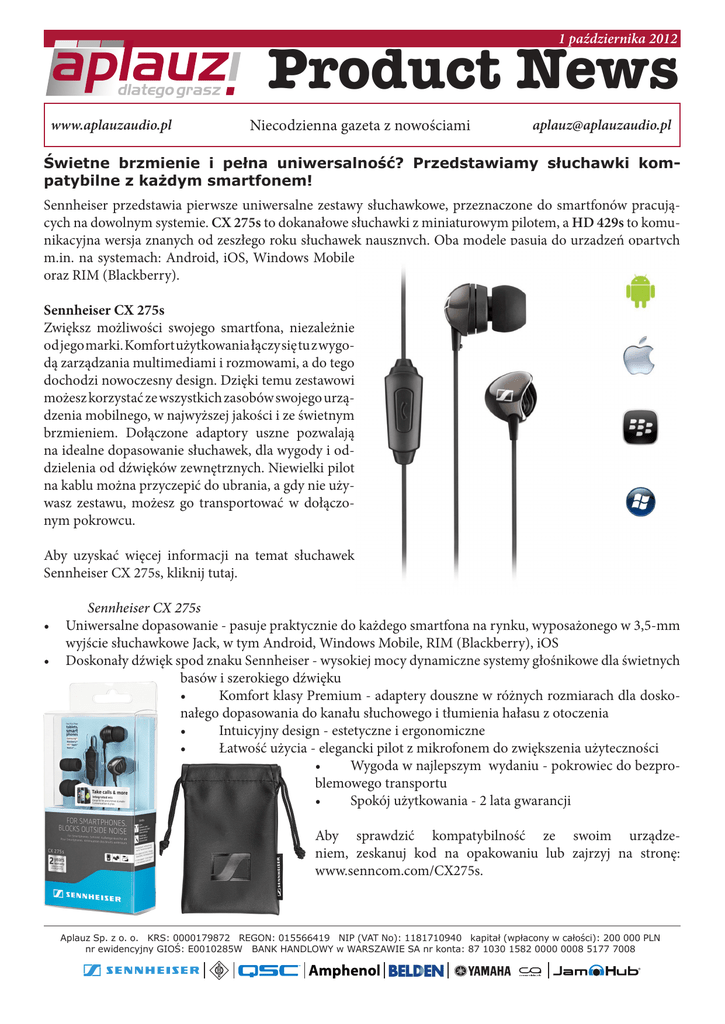 Product News 1 października 2012 www.aplauzaudio.pl Niecodzienna gazeta z nowościami [email protected] Świetne brzmienie i pełna uniwersalność? Przedstawiamy słuchawki kompatybilne z każdym smartfonem! Sennheiser przedstawia pierwsze uniwersalne zestawy słuchawkowe, przeznaczone do smartfonów pracujących na dowolnym systemie. CX 275s to dokanałowe słuchawki z miniaturowym pilotem, a HD 429s to komunikacyjna wersja znanych od zeszłego roku słuchawek nausznych. Oba modele pasują do urządzeń opartych m.in. na systemach: Android, iOS, Windows Mobile oraz RIM (Blackberry). Sennheiser CX 275s Zwiększ możliwości swojego smartfona, niezależnie od jego marki. Komfort użytkowania łączy się tu z wygodą zarządzania multimediami i rozmowami, a do tego dochodzi nowoczesny design. Dzięki temu zestawowi możesz korzystać ze wszystkich zasobów swojego urządzenia mobilnego, w najwyższej jakości i ze świetnym brzmieniem. Dołączone adaptory uszne pozwalają na idealne dopasowanie słuchawek, dla wygody i oddzielenia od dźwięków zewnętrznych. Niewielki pilot na kablu można przyczepić do ubrania, a gdy nie używasz zestawu, możesz go transportować w dołączonym pokrowcu. Aby uzyskać więcej informacji na temat słuchawek Sennheiser CX 275s, kliknij tutaj. Sennheiser CX 275s • Uniwersalne dopasowanie - pasuje praktycznie do każdego smartfona na rynku, wyposażonego w 3,5-mm wyjście słuchawkowe Jack, w tym Android, Windows Mobile, RIM (Blackberry), iOS • Doskonały dźwięk spod znaku Sennheiser - wysokiej mocy dynamiczne systemy głośnikowe dla świetnych basów i szerokiego dźwięku • Komfort klasy Premium - adaptery douszne w różnych rozmiarach dla doskonałego dopasowania do kanału słuchowego i tłumienia hałasu z otoczenia • Intuicyjny design - estetyczne i ergonomiczne • Łatwość użycia - elegancki pilot z mikrofonem do zwiększenia użyteczności • Wygoda w najlepszym wydaniu - pokrowiec do bezproblemowego transportu • Spokój użytkowania - 2 lata gwarancji Aby sprawdzić kompatybilność ze swoim urządzeniem, zeskanuj kod na opakowaniu lub zajrzyj na stronę: www.senncom.com/CX275s. Aplauz Sp. z o. o. KRS: 0000179872 REGON: 015566419 NIP (VAT No): 1181710940 kapitał (wpłacony w całości): 200 000 PLN nr ewidencyjny GIOŚ: E0010285W BANK HANDLOWY w WARSZAWIE SA nr konta: 87 1030 1582 0000 0008 5177 7008 ® Product News www.aplauzaudio.pl Niecodzienna gazeta z nowościami [email protected] Sennheiser HD 429s Oto uniwersalne słuchawki wokółuszne, do połączenia z dowolnym smartfonem. Słuchaj muzyki, rozmawiaj i korzystaj z rozrywki, którą zapewnia Twoje urządzenie mobilne, z jakością Sennheiser. Każde urządzenie na systemie Android, iOS, Windows lub RIM (Blackberry), a także Nokia czy Sony Ericsson, jest kompatybilne z tymi słuchawkami. Ich neodymowe magnesy o mocnym sygnale i wydatnych basach, wygodny pilot na kablu oraz mikrofon zapewniający czytelny dźwięk sprawiają, że dostajesz do rąk uniwersalne rozszerzenie swojego smartfona. Aby uzyskać więcej informacji na temat słuchawek Sennheiser HD 429s, kliknij tutaj. Sennheiser HD 429s • Uniwersalne dopasowanie - pasuje praktycznie do każdego smartfona na rynku, wyposażonego w 3,5-mm wyjście słuchawkowe Jack, w tym Android, Windows Mobile, RIM (Blackberry) i urządzenia iOS • Miasto czeka na Ciebie - wysokiej jakości magnesy neodymowe dadzą Ci dźwięk stereo z mocnymi i płynnymi basami • Izolacja szumów otoczenia - zamknięta, wokółuszna konstrukcja słuchawek izoluje przed hałasem z otoczenia • Łatwa kontrola połączeń - pilot z wbudowanym mikrofonem umożliwia podjęcie/kończenie połączeń • Łatwa kontrola muzyki - pilot pozwala także na łatwe odtwarzanie/pauzowanie muzyki oraz zmianę ścieżek • Swoboda - żadnej plątaniny dzięki jednostronnie wychodzącemu przewodowi • Komfort - ergonomiczna konstrukcja zapewnia wygodne dopasowanie • Spokój użytkowania - 2 lata gwarancji Aby sprawdzić kompatybilność ze swoim urządzeniem, zeskanuj kod na opakowaniu lub zajrzyj na stronę: www.senncom.com/HD429s Aplauz Sp. z o. o. KRS: 0000179872 REGON: 015566419 NIP (VAT No): 1181710940 kapitał (wpłacony w całości): 200 000 PLN nr ewidencyjny GIOŚ: E0010285W BANK HANDLOWY w WARSZAWIE SA nr konta: 87 1030 1582 0000 0008 5177 7008 ®