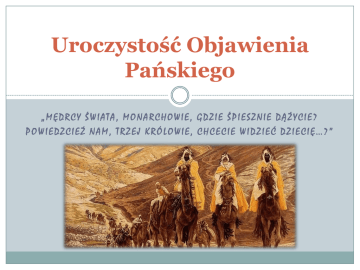 Uroczystość Objawienia Pańskiego „MĘDRCY ŚWIATA, MONARCHOWIE, GDZIE ŚPIESZNIE DĄŻYCIE? POWIEDZCIEŻ NAM, TRZEJ KRÓLOWIE, CHCECIE WIDZIEĆ DZIECIĘ…?” Objawienie Pańskie, Epifania, Uroczystość Trzech Króli Objawienie Pańskie, Epifania, Uroczystość Trzech Króli – te wszystkie określenia odnoszą się do chrześcijańskiego święta mającego uczcić objawienie się Boga człowiekowi, obecność Boga w historii człowieka, a także uzdolnienie człowieka do rozumowego poznania Boga. Objawienie Pańskie zaliczane jest do pierwszych świąt uświęconych przez Kościół. W pierwszych wiekach chrześcijaństwa wyznaczało ono początek roku liturgicznego. W Kościele wschodnim znane było już w III wieku, natomiast w Kościele obrządku zachodniego zaczęto je obchodzić pod koniec wieku IV. We wczesnym chrześcijaństwie dzień ten obchodzony był jako święto Bożego Narodzenia: w Apostolskim Kościele Ormiańskim jest tak do dzisiaj; w Cerkwi prawosławnej jest to Wigilia święta Narodzenia Chrystusa – Epifania, obchodzona łącznie, tj. święto Bożego Narodzenia ze świętem Trzech Króli. Herod w narodzonym upatrywał rywala Symbolem uroczystości Objawienia Pańskiego jest historia opisana w Ewangelii św. Mateusza (2, 1-12), według której Mędrcy ze Wschodu przybyli do Betlejem, aby oddać pokłon Jezusowi. Opowiadanie to ma zasadnicze znaczenie teologiczne. Ukazuje bowiem, że Jezus od momentu urodzenia jest zapowiedzianym mesjaszem i że jego misja jest uniwersalna, ogólnoświatowa. Pokłon trzech królów, magów, mędrców jest symboliczną zapowiedzią uznania przez świat pogański w Jezusie Pomazańca-Władcę wszystkich narodów, posłanego przez Boga. Natomiast reakcja Heroda i „całej Jerozolimy” jest symbolicznym wyrazem stosunku władców tego świata wobec Władcy-Pomazańca Pańskiego. Opis pokłonu Mędrców znajduje się tylko w Ewangelii św. Mateusza. Co ciekawe, ich liczba nie jest znana, bowiem w przekazach biblijnych mówi się jedynie o trzech darach i to na tej podstawie wysnuwa się potocznie przyjętą liczbę mędrców, którzy wiedzeni gwiazdą, wyruszyli w drogę do Betlejem, które wyznaczyli jako miejsce narodzin na podstawie proroctwa z Księgi Micheasza (Mi 5,1), aby złożyć pokłon i dary narodzonemu królowi żydowskiemu. Po drodze zawitali na dwór Heroda, który usłyszawszy tę nowinę, w narodzonym upatrywał rywala. W zachodnim chrześcijaństwie nazywani są imionami: Kacper, Melchior i Baltazar Mędrcy według Ewangelii weszli do domu, w którym przebywali Maria i Józef z Jezusem, ofiarowali mu mirrę, złoto i kadzidło (mirra i kadzidło była wówczas w cenie złota, tę aromatyczną żywicę z rzadkich drzew palili w swoich pałacach jedynie najzamożniejsi), po czym, otrzymawszy we śnie wskazówkę, aby nie wracali do Heroda, wyruszyli z powrotem do swych krajów inną drogą. Biblia, tak jak i liczby, nie wymienia imion mędrców. W zachodnim chrześcijaństwie nazywani są imionami: Kacper, Melchior i Baltazar. Bezpodstawnie również uważa się ich za królów, bo ani Pismo Święte, ani najstarsza tradycja nie widziały w nich królów – wszelkie zaś badania biblijne pozwalają domniemywać, iż najbliższe prawdzie jest określenie ich astrologami. Charakterystycznym dla tej uroczystości jest wykształcony na przełomie XV i XVI wieku zwyczaj święcenia złota i kadzidła. Kadzidłem była żywica z jałowca, którym okadzano domy i obejścia, co miało znaczenie symbolicznego zabezpieczenia go przed chorobami i nieszczęściami. Christus Mansionem Benedicat W tym samym celu poświęconym złotem dotykano całej szyi. Po uroczystym obiedzie podawano ciasto z migdałem. Ten, kto go odnalazł w swoim kawałku, zostawał „królem migdałowym”. Znany był też zwyczaj chodzenia dzieci z gwiazdą, które pukając do domów, otrzymywały rogale, zwane „szczodrakami”. Śpiewano przy tym kolędy o Trzech Królach. Przy kościołach stały stragany, sprzedawano kadzidło i kredę. Od XVIII wieku rozpowszechnił się także zwyczaj święcenia kredy, którą zwyczajowo w uroczystość Trzech Króli na drzwiach wejściowych w wielu domach katolickich pisano litery: K+M+B oraz datę bieżącego roku. Zwyczaj ten, znany również w czasach obecnych, jest błędną interpretacją łacińskiej inskrypcji CMB Christus Mansionem Benedicat (Niech Chrystus błogosławi temu domowi), choć św. Augustyn tłumaczy je jako Christus Multorum Benefactor (Chrystus dobroczyńcą wielu). Legenda o „trzech królach” pojawiła się w średniowieczu, stąd przyjęło się błędne odczytywanie tych liter jako imion Mędrców. Uroczystość Trzech Króli jest również zakończeniem okresu Godów Dzień uroczystości Trzech Króli jest również zakończeniem okresu Godów, który rozpoczynał się w dniu święta Bożego Narodzenia, a także początkiem karnawału. W Polsce powojennej uroczystość Objawienia Pańskiego była dniem wolnym od pracy do 16 listopada 1960 roku. Mocą ustawy Sejmu PRL przestaje być dniem świątecznym. We wrześniu 2010 roku rozpoczęto prace legislacyjne nad przywróceniem dnia wolnego i 19 listopada 2010 roku, a więc po półwiecznym okresie „zawieszenia”, została podpisana przez Prezydenta RP, Bronisława Komorowskiego, odpowiednia ustawa stanowiąca, iż 6 stycznia jest dniem wolnym od pracy. Opr.: A.Szewczyk