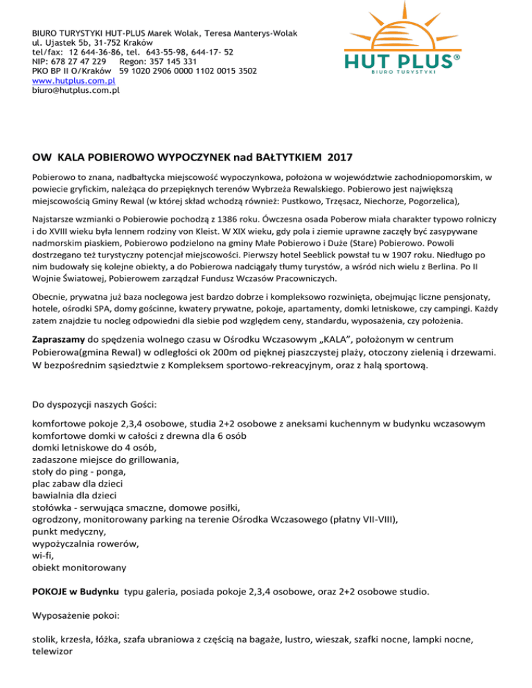BIURO TURYSTYKI HUT-PLUS Marek Wolak, Teresa Manterys-Wolak ul. Ujastek 5b, 31-752 Kraków tel/fax: 12 644-36-86, tel. 643-55-98, 644-17- 52 NIP: 678 27 47 229 Regon: 357 145 331 PKO BP II O/Kraków 59 1020 2906 0000 1102 0015 3502 www.hutplus.com.pl [email protected] OW KALA POBIEROWO WYPOCZYNEK nad BAŁTYTKIEM 2017 Pobierowo to znana, nadbałtycka miejscowość wypoczynkowa, położona w województwie zachodniopomorskim, w powiecie gryfickim, należąca do przepięknych terenów Wybrzeża Rewalskiego. Pobierowo jest największą miejscowością Gminy Rewal (w której skład wchodzą również: Pustkowo, Trzęsacz, Niechorze, Pogorzelica), Najstarsze wzmianki o Pobierowie pochodzą z 1386 roku. Ówczesna osada Poberow miała charakter typowo rolniczy i do XVIII wieku była lennem rodziny von Kleist. W XIX wieku, gdy pola i ziemie uprawne zaczęły być zasypywane nadmorskim piaskiem, Pobierowo podzielono na gminy Małe Pobierowo i Duże (Stare) Pobierowo. Powoli dostrzegano też turystyczny potencjał miejscowości. Pierwszy hotel Seeblick powstał tu w 1907 roku. Niedługo po nim budowały się kolejne obiekty, a do Pobierowa nadciągały tłumy turystów, a wśród nich wielu z Berlina. Po II Wojnie Światowej, Pobierowem zarządzał Fundusz Wczasów Pracowniczych. Obecnie, prywatna już baza noclegowa jest bardzo dobrze i kompleksowo rozwinięta, obejmując liczne pensjonaty, hotele, ośrodki SPA, domy gościnne, kwatery prywatne, pokoje, apartamenty, domki letniskowe, czy campingi. Każdy zatem znajdzie tu nocleg odpowiedni dla siebie pod względem ceny, standardu, wyposażenia, czy położenia. Zapraszamy do spędzenia wolnego czasu w Ośrodku Wczasowym „KALA”, położonym w centrum Pobierowa(gmina Rewal) w odległości ok 200m od pięknej piaszczystej plaży, otoczony zielenią i drzewami. W bezpośrednim sąsiedztwie z Kompleksem sportowo-rekreacyjnym, oraz z halą sportową. Do dyspozycji naszych Gości: komfortowe pokoje 2,3,4 osobowe, studia 2+2 osobowe z aneksami kuchennym w budynku wczasowym komfortowe domki w całości z drewna dla 6 osób domki letniskowe do 4 osób, zadaszone miejsce do grillowania, stoły do ping - ponga, plac zabaw dla dzieci bawialnia dla dzieci stołówka - serwująca smaczne, domowe posiłki, ogrodzony, monitorowany parking na terenie Ośrodka Wczasowego (płatny VII-VIII), punkt medyczny, wypożyczalnia rowerów, wi-fi, obiekt monitorowany POKOJE w Budynku typu galeria, posiada pokoje 2,3,4 osobowe, oraz 2+2 osobowe studio. Wyposażenie pokoi: stolik, krzesła, łóżka, szafa ubraniowa z częścią na bagaże, lustro, wieszak, szafki nocne, lampki nocne, telewizor BIURO TURYSTYKI HUT-PLUS Marek Wolak, Teresa Manterys-Wolak ul. Ujastek 5b, 31-752 Kraków tel/fax: 12 644-36-86, tel. 643-55-98, 644-17- 52 NIP: 678 27 47 229 Regon: 357 145 331 PKO BP II O/Kraków 59 1020 2906 0000 1102 0015 3502 www.hutplus.com.pl [email protected] zestaw plażowy(koc, parawan, leżak), czajnik bezprzewodowy + podstawowe naczynia(szklanka, talerz, sztućce, itp.), łazienka (wc, umywalka, natrysk) chłodziarka (płatna) Doba hotelowa zaczyna się o godz.14:00 w dniu przyjazdu, a kończy się o godz.10:00 w dniu wyjazdu. CENNIK W TERMINIE OD 24.06.-31.08.2017r Pokój 2 osobowy i pokój 2+2 studio 140zł od osoby z wyżywieniem (3 posiłki) Pokój 3 osobowy i pokój 4 osobowy 135zł od osoby z wyżywieniem (3 posiłki) KOMFORTOWE DREWNIANE DOMKI W każdym z domków: 2 pokoje na poddaszu, pokoje 2-osobowe łazienka z pełnym węzłem sanitarnym pokój gościnny Wyposażenie domków: stolik, ławka narożna, taborety, łóżka(na dole łóżko piętrowe), szafa ubraniowa , wieszak, komodobieliźniarka, lampki nocne, telewizor zestaw plażowy(koc, parawan, leżak), czajnik bezprzewodowy + podstawowe naczynia(szklanka, talerz, sztućce, itp.) chłodziarka (płatna) CENNIK WYNAJMU DOMKU W TERMINIE OD 24.06.-31.08.2017r do 6 osób 420 zł za dobę W ramach pobytu polecamy wyżywienie w Ośrodku Wczasowym KALA w atrakcyjnych cenach: Wyżywienie całodzienne 45 zł od osoby Śniadanie w formie bufetu szwedzkiego 15 zł od osoby Obiad serwowany (danie dnia) 20 zł od osoby Kolacja w formie bufetu szwedzkiego 15 zł od osoby Podane ceny dotyczą pobytów powyżej 6 noclegów BIURO TURYSTYKI HUT-PLUS Marek Wolak, Teresa Manterys-Wolak ul. Ujastek 5b, 31-752 Kraków tel/fax: 12 644-36-86, tel. 643-55-98, 644-17- 52 NIP: 678 27 47 229 Regon: 357 145 331 PKO BP II O/Kraków 59 1020 2906 0000 1102 0015 3502 www.hutplus.com.pl [email protected] śniadanie i kolacja w formie bufetu szwedzkiego, obiad serwowany. DOMKI DREWNIANE NOWE : W każdym z domków: 2 pokoje na poddaszu, pokoje 2-osobowe łazienka z pełnym węzłem sanitarnym pokój gościnny Wyposażenie domków: stolik, ławka narożna, taborety, łóżka(na dole łóżko piętrowe), szafa ubraniowa , wieszak, komodobieliźniarka, lampki nocne, telewizor zestaw plażowy(koc, parawan, leżak), czajnik bezprzewodowy + podstawowe naczynia(szklanka, talerz, sztućce, itp.) chłodziarka (płatna) CENNIK WYNAJMU DOMKU W TERMINIE OD 24.06.-31.08.2017r do 6 osób 420 zł za dobę W ramach pobytu polecamy wyżywienie w Ośrodku Wczasowym KALA w atrakcyjnych cenach: Wyżywienie całodzienne 45 zł od osoby Śniadanie w formie bufetu szwedzkiego 15 zł od osoby Obiad serwowany (danie dnia) 20 złod osoby Kolacja w formie bufetu szwedzkiego 15 zł od osoby Podane ceny dotyczą pobytów powyżej 6 noclegów Turnusy promocyjne MAJ, CZERWIEC, WRZESIEŃ 2017 BUDYNEK WCZASOWY (pobyt powyżej 5 noclegów): -Pokój 2os., 3os., 4os., 2+2os. 95,00 zł z wyż/os/dz DOMKI KOMFORTOWE (pobyt powyżej 5 noclegów): -4-6 os w domku 95,00 zł z wyż/os/dz BIURO TURYSTYKI HUT-PLUS Marek Wolak, Teresa Manterys-Wolak ul. Ujastek 5b, 31-752 Kraków tel/fax: 12 644-36-86, tel. 643-55-98, 644-17- 52 NIP: 678 27 47 229 Regon: 357 145 331 PKO BP II O/Kraków 59 1020 2906 0000 1102 0015 3502 www.hutplus.com.pl [email protected] Łóżeczko turystyczne Opłata za