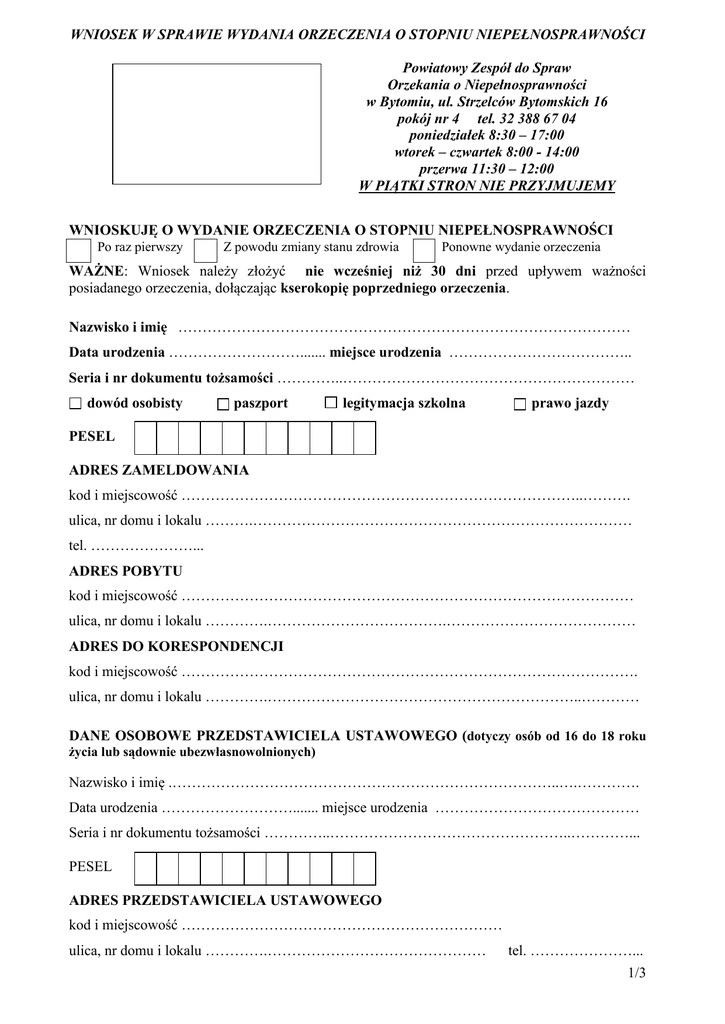 WNIOSEK W SPRAWIE WYDANIA ORZECZENIA O STOPNIU NIEPEŁNOSPRAWNOŚCI Powiatowy Zespół do Spraw Orzekania o Niepełnosprawności w Bytomiu, ul. Strzelców Bytomskich 16 pokój nr 4 tel. 32 388 67 04 poniedziałek 8:30 – 17:00 wtorek – czwartek 8:00 - 14:00 przerwa 11:30 – 12:00 W PIĄTKI STRON NIE PRZYJMUJEMY WNIOSKUJĘ O WYDANIE ORZECZENIA O STOPNIU NIEPEŁNOSPRAWNOŚCI Po raz pierwszy Z powodu zmiany stanu zdrowia Ponowne wydanie orzeczenia WAŻNE: Wniosek należy złożyć nie wcześniej niż 30 dni przed upływem ważności posiadanego orzeczenia, dołączając kserokopię poprzedniego orzeczenia. Nazwisko i imię ………………………………………………………………………………… Data urodzenia ………………………....... miejsce urodzenia ……………………………….. Seria i nr dokumentu tożsamości …………..…………………………………………………… dowód osobisty paszport legitymacja szkolna prawo jazdy PESEL ADRES ZAMELDOWANIA kod i miejscowość ………………………………………………………………………..………. ulica, nr domu i lokalu ……….…………………………………………………………………… tel. …………………... ADRES POBYTU kod i miejscowość ………………………………………………………………………………… ulica, nr domu i lokalu ………….……………………………….………………………………… ADRES DO KORESPONDENCJI kod i miejscowość …………………………………………………………………………………. ulica, nr domu i lokalu ………….………………………………………………………..………… DANE OSOBOWE PRZEDSTAWICIELA USTAWOWEGO (dotyczy osób od 16 do 18 roku życia lub sądownie ubezwłasnowolnionych) Nazwisko i imię .……………………………………………………………………..….…………. Data urodzenia ………………………....... miejsce urodzenia …………………………………… Seria i nr dokumentu tożsamości …………..…………………………………………..…………... PESEL ADRES PRZEDSTAWICIELA USTAWOWEGO kod i miejscowość ………………………………………………………… ulica, nr domu i lokalu ………….……………………………………… tel. …………………... 1/3 Cel wydania orzeczenia o stopniu niepełnosprawności: odpowiednie zatrudnienie, szkolenie, uczestnictwo w terapii zajęciowej, konieczność zaopatrzenia w przedmioty ortopedyczne i środki pomocnicze, korzystanie z systemu środowiskowego wsparcia w samodzielnej egzystencji (korzystanie z usług socjalnych, opiekuńczych, terapeutycznych i rehabilitacyjnych), korzystanie z karty parkingowej, korzystanie ze świadczeń pomocy społecznej – zasiłek stały, zasiłek pielęgnacyjny, uzyskanie przez opiekuna świadczenia pielęgnacyjnego, prawo do zamieszkiwania w oddzielnym pokoju, inne, jakie? Cel podstawowy: (jeden z wyżej wymienionych ) Dane dotyczące sytuacji społecznej i zawodowej: 1. Stan cywilny: panna/kawaler mężatka/żonaty wdowa/wdowiec rozwiedziony/a separacja 2. Wykonywanie czynności samoobsługowych: a) wykonywanie czynności samoobsługowych b) poruszanie się w środowisku c) prowadzenie gospodarstwa domowego samodzielnie z pomocą opieka 3. Sytuacja zawodowa: wykształcenie …………….……, zawód wyuczony ……………………. zatrudniony/a zawód wykonywany ……………………………………………………. Oświadczam, że: 1. pobieram świadczenia nie pobieram świadczeń z ubezpieczenia społecznego: renta szkoleniowa renta z tytułu częściowej niezdolności do pracy renta z tytułu całkowitej niezdolności do pracy renta z tytułu całkowitej niezdolności do pracy i do samodzielnej egzystencji renta rolnicza z tytułu niezdolności do pracy renta rolnicza szkoleniowa wojskowa renta inwalidzka policyjna renta inwalidzka renta inwalidzka z powodu inwalidztwa I gr renta inwalidzka z powodu inwalidztwa II gr renta inwalidzka z powodu inwalidztwa III gr 2/3 2. Aktualnie toczy się nie toczy się w moje sprawie postępowanie przed innym organem orzeczniczym (ZUS, WZON, Sąd Pracy itp.). 3. Składano nie składano wniosek o ustalenie stopnia niepełnosprawności kiedy? (rok) …………. 4. z jaki skutkiem? lekki umiarkowany znaczny Mogę nie mogę przybyć na posiedzenie składu orzekającego. Jeśli nie, to należy dołączyć zaświadczenie lekarskie potwierdzające niemożność przybycia na komisję. 5. W razie stwierdzenia konieczności wykonania badań dodatkowych, konsultacji specjalistycznych lub obserwacji szpitalnych, uzupełniających złożone zaświadczenie o stanie zdrowia, wydane przez lekarza niebędącego lekarzem ubezpieczenia zdrowotnego, jestem świadomy/a wymogu ponoszenia ich kosztów we własnym zakresie. 6. Oświadczam, że dane zawarte we wniosku są zgodne ze stanem faktycznym i jestem świadomy/a odpowiedzialności za zeznanie nieprawdy lub zatajenie prawdy. 7. Wyrażam zgodę na przetwarzanie moich danych osobowych dla celów związanych z postępowaniem o wydanie orzeczenia. 8. Zobowiązuję się powiadomić Powiatowy Zespół do Spraw Orzekania o Niepełnosprawności o każdej zmianie mojego adresu do momentu zakończenia postępowania (podstawa prawna: art. 41 Kodeksu postępowania administracyjnego). DO WNIOSKU NALEŻY DOŁĄCZYĆ: Zaświadczenie lekarskie o stanie zdrowia wypełnione przez lekarza prowadzącego, Kserokopię poprzedniego orzeczenia, Kserokopie kart informacyjnych leczenia szpitalnego, Kartoteki z przychodni prowadzących – kserokopie potwierdzone za zgodność z oryginałem, Inne dokumenty mające wpływ na wydanie orzeczenia o stopniu niepełnosprawności, Dowód osobisty (do wglądu). Dodatkowe informacje można uzyskać pod numerami tel. 32 388 67 04 ; 32 38