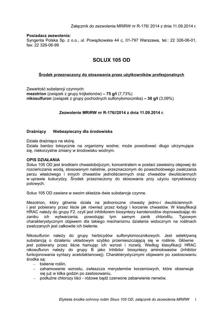 Załącznik do zezwolenia MRiRW nr R-176/ 2014 z dnia 11.09.2014 r. Posiadacz zezwolenia: Syngenta Polska Sp. z o.o., ul. Powązkowska 44 c, 01-797 Warszawa, tel.: 22 326-06-01, fax: 22 326-06-99 SOLUX 105 OD Środek przeznaczony do stosowania przez użytkowników profesjonalnych Zawartość substancji czynnych: mezotrion (związek z grupy trójketonów) – 75 g/l (7,73%) nikosulfuron (związek z grupy pochodnych sulfonylomocznika) – 30 g/l (3,09%) Zezwolenie MRiRW nr R-176//2014 z dnia 11.09.2014 r. Drażniący Niebezpieczny dla środowiska Działa drażniąco na skórę. Działa bardzo toksycznie na organizmy wodne; może powodować długo utrzymujące się, niekorzystne zmiany w środowisku wodnym. OPIS DZIAŁANIA Solux 105 OD jest środkiem chwastobójczym, koncentratem w postaci zawiesiny olejowej do rozcieńczania wodą, stosowanym nalistnie, przeznaczonym do powschodowego zwalczania perzu właściwego i innych chwastów jednoliściennych oraz chwastów dwuliściennych w uprawie kukurydzy. Środek przeznaczony do stosowania przy użyciu opryskiwaczy polowych. Solux 105 OD zawiera w swoim składzie dwie substancje czynne. Mezotrion, który głównie działa na jednoroczne chwasty jedno-i dwuliściennych i jest pobierany przez liście jak również przez łodygi i korzenie chwastów. W klasyfikacji HRAC należy do grupy F2, czyli jest inhibitorem biosyntezy karotenoidów doprowadzając do zaniku ich wytwarzania, powodując tym samym zanik chlorofilu. Typowym charakterystycznym objawem dla takiego mechanizmu działania widocznym na roślinach zwalczanych jest całkowite ich bielenie. Nikosulfuron należy do grupy herbicydów sulfonylomocznikowych. Jest selektywną substancją o działaniu układowym szybko przemieszczającą się w roślinie. Głównie jest pobierany przez liście hamując ich wzrost i rozwój. Według klasyfikacji HRAC nikosufluron należy do grupy B jako Inhibitor biosyntezy aminokwasów (inhibitor funkcjonowania syntazy acetolaktanowej). Charakterystycznymi objawami po zastosowaniu środka są: − bielenie roślin, − zahamowanie wzrostu, zwłaszcza merystemów korzeniowych, które obserwuje się już w kilka godzin po zastosowaniu, − podłużne chlorozy liści - różowe bądź czerwone zabarwienie nerwów, Etykieta środka ochrony roślin Sloux 105 OD, załącznik do zezwolenia MRiRW 1 2 − obumieranie tkanek w okolicy merystemów i w efekcie zamieranie całych roślin; objawy widoczne są dopiero po kilkunastu dniach (czasami w przypadku niekorzystnych warunków pogodowych po 3 tygodniach). DZIAŁANIE NA CHWASTY Chwasty wrażliwe: 1. chwasty dwuliścienne: bodziszek drobny, dymnica pospolita, fiołek polny, fiołek trójbarwny, gwiazdnica pospolita, jasnota różowa, jasnota purpurowa, komosa biała, maruna bezwonna, maruna morska, przetacznik perski, przytulia czepna, psianka czarna, rdest kolankowy, rdest plamisty, rdest ptasi, rumian polny (w dawce 1,5 l/ha), rumianek pospolity (w dawce 1,5 l/ha), rumianek bezpromieniowy, samosiewy rzepaku, szarłat szorstki, tasznik pospolity, tobołki polne, żółtlica drobnokwiatowa. 2. chwasty jednoliścienne: chwastnica jednostronna, wiechlina roczna, perz właściwy (w dawce 1,5 l/ha). Chwasty średniowrażliwe: rdest powojowaty, ostrożeń polny, rumian polny (w niższej dawce 1,0 l/ha), rumianek pospolity (w niższej dawce 1,0 l/ha). STOSOWANIE ŚRODKA Kukurydza Maksymalna dawka dla jednorazowego zastosowania: 1,5 l/ha. Zalecana dawka dla jednorazowego zastosowania: 1,0 l/ha – 1,5 l/ha. Termin stosowania środka: Zabieg można wykonać po wschodach kukurydzy (od fazy 2 liści do fazy 8 liści rośliny uprawnej, BBCH12-18). Maksymalna liczba zabiegów w sezonie wegetacyjnym: 1. Zalecana ilość wody: 200-300 l/ha. Zalecane opryskiwanie: średniokropliste. W zwalczaniu perzu właściwego, ostrożenia polnego (kiełkującego z nasion oraz części nadziemnych odrastających z korzeni), jak też w zaawansowanych fazach rozwojowych chwastów stosować wyższą z zalecanych dawek. Zwalczanie perzu wykonać, gdy większość roślin perzu osiągnęła wysokość 15-20 cm (4-7 liści). NASTĘPSTWO ROŚLIN W przypadku konieczności wcześniejszego zaorania plantacji potraktowanej środkiem Solux 105 OD (w wyniku uszkodzenia kukurydzy przez grad, choroby, szkodniki lub przymrozki) na polu można uprawiać kukurydzę lub życicę trwałą. Po wykonaniu głębokiej orki oprócz w/w roślin można także uprawiać sorgo. Po zbiorze kukurydzy uprawianej w normalnych warunkach wegetacji, odchwaszczonej środkiem Solux 105 OD do 1 lipca oraz po wykonaniu głębokiej orki można wysiewać wszystkie rośliny uprawne. W przypadku uprawy roślin wrażliwych tj. buraka, strączkowych, rzepaku ozimego, słonecznika i warzyw oraz wcześnie sianych zbóż ozimych możliwe jest wystąpienie uszkodzeń. W skrajnie niekorzystnych warunkach (gleby piaszczyste, gleby łatwo przesychające, gleby o niskim pH [<6.0], gleby o wysokiej zawartości substancji organicznej [>4.0%], niskiej aktywności biologicznej, wyjątkowo niskich temperaturach w okresie zimowym, wyjątkowo niskiej wilgotności gleby latem i/lub jesienią i/lub zimą, nakładania się powierzchni opryskanej preparatem, gleby nadmiernie ugniecionej) mogą wystąpić tymczasowe wybielenia, zahamowanie wzrostu, zmniejszenie obsady w roślinach wrażliwych (buraki, 2 strączkowe, słonecznik i warzywa). Dlatego też uprawa w/w roślin jako roślin następczych nie jest zalecana, gdy pH gleby jest znacznie poniżej 6.0 lub jeśli po zastosowaniu środka w poprzednim sezonie, wystąpił długotrwały okres posuchy. Głęboka orka po uprawie kukurydzy i pH gleby ponad 6.0 znacząco zmniejszają ryzyko uszkodzeń tych roślin. ŚRODKI OSTROŻNOŚCI I ZALECENIA STOSOWANIA ZWIĄZANE PRAKTYKĄ ROLNICZĄ Podczas stosowania środka nie dopuścić do: - znoszenia cieczy użytkowej na sąsiednie rośliny uprawne, - nakładania się cieczy użytkowej na stykach pasów zabiegowych i uwroci