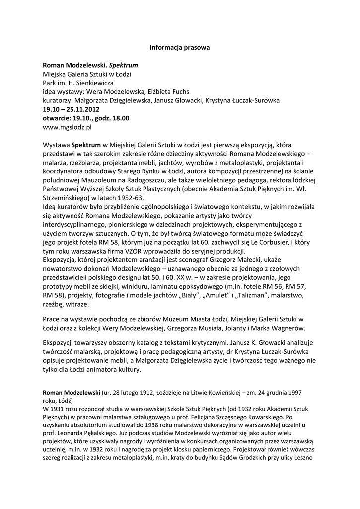 Informacja prasowa Roman Modzelewski. Spektrum Miejska Galeria Sztuki w Łodzi Park im. H. Sienkiewicza idea wystawy: Wera Modzelewska, Elżbieta Fuchs kuratorzy: Małgorzata Dzięgielewska, Janusz Głowacki, Krystyna Łuczak-Surówka 19.10 – 25.11.2012 otwarcie: 19.10., godz. 18.00 www.mgslodz.pl Wystawa Spektrum w Miejskiej Galerii Sztuki w Łodzi jest pierwszą ekspozycją, która przedstawi w tak szerokim zakresie różne dziedziny aktywności Romana Modzelewskiego – malarza, rzeźbiarza, projektanta mebli, jachtów, wyrobów z metaloplastyki, projektanta i koordynatora odbudowy Starego Rynku w Łodzi, autora kompozycji przestrzennej na ścianie południowej Mauzoleum na Radogoszczu, ale także wieloletniego pedagoga, rektora łódzkiej Państwowej Wyższej Szkoły Sztuk Plastycznych (obecnie Akademia Sztuk Pięknych im. Wł. Strzemińskiego) w latach 1952-63. Ideą kuratorów było przybliżenie ogólnopolskiego i światowego kontekstu, w jakim rozwijała się aktywność Romana Modzelewskiego, pokazanie artysty jako twórcy interdyscyplinarnego, pionierskiego w dziedzinach projektowych, eksperymentującego z użyciem tworzyw sztucznych. O tym, że był twórcą światowego formatu może świadczyć jego projekt fotela RM 58, którym już na początku lat 60. zachwycił się Le Corbusier, i który tym roku warszawska firma VZÓR wprowadziła do seryjnej produkcji. Ekspozycja, której projektantem aranżacji jest scenograf Grzegorz Małecki, ukaże nowatorstwo dokonań Modzelewskiego – uznawanego obecnie za jednego z czołowych przedstawicieli polskiego designu lat 50. i 60. XX w. – w zakresie projektowania, jego prototypy mebli ze sklejki, winiduru, laminatu epoksydowego (m.in. fotele RM 56, RM 57, RM 58), projekty, fotografie i modele jachtów „Biały”, „Amulet” i „Talizman”, malarstwo, rzeźbę, witraże. Prace na wystawie pochodzą ze zbiorów Muzeum Miasta Łodzi, Miejskiej Galerii Sztuki w Łodzi oraz z kolekcji Wery Modzelewskiej, Grzegorza Musiała, Jolanty i Marka Wagnerów. Ekspozycji towarzyszy obszerny katalog z tekstami krytycznymi. Janusz K. Głowacki analizuje twórczość malarską, projektową i pracę pedagogiczną artysty, dr Krystyna Łuczak-Surówka opisuje projektowanie mebli, a Małgorzata Dzięgielewska życie i twórczość tego ważnego nie tylko dla Łodzi animatora kultury. Roman Modzelewski (ur. 28 lutego 1912, Łoździeje na Litwie Kowieńskiej – zm. 24 grudnia 1997 roku, Łódź) W 1931 roku rozpoczął studia w warszawskiej Szkole Sztuk Pięknych (od 1932 roku Akademii Sztuk Pięknych) w pracowni malarstwa sztalugowego u prof. Felicjana Szczęsnego Kowarskiego. Po uzyskaniu absolutorium studiował do 1938 roku malarstwo dekoracyjne w warszawskiej uczelni u prof. Leonarda Pękalskiego. Już podczas studiów Modzelewski wyróżniał się jako autor wielu projektów, które uzyskiwały nagrody i wyróżnienia w konkursach organizowanych przez warszawską uczelnię, m.in. w 1932 roku I nagrodę za projekt kiosku papierniczego. Projektował również wówczas szereg realizacji z zakresu metaloplastyki, m.in. kraty do budynku Sądów Grodzkich przy ulicy Leszno 53/55 w Warszawie. Dyplom z malarstwa sztalugowego uzyskał dopiero po wojnie, w 1946 roku, w ASP w Warszawie. Jesienią 1939 roku wyruszył do Lwowa, gdzie utrzymywał się z wykonywania robót zleconych przez tamtejszą Spółdzielnię Artystyczną, m.in. realizował sgraffita reklamowe na elewacjach budynków, a także przedmioty z zakresu metaloplastyki. We Lwowie malował też portrety i martwe natury, utrzymane w stylistyce koloryzmu. W 1944 roku udało się Modzelewskiemu powrócić do Warszawy, by następnie przedostać się do brata Teodora do Buska-Zdroju. W 1945 roku, podobnie jak wielu warszawskich artystów i intelektualistów, m.in. jego profesor Felicjan Szczęsny Kowarski, przyjechał do Łodzi. Początkowo, przez kilka miesięcy, pracował w Liceum Sztuk Plastycznych. Jednocześnie współorganizował wraz z Leonem Ormezowskim, dyrektorem uczelni, a także m.in. Władysławem Strzemińskim, Stefanem Wegnerem, Felicjanem Szczęsnym Kowarskim Wyższą Szkołę Sztuk Plastycznych przy ul. Narutowicza 77. Na przełomie sierpnia i września 1945 roku wziął udział w pierwszej po wojnie wystawie Zawodowego Związku Polskich Artystów Plastyków w Miejskiej Galerii Sztuk Plastycznych w Łodzi, gdzie zaprezentował 5 prac (za jedną z nich otrzymał Nagrodę Wydziału Kultury i Sztuki Zarządu Miejskiego). Okres do 1945 roku, to czas, kiedy, jak sam artysta określał, jego zainteresowania malarskie koncentrowały się w kręgu „kapizmu – koloryzmu”. Malował wówczas liczne pejzaże, portrety, sceny rodzajowe, martwe natury. Przełomem okazał się wspólny plener z Władysławem Strzemińskim w Nowej Rudzie w 1946 roku, po którym Modzelewski odszedł od malarstwa impresjonistycznego na rzecz analizy obrazu słońca i obrazów powidokowych, eksperymentując z formą i kolorem, który to kierunek Strzemiński określił jako solaryzm (prace olejne z cyklu „Słońce”, lata 1946-48). W II połowie lat 40. i w latach 50. rozpoczął cykl prac nawiązujących do późnego kubizmu („Martwa natura – Butelka”, 1947; cykl „Żagle”, lata 1946-47). Od II połowy lat 50. aż do lat 90. w malarstwie poszukiwał nowych rozwiązań pozostających w kręgu abstrakcji, geometrii, związanych z fakturą (używał masy plastycznej – winidur, tworzyw sztucznych, żywicy epoksydowej, metalu, śrub). Obrazy te tytułowane były w większości „Kompozycjami”. Pod koniec lat 50. i na początku 60. wykonywał również rzeźby abstrakcyjne, nawiązujące do natury, z użyciem tworzyw sztucznych, metalu, drutów i tektury. Modzelewski prowadził na łódzkiej uczelni, w różnych latach, zajęcia z malarstwa i malarstwa ściennego, malarstwa dekoracyjnego, dekoracji wnętrza, malarstwa architektonicznego oraz malarstwa i rysunku. Od 1 stycznia 1952 roku zaczął peł