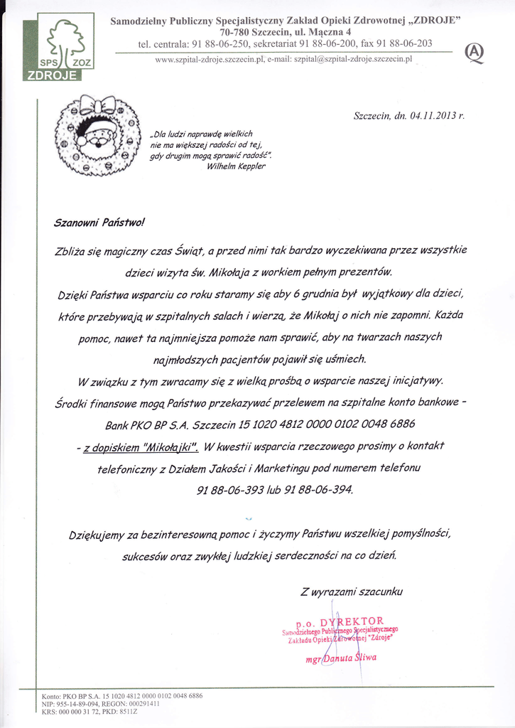 S amo dzielny Publiczny ,ift, tel. centrala: 9 alistyczny Zakład' opieki Zdrowotn ej,,ZDRO JE'" 70-780 Szczecin, ul. Mączna 4 Sp ecj 1 88-06-250, sekretariat 9 l. 88-06-200, fax 91. 88-06-203 www.szpital- zdroje.szczecin.pl, e-mail: [email protected] Szczecin, dn. 04. I I.2al 3 r. .D/a /udzi naprawdę wielkich nie ma większej radościod tej, gdy drugin mog4sprawić radość". l4/ilheln Keppler 5zanowni Pańsłwo! Zbliza się nagiczny czas świąt,a przed nini fak bardzo przez wszystkie dzieci wizyfa św.ihikołaja z Workiem pełnyn PrezentóW. Dzięki Pańsfwa wsparciu co roku staramy się aby które w ó grudnia był wyjatkowy dla dzieci, szpitalnych salach i wierzą, że lLikołaj o nich nie zapomni. Każda Pomoc, nawet ta najnniejsza pomoze nam sPrawić, aby na twarzach naszych najnłodszych pacjentów pojawił się uśniech. lĄ/ związku z tym zwracamy się z wielką prośbąo Wsparcie naszej inicjatywy. środkifinansowe mogą Państwo Bank PKo BP S.A. - 'zczecin z dopiskiem "l4ikołajki". 14/ Przelewem na szpitalne konto bankowe 15 1020 4812 0000 0102 0048 ó88ó kwestii wsparcia rzeczowego prosimy o konfakt felefoniczny z Działen ,rakości ilĄarketingu Pod numerem telefonu 91 88-0ó-393 lub 91 88-0ó-394. Dziękujeny za bezinteresowną pomoc i życzyny Państwu wszelkiej ponyślności, sukcesów oraz zwykłej ludzkiej serdecznościna co dzień. Z wyrazami szacunku n.o. DYBEKToR' "*iltl'ńl'T#ffi ffii*i?':'T-' /\ I *grfianutaĄw' Konto: PKo BP S.A. 15 1020 4812 0000 0102 0048 688ó NIP: 955-14-89-094, REGON: 00029141 1 KRS:000 00031 72. PKD:85112