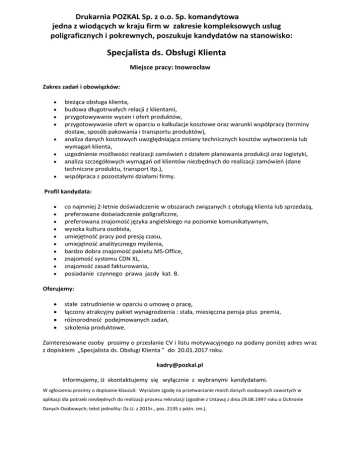 Drukarnia POZKAL Sp. z o.o. Sp. komandytowa jedna z wiodących w kraju firm w zakresie kompleksowych usług poligraficznych i pokrewnych, poszukuje kandydatów na stanowisko: Specjalista ds. Obsługi Klienta Miejsce pracy: Inowrocław Zakres zadań i obowiązków: bieżąca obsługa klienta, budowa długotrwałych relacji z klientami, przygotowywanie wycen i ofert produktów, przygotowywanie ofert w oparciu o kalkulacje kosztowe oraz warunki współpracy (terminy dostaw, sposób pakowania i transportu produktów), analiza danych kosztowych uwzględniająca zmiany technicznych kosztów wytworzenia lub wymagań klienta, uzgodnienie możliwości realizacji zamówień z działem planowania produkcji oraz logistyki, analiza szczegółowych wymagań od klientów niezbędnych do realizacji zamówień (dane techniczne produktu, transport itp.), współpraca z pozostałymi działami firmy. Profil kandydata: co najmniej 2-letnie doświadczenie w obszarach związanych z obsługą klienta lub sprzedażą, preferowane doświadczenie poligraficzne, preferowana znajomość języka angielskiego na poziomie komunikatywnym, wysoka kultura osobista, umiejętność pracy pod presją czasu, umiejętność analitycznego myślenia, bardzo dobra znajomość pakietu MS-Office, znajomość systemu CDN XL, znajomość zasad fakturowania, posiadanie czynnego prawa jazdy kat. B. Oferujemy: stałe zatrudnienie w oparciu o umowę o pracę, łączony atrakcyjny pakiet wynagrodzenia : stała, miesięczna pensja plus premia, różnorodność podejmowanych zadań, szkolenia produktowe. Zainteresowane osoby prosimy o przesłanie CV i listu motywacyjnego na podany poniżej adres wraz z dopiskiem „Specjalista ds. Obsługi Klienta ” do 20.01.2017 roku. [email protected] Informujemy, iż skontaktujemy się wyłącznie z wybranymi kandydatami. W zgłoszeniu prosimy o dopisanie klauzuli: Wyrażam zgodę na przetwarzanie moich danych osobowych zawartych w aplikacji dla potrzeb niezbędnych do realizacji procesu rekrutacji (zgodnie z Ustawą z dnia 29.08.1997 roku o Ochronie Danych Osobowych; tekst jednolity: Dz.U. z 2015r., poz. 2135 z późn. zm.).