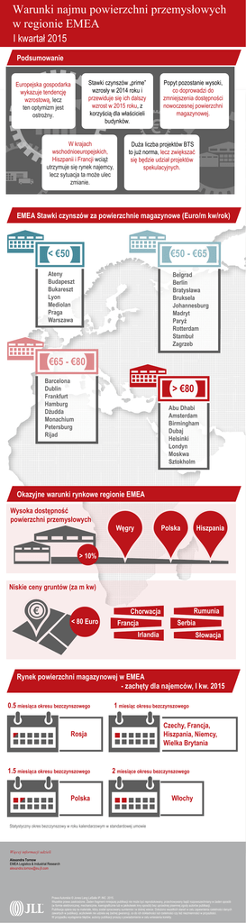 Warunki najmu powierzchni przemysłowych w regionie EMEA I kwartał 2015 Podsumowanie Stawki czynszów „prime” wzrosły w 2014 roku i przewiduje się ich dalszy wzrost w 2015 roku, z korzyścią dla właścicieli budynków. Europejska gospodarka wykazuje tendencję wzrostową, lecz ten optymizm jest ostrożny. W krajach wschodnioeuropejskich, Hiszpanii i Francji wciąż utrzymuje się rynek najemcy, lecz sytuacja ta może ulec zmianie. Popyt pozostanie wysoki, co doprowadzi do zmniejszenia dostępności nowoczesnej powierzchni magazynowej. Duża liczba projektów BTS to już norma, lecz zwiększać się będzie udział projektów spekulacyjnych. EMEA Stawki czynszów za powierzchnie magazynowe (Euro/m kw/rok) < €50 €50 - €65 Ateny Budapeszt Bukareszt Lyon Mediolan Praga Warszawa Belgrad Berlin Bratysława Bruksela Johannesburg Madryt Paryż Rotterdam Stambuł Zagrzeb €65 - €80 Barcelona Dublin Frankfurt Hamburg Dżudda Monachium Petersburg Rijad > €80 Abu Dhabi Amsterdam Birmingham Dubaj Helsinki Londyn Moskwa Sztokholm Okazyjne warunki rynkowe regionie EMEA Wysoka dostępność powierzchni przemysłowych Węgry Hiszpania Polska > 10% Niskie ceny gruntów (za m kw) < 80 Euro Rumunia Chorwacja Francja Serbia Irlandia Słowacja Rynek powierzchni magazynowej w EMEA - zachęty dla najemców, I kw. 2015 0.5 miesiąca okresu bezczynszowego 1 miesiąc okresu bezczynszowego Czechy, Francja, Hiszpania, Niemcy, Wielka Brytania Rosja 1.5 miesiąca okresu bezczynszowego 2 miesiące okresu bezczynszowego Polska Włochy Statystyczny okres bezczynszowy w roku kalendarzowym w standardowej umowie Więcej informacji udzieli Alexandra Tornow EMEA Logistics & Industrial Research [email protected] Prawa Autorskie © Jones Lang LaSalle IP, INC. 2015. Wszelkie prawa zastrzeżone. Żaden fragment niniejszej publikacji nie może być reprodukowany, przechowywany bądź rozpowszechniany w żaden sposób (w formie elektronicznej, mechanicznie, kserograficznie lub w jakikolwiek inny sposób) bez uprzedniej pisemnej zgody autorów publikacji. Publikacja opiera się na materiale, który został opracowany sumiennie i w dobrej wierze. Dołożono wszelkich starań w celu zapewnienia rzetelności danych zawartych w publikacji, aczkolwiek nie udziela się żadnej gwarancji, co do ich dokładności lub rzetelności czy też niezmienności w przyszłości. W przypadku wystąpienia błędów, autorzy publikacji proszą o powiadomienie w celu wniesienia korekty.