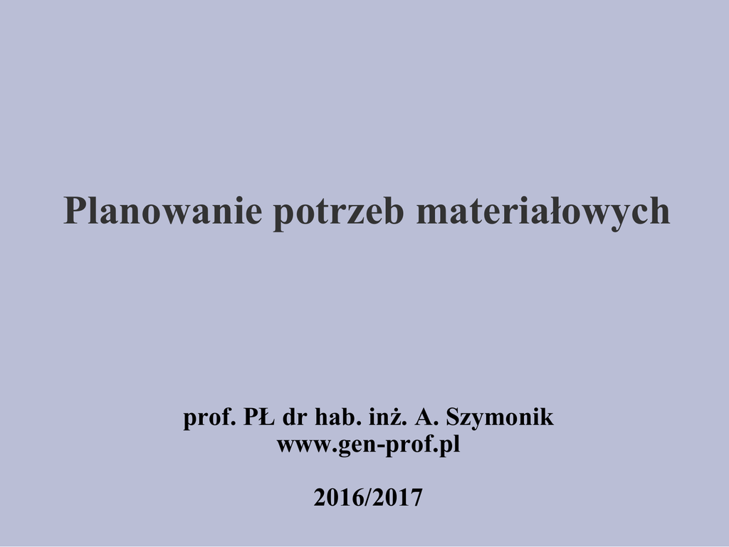 Planowanie potrzeb materiałowych prof. PŁ dr hab. inż. A. Szymonik www.gen-prof.pl 2016/2017 Planowanie zapotrzebowania materiałowego (MRP): „zbiór technik, które pomagają w zarządzaniu procesem produkcji techniki te często wspomagane są odpowiednimi aplikacjami komputerowymi”. Zasady zaopatrzenia materiałowego: • na podstawie planu produkcji (na magazyn – MTS Make to Stock, na zmówienie – MTO Make to Order); •w oparciu o zużycie (zapewniające dostawę w momencie osiągnięcia stanu minimalnego zapasu – tzw. zapasu bezpieczeństwa). 3 Dane do planowania zapasów: • struktura wyrobu; • dane o zapasach; • cykl dostaw lub cykl produkcji; • wielkość partii dostawy. 4 Rodzaje struktur wyrobu BOM – Bill of Materials • konstrukcyjna – określa funkcjonalną i konstrukcyjną konfiguracje wyrobu (podstawa tworzenia listy i wykazów części); • wytwarzania – specyfika z punktu wytwarzania; • montażowa – relacje podczas montażu. System planowania potrzeb materiałowych MRP I: • opracowany w 1957 r. przez American Production and Inventory Control Society (APICS); • system informatyczny wspomagający zarządzanie bazujące na popycie na produkty generowanym poprzez sprzedaż; cd. System planowania potrzeb materiałowych MRP I: • służy do racjonalizacji planowania, poprzez wydawanie zleceń zakupu i produkcji dokładnie w takim momencie, aby żądany produkt pojawił się w potrzebnej chwili i w wymaganej ilości. Główne cele: redukcja zapasów; dokładne określenie czasów dostaw; wyznaczenie kosztów produkcji; optymalne wykorzystanie infrastruktury; reagowanie na zmiany; kontrola realizacji etapów produkcji. Dane wejściowe dla MRP: • • • • • • • stan magazynowy; specyfikacje materiałowe; zlecenie produkcyjne; zamówienia w drodze; oferty dostawców; terminy dostaw; zapas minimalny. Dane wyjściowe z MRP: • potrzeby materiałowe; • harmonogram dostaw; • monitorowanie zapasów. Metodyka wdrożenia ZISZ w obszarze gospodarki materiałowej: 1) utworzenie indeksów materiałowych (przypisanie ofert od dostawców do indeksów); 2) utworzenie indeksów podzespołów i wyrobów; 3) powiązanie z innymi modułami ERP (np. księgowością) i obligatoryjnie z magazynem, który będzie przesyłał dokumenty z obrotów materiałowych; 4) zdefiniowanie zewnętrznych dokumentów potrzebnych do kontroli i sprawozdań. Metodyka oceny wdrożenia ZISZ w obszarze gospodarki materiałowej: • definicja celu, minimalizacja zapasu; • wybór wskaźników oceny (średnia wartość, obrót, produktywność); • analiza danych; • wyznaczenie wskaźników oceny; • synteza (łączenie) procedur redukcji stanów magazynowych; • implementacja procedur redukcji stanów magazynowych. Zastosowanie MRP I: produkcja mało asortymentowa i wieloasortymentowa; produkcja wyrobów prostych i złożonych.