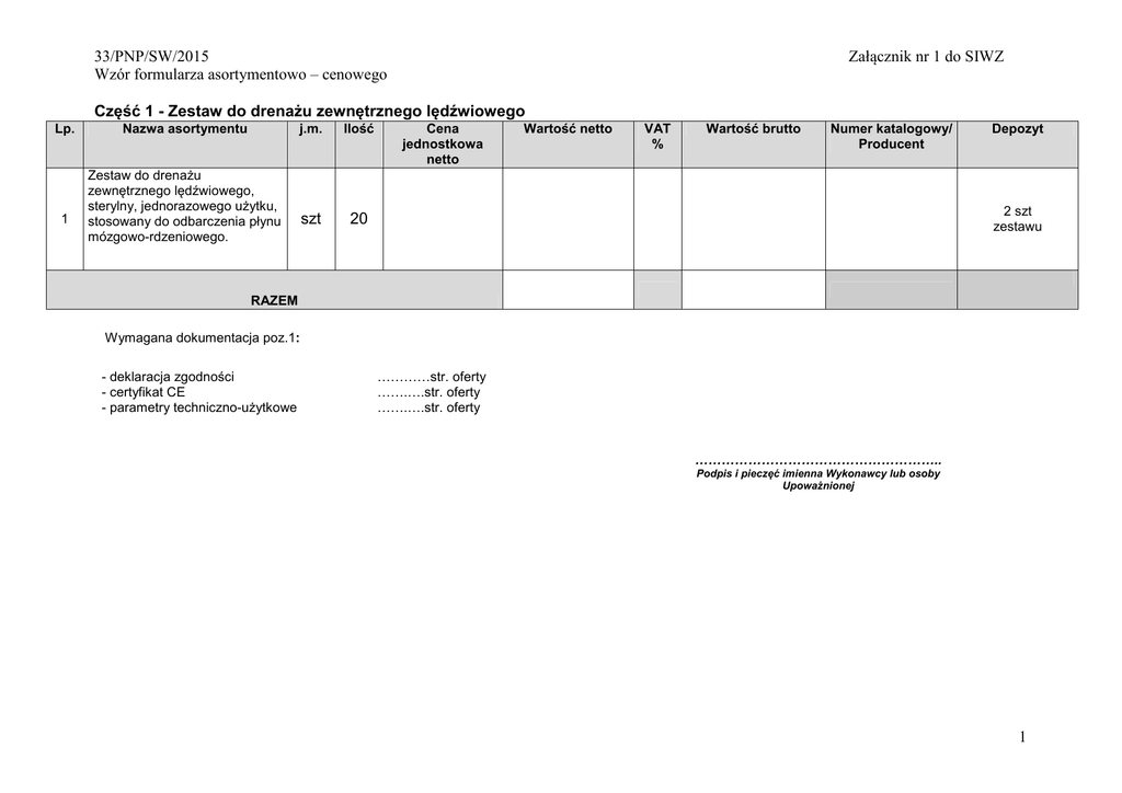 33/PNP/SW/2015 Wzór formularza asortymentowo – cenowego Załącznik nr 1 do SIWZ Część 1 - Zestaw do drenażu zewnętrznego lędźwiowego Lp. 1 Nazwa asortymentu j.m. Ilość szt 20 Zestaw do drenażu zewnętrznego lędźwiowego, sterylny, jednorazowego użytku, stosowany do odbarczenia płynu mózgowo-rdzeniowego. Cena jednostkowa netto Wartość netto VAT % Wartość brutto Numer katalogowy/ Producent Depozyt 2 szt zestawu RAZEM Wymagana dokumentacja poz.1: - deklaracja zgodności - certyfikat CE - parametry techniczno-użytkowe …………str. oferty …….….str. oferty …….….str. oferty ……………………………………………….. Podpis i pieczęć imienna Wykonawcy lub osoby Upoważnionej 1 33/PNP/SW/2015 Wzór formularza asortymentowo – cenowego Część 2 – Cewniki naczyniowe do embolektomii z balonem Lp. Nazwa asortymentu j.m. Ilość 1 Cewnik naczyniowy do embolektomii z balonem obj. balonów w zależności od rozmiarów 3F-10F: dł. 80-82 cm 3F obj. balona 0,2-0,25ml 4F obj. balona 0,7-0,75ml 5F obj. balona 1,2-1,5ml 6F – 7F obj. balona 2,5 ml 10F obj. balona 4,5ml szt 243 Cena jednostkowa netto Załącznik nr 1 do SIWZ Wartość netto VAT % Wartość brutto Numer katalogowy/ Producent RAZEM Wymagana dokumentacja poz.1: - deklaracja zgodności - certyfikat CE - parametry techniczno-użytkowe …………str. oferty …….….str. oferty …….….str. oferty ……………………………………………….. Podpis i pieczęć imienna Wykonawcy lub osoby Upoważnionej 2 33/PNP/SW/2015 Wzór formularza asortymentowo – cenowego Część 3 – Zestaw do tracheotomii przezskórnej metodą Griggsa Lp. Nazwa asortymentu j.m. Ilość 1 Jednorazowy zestaw do przezskórnej tracheotomii metodą Griggsa z wielorazowym unikalnym peanem z otworem na prowadnicę, zawierający skalpel, kaniulę z igłą i strzykawką do identyfikacji tchawicy, prowadnicę Seldingera, rozszerzało oraz rurkę tracheostomijną z mankietem niskociśnieniowym, posiadającą sztywny mandryn z otworem na prowadnicę Seldingera. Pakowany na jednej, sztywnej tacy umożliwiającej szybkie otwarcie zestawu. Sterylny. Rozmiary: 7,00 -8,00 szt 6 Cena jednostkowa netto Załącznik nr 1 do SIWZ Wartość netto VAT % Wartość brutto Numer katalogowy/ Producent RAZEM Wymagana dokumentacja poz.1: - deklaracja zgodności - certyfikat CE - parametry techniczno-użytkowe …………str. oferty …….….str. oferty …….….str. oferty ……………………………………………….. Podpis i pieczęć imienna Wykonawcy lub osoby Upoważnionej 3