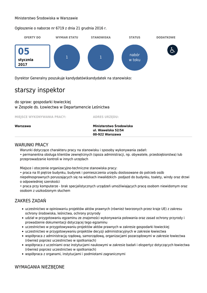 Ministerstwo Środowiska w Warszawie Ogłoszenie o naborze nr 6719 z dnia 21 grudnia 2016 r. OFERTY DO WYMIAR ETATU STANOWISKA STATUS 1 1 nabór w toku 05 stycznia 2017 DODATKOWE Dyrektor Generalny poszukuje kandydatów\kandydatek na stanowisko: starszy inspektor do spraw: gospodarki łowieckiej w Zespole ds. Łowiectwa w Departamencie Leśnictwa MIEJSCE WYKONYWANIA PRACY: ADRES URZĘDU: Warszawa Ministerstwo Środowiska ul. Wawelska 52/54 00-922 Warszawa WARUNKI PRACY Warunki dotyczące charakteru pracy na stanowisku i sposoby wykonywania zadań: • permanentna obsługa klientów zewnętrznych (spoza administracji, np. obywatele, przedsiębiorstwa) lub przeprowadzanie kontroli w innych urzędach Miejsce i otoczenie organizacyjno-techniczne stanowiska pracy: • praca na III piętrze budynku, budynek i pomieszczenia urzędu dostosowane do potrzeb osób niepełnosprawnych poruszających się na wózkach inwalidzkich- podjazd do budynku, toalety, windy oraz drzwi o odpowiedniej szerokości • praca przy komputerze - brak specjalistycznych urządzeń umożliwiających pracę osobom niewidomym oraz osobom z uszkodzonym słuchem ZAKRES ZADAŃ uczestnictwo w opiniowaniu projektów aktów prawnych (również tworzonych przez kraje UE) z zakresu ochrony środowiska, leśnictwa, ochrony przyrody udział w przygotowaniu egzaminu ze znajomości wykonywania polowania oraz zasad ochrony przyrody i prowadzenie dokumentacji dotyczącej tego egzaminu uczestnictwo w przygotowywaniu projektów aktów prawnych w zakresie gospodarki łowieckiej uczestnictwo w przygotowywaniu projektów decyzji administracyjnych w zakresie łowiectwa współpraca z administracją rządową, samorządową, organizacjami pozarządowymi w zakresie łowiectwa (również poprzez uczestnictwo w spotkaniach) współpraca z uczelniami oraz instytucjami naukowymi w zakresie badań i ekspertyz dotyczących łowiectwa (również poprzez uczestnictwo w spotkaniach) współpraca z organami, instytucjami i podmiotami zagranicznymi WYMAGANIA NIEZBĘDNE Wykształcenie: wyższe na kierunku leśnictwo doświadczenie zawodowe: 6 miesięcy w obszarze leśnictwa lub ochrony środowiska lub łowiectwa znajomość języka angielskiego na poziomie dobrym (B2) znajomość ustaw: Prawo łowieckie; o ochronie przyrody komunikacja myślenie analityczne organizacja pracy i orientacja na osiąganie celów współpraca Posiadanie obywatelstwa polskiego Korzystanie z pełni praw publicznych Nieskazanie prawomocnym wyrokiem za umyślne przestępstwo lub umyśle przestępstwo skarbowe WYMAGANIA DODATKOWE wykształcenie wyższe lub studia podyplomowe z zakresu nauk prawnych lub ukończone studium podyplomowe o specjalności gospodarki łowieckiej i ochrony zwierzyny szkolenia tematyczne organizowane przez Polski Związek Łowiecki lub Generalną Dyrekcję Ochrony Środowiska lub Państwowe Gospodarstwo Leśne „Lasy Państwowe” znajomość ustaw: o ochronie zdrowia zwierząt i zwalczaniu chorób zakaźnych zwierząt; o lasach znajomość przepisów Unii Europejskiej tj. dyrektywa ptasia, siedliskowa znajomość Kodeksu postępowania administracyjnego znajomość zasad techniki prawodawczej znajomość rozporządzenia Ministra Środowiska w sprawie sposobu postępowania przy szacowaniu szkód oraz wypłat odszkodowań za szkody w uprawach i płodach rolnych znajomość rozporządzenia Ministra Środowiska w sprawie szczegółowych warunków wykonywania polowania i znakowania tusz DOKUMENTY I OŚWIADCZENIA NIEZBĘDNE Życiorys/CV i list motywacyjny Kopie dokumentów potwierdzających spełnienie wymagania niezbędnego w zakresie wykształcenia Kopie dokumentów potwierdzających 6 miesięcy doświadczenia zawodowego w obszarze leśnictwa lub ochrony środowiska lub łowiectwa (dokumenty zawierające informacje potwierdzające okres zatrudnienia, obszar i rodzaj wykonywanych zadań np. świadectwa pracy, zaświadczenia o zatrudnieniu, referencje lub oświadczenie o spełnianiu tego wymogu- wzór treści wymaganego oświadczenia jest zamieszczony na stronie https://bip.mos.gov.pl/praca/wzory-oswiadczen/) W przypadku ukończenia studiów wyższych na uczelni zagranicznej, prosimy o przesłanie kopii potwierdzenia uznania dyplomu przez Ministerstwo Nauki i Szkolnictwa Wyższego lub nostryfikacji dyplomu oraz tłumaczenie przysięgłe dyplomu W przypadku dokumentów potwierdzających doświadczenie zawodowe sporządzonych w języku obcym prosimy o załączenie tłumaczenia na język polski Oświadczenie o posiadaniu obywatelstwa polskiego albo kopia dokumentu potwierdzającego posiadanie polskiego obywatelstwa Oświadczenie o wyrażeniu zgody na przetwarzanie danych osobowych do celów naboru Oświadczenie o korzystaniu z pełni praw publicznych Oświadczenie o nieskazaniu prawomocnym wyrokiem za umyślne przestępstwo lub umyślne przestępstwo skarbowe DOKUMENTY I OŚWIADCZENIA DODATKOWE kopia dokumentu potwierdzającego niepełnosprawność - w przypadku kandydatek/kandydatów, zamierzających skorzystać z pierwszeństwa w zatrudnieniu w przypadku, gdy znajdą się w gronie najlepszych kandydatek/kandydatów kopia dokumentów potwierdzających wykształcenie wyższe lub studia podyplomowe z zakresu nauk prawnych lub ukończone studium podyplomowe o specjalności gospodarki łowieckiej i ochrony zwierzyny kopia dokumentów potwierdzających szkolenia tematyczne organizowane przez Polski Związek Łowiecki lub Generalną Dyrekcję Ochrony Środowiska lub Państwowe Gospodarstwo Leśne „Lasy Państwowe” TERMINY I MIEJSCE SKŁADANIA DOKUMENTÓW Dokumenty należy złożyć do: 05 stycznia 2017 r. Decyduje data: stempla pocztowego / osobistego dostarczenia oferty do urzędu Miejsce składania dokumentów: Ministerstwo Środowiska Biuro Dyrektora Generalnego ul. Wawelska 52/54 00-922 Warszawa W zamkniętej kopercie oznaczonej numerem referencyjnym DLstin51/2016 INNE INFORMACJE: W miesiącu poprzedzającym datę upublicznienia ogłoszenia wskaźnik zatrudnienia