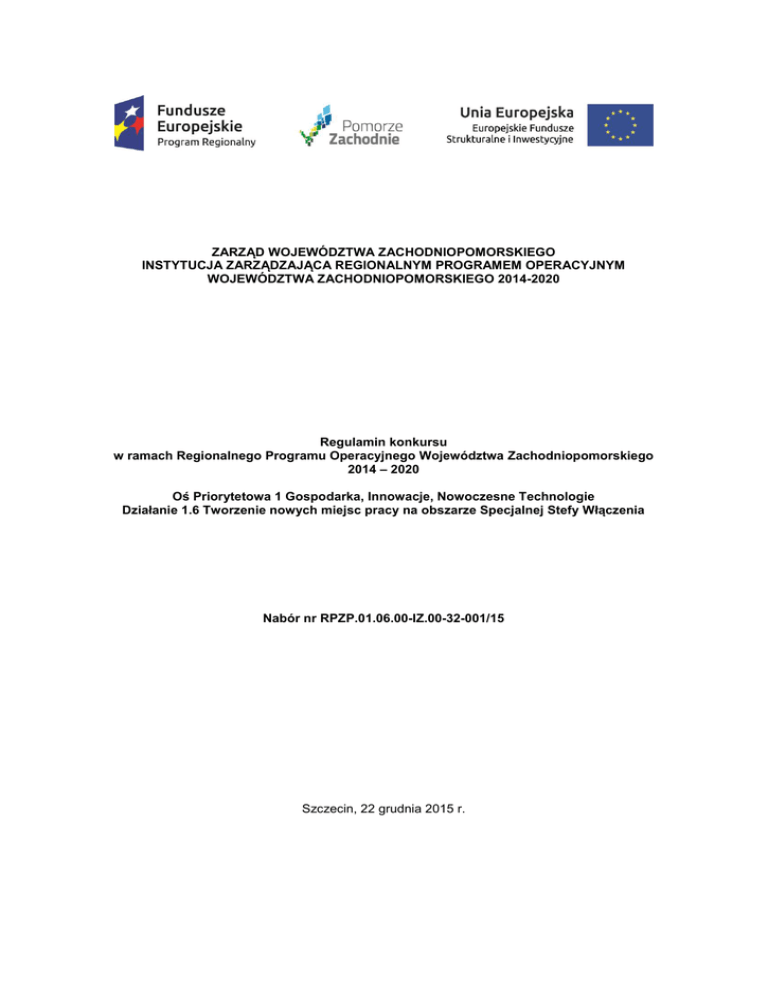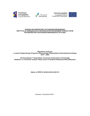 ZARZĄD WOJEWÓDZTWA ZACHODNIOPOMORSKIEGO INSTYTUCJA ZARZĄDZAJĄCA REGIONALNYM PROGRAMEM OPERACYJNYM WOJEWÓDZTWA ZACHODNIOPOMORSKIEGO 2014-2020 Regulamin konkursu w ramach Regionalnego Programu Operacyjnego Województwa Zachodniopomorskiego 2014 – 2020 Oś Priorytetowa 1 Gospodarka, Innowacje, Nowoczesne Technologie Działanie 1.6 Tworzenie nowych miejsc pracy na obszarze Specjalnej Stefy Włączenia Nabór nr RPZP.01.06.00-IZ.00-32-001/15 Szczecin, 22 grudnia 2015 r. Regulamin konkursu w ramach Regionalnego Programu Operacyjnego Województwa Zachodniopomorskiego 2014 – 2020 Działanie 1.6 Spis treści WYKAZ SKRÓTÓW ................................................................................................................................ 4 SŁOWNIK POJĘĆ .................................................................................................................................. 4 PODSTAWY PRAWNE ........................................................................................................................... 5 ROZDZIAŁ 1 PRZEDMIOT KONKURSU I WARUNKI UCZESTNICTWA ............................................. 7 1.1 PRZEDMIOT I FORMA KONKURSU ORAZ INSTYTUCJA ORGANIZUJĄCA KONKURS ..................................... 7 1.2 TYPY PROJEKTÓW ............................................................................................................................ 9 1.3 PODMIOTY UPRAWNIONE DO UBIEGANIA SIĘ O DOFINANSOWANIE ...................................................... 11 ROZDZIAŁ 2 ZASADY FINANSOWANIA ............................................................................................ 16 2.1 KWOTA PRZEZNACZONA NA DOFINANSOWANIE PROJEKTÓW W KONKURSIE ........................................ 16 2.2 MAKSYMALNY POZIOM DOFINANSOWANIA ORAZ MAKSYMALNA KWOTA DOFINANSOWANIA PROJEKTU. .. 16 2.3 ZEWNĘTRZNE ŹRÓDŁA FINANSOWANIA PROJEKTU ............................................................................ 16 2.4 KUMULACJA POMOCY PUBLICZNEJ ................................................................................................... 16 ROZDZIAŁ 3 KWALIFIKOWALNOŚĆ WYDATKÓW .......................................................................... 18 3.1 RAMY CZASOWE KWALIFIKOWALNOŚCI............................................................................................. 18 3.2 OCENA KWALIFIKOWALNOŚCI WYDATKU .......................................................................................... 19 3.3 W ARUNKI KWALIFIKOWALNOŚCI WYDATKU ....................................................................................... 19 3.4 ZASADA FAKTYCZNEGO PONIESIENIA WYDATKU ................................................................................ 19 3.5 ZAKAZ PODWÓJNEGO FINANSOWANIA .............................................................................................. 20 3.6 W YDATKI KWALIFIKOWALNE W DZIAŁANIU 1.6 ................................................................................... 21 3.7 W YDATKI NIEKWALIFIKOWALNE ....................................................................................................... 23 ROZDZIAŁ 4 WSKAŹNIKI .................................................................................................................... 24 ROZDZIAŁ 5 WNIOSEK O DOFINANSOWANIE................................................................................ 28 ROZDZIAŁ 6 TERMIN, FORMA I MIEJSCE SKŁADANIA WNIOSKÓW O DOFINANSOWANIE ..... 31 6.1 TERMIN SKŁADANIA WNIOSKÓW ....................................................................................................... 31 6.2 FORMA I MIEJSCE SKŁADANIA WNIOSKÓW......................................................................................... 31 ROZDZIAŁ 7 PROCEDURA WYBORU PROJEKTÓW ....................................................................... 31 7.1. CZAS TRWANIA OCENY .................................................................................................................. 31 7.2. ZASADY OGÓLNE PROCESU WYBORU PROJEKTÓW ........................................................................... 31 7.2.1 OCENA WSTĘPNA ........................................................................................................................ 33 7.2.2 OCENA MERYTORYCZNA I STOPNIA ............................................................................................... 35 7.2.3 OCENA MERYTORYCZNA II STOPNIA .............................................................................................. 36 7.3 INFORMACJA O WYNIKACH OCENY ................................................................................................... 36 7.4 ŚRODKI ODWOŁAWCZE .................................................................................................................. 36 2/43 Regulamin konkursu w ramach Regionalnego Programu Operacyjnego Województwa Zachodniopomorskiego 2014 – 2020 Działanie 1.6 ROZDZIAŁ 8 PODPISANIE UMOWY O DOFINANSOWANIE ............................................................ 38 ROZDZIAŁ 9 ZASADY DOTYCZĄCE REALIZACJI PROJEKTU ....................................................... 39 9.1 ROZLICZENIE PROJEKTU I WYPŁATA DOFINANSOWANIA ..................................................................... 39 9.2 ZMIANY W PROJEKCIE ..................................................................................................................... 39 9.3 PROWADZENIE WYODRĘBNIONEJ EWIDENCJI KSIĘGOWEJ .................................................................. 40 9.4 PONOSZENIE WYDATKÓW W RAMACH PROJEKTU .............................................................................. 40 9.5 KONTROLA PROJEKTU .................................................................................................................... 41 9.6 TRWAŁOŚĆ PROJEKTU ....................................................................................................................