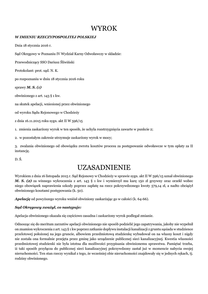 WYROK W IMIENIU RZECZYPOSPOLITEJ POLSKIEJ Dnia 18 stycznia 2016 r. Sąd Okręgowy w Poznaniu IV Wydział Karny Odwoławczy w składzie: Przewodniczący SSO Dariusz Śliwiński Protokolant: prot. sąd. N. K. po rozpoznaniu w dniu 18 stycznia 2016 roku sprawy M. S. (1) obwinionego z art. 143 § 1 kw. na skutek apelacji, wniesionej przez obwinionego od wyroku Sądu Rejonowego w Chodzieży z dnia 16.11.2015 roku sygn. akt II W 596/15 1. zmienia zaskarżony wyrok w ten sposób, że uchyla rozstrzygnięcia zawarte w punkcie 2; 2. w pozostałym zakresie utrzymuje zaskarżony wyrok w mocy; 3. zwalania obwinionego od obowiązku zwrotu kosztów procesu za postępowanie odwoławcze w tym opłaty za II instancję. D. Ś. UZASADNIENIE Wyrokiem z dnia 16 listopada 2015 r. Sąd Rejonowy w Chodzieży w sprawie sygn. akt II W 596/15 uznał obwinionego M. S. (2) za winnego wykroczenia z art. 143 § 1 kw i wymierzył mu karę 150 zł grzywny oraz orzekł wobec niego obowiązek naprawienia szkody poprzez zapłatę na rzecz pokrzywdzonego kwoty 579,14 zł, a nadto obciążył obwinionego kosztami postępowania (k. 50). Apelację od powyższego wyroku wniósł obwiniony zaskarżając go w całości (k. 64-66). Sąd Okręgowy zważył, co następuje: Apelacja obwinionego okazała się częściowo zasadna i zaskarżony wyrok podlegał zmianie. Odnosząc się do meritum zarzutów apelacji obwinionego nie sposób podzielić jego zapatrywania, jakoby nie wypełnił on znamion wykroczenia z art. 143 § 1 kw poprzez zatkanie dopływu instalacji kanalizacji z gruntu sąsiada w studzience przelotowej położonej na jego gruncie, albowiem przedmiotową studzienkę wybudował on na własny koszt i nigdy nie została ona formalnie przejęta przez gminę jako urządzenie publicznej sieci kanalizacyjnej. Kwestia własności przedmiotowej studzienki nie była istotna dla możliwości przypisania obwinionemu sprawstwa. Pamiętać trzeba, iż taki sposób przyłącza do publicznej sieci kanalizacyjnej pokrzywdzony zastał już w momencie nabycia swojej nieruchomości. Ten stan rzeczy wynikał z tego, że wcześniej obie nieruchomości znajdowały się w jednych rękach, tj. rodziny obwinionego. W takich okolicznościach nieuzgodnione wcześniej z oskarżycielem posiłkowym zatkanie przez obwinionego wylotu instalacji kanalizacji z jego nieruchomości w studzience przelotowej położonej na jego nieruchomości było równoznaczne z uniemożliwieniem korzystania przez pokrzywdzonej z urządzeń przeznaczonych do użytku publicznego, tj. z publicznej sieci kanalizacyjnej. Nie ulega również wątpliwości, iż działanie obwinionego mogło być kwalifikowane jako zachowanie ze swawoli. Obwiniony mimo zatkania wylotu kanalizacji z sąsiedniego gruntu nie podjął żadnych prac przy studzience przelotowej, mimo iż zachowanie swoje tłumaczył koniecznością remontu studzienki. Jednocześnie nie zatkał wlotu instalacji odprowadzającej nieczystości z własnego domu. W tym miejscu Sąd Okręgowy pragnie podkreślić, iż nie sposób dać wiary obwinionemu, że zamieszkując w swoim domu, mógł nie wytwarzać żadnych nieczystości i w związku z tym wylotu kanalizacji ze swojego domu nie musiał zatykać. W końcu, jak już wyżej wspomniano, obwiniony nie uprzedził sąsiada o planowanym remoncie studzienki i nie poczynił z nim w tym zakresie żadnych uzgodnień, czego należałoby oczekiwać przy rzeczywistym planowaniu tego rodzaju prac. Podsumowując, sprawstwo i wina zostały obwinionemu przypisane przez Sąd I instancji prawidłowo. Przechodząc do kwestii wymiaru kary Sąd Okręgowy pragnie zauważyć, iż nie sposób dopatrzyć się w wymierzonej obwinionemu grzywnie w wysokości 150 zł przesłanek rażącej surowości. Wymiar kary ocenić należy jako współmierny do stopnia społecznej szkodliwości czynu obwinionego oraz stopnia jego zawinienia. Poza tym zważywszy na sytuację rodziną obwinionego – żonaty, nie ma nikogo na utrzymaniu oraz uzyskiwane przez niego dochody z renty – 1600 zł miesięcznie, nie można uznać, iż orzeczonej wobec niej grzywny w tej kwocie nie będzie w stanie uiścić. Nie sposób podzielić jednak trafności rozstrzygnięcia Sądu Rejonowego w przedmiocie naprawienia szkody wyrządzonej przez obwinionego oskarżycielowi posiłkowemu. Sąd I instancji wskazał, iż poniósł on szkodę z uwagi na wykonanie na własny koszt niezależnego przyłącza do sieci kanalizacyjnej swojej nieruchomości. Z tym zapatrywaniem zgodzić się nie sposób. Szkoda majątkowa winna być zwiększeniem pasywów bądź też zmniejszeniem aktywów majątku oskarżyciela posiłkowego, który pozostaje w bezpośrednim związku z czynem obwinionego. Bezprawny skutek zachowania oskarżonego został usunięty poprzez odblokowanie wylotu instalacji kanalizacji z nieruchomości oskarżyciela posiłkowego w studzience przelotowej położonej na gruncie obwinionego po interwencji w urzędzie gminy. Jednocześnie oskarżyciel posiłkowy nie wykazał, aby w jego budynku doszło do jakichkolwiek uszkodzeń wskutek zalania ściekami, których odpływ został tymczasowo przez obwinionego zablokowany. W takich okolicznościach stwierdzić należało brak przesłanek wskazujących, iż oskarżyciel posiłkowy poniósł na skutek zachowania obwinionego realną szkodę majątkową. Oskarżyciel posiłkowy podjął własną inicjatywę w zakresie uniezależnienia zrzutu swoich nieczystości do gminnego kolektora sanitarnego od wykorzystywania studzienki przelotowej na gruncie obwinionego. Jeżeli oskarżyciel posiłkowy jest przekonany, iż pokrzywdzony zobowiązany jest partycypować w kosztach tej inwestycji, winien poszukiwać ochrony prawnej swoich roszczeń w tym zakresie na drodze postępowania cywilnego. W tym stanie rzeczy Sąd Okręgowy na podstawie art. 437 § 1 kpk w zw. z art. 109 § 2 kpw zmienił zaskarżony wyrok w ten sposób, że uchylił rozstrzygniecie zawarte w punkcie 2 a w pozostałym zakresie utrz