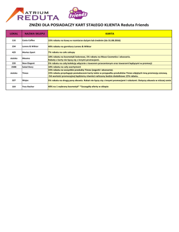 ZNIŻKI DLA POSIADACZY KART STAŁEGO KLIENTA Reduta Friends LOKAL NAZWA SKLEPU KARTA 116 Costa Coffee 15% rabatu na kawy w rozmiarze dużym lub średnim (do 31.08.2016) 234 Lorens & Wiktor 40% rabatu na garnitury Lorens & Wiktor 429 Martes Sport 7% rabatu na całe zakupy stoisko Mexmo 239 New Elegant 250B Salad Story 10% rabatu na kosmetyki kolorowe, 5% rabatu na Muse Cosmetics i akcesoria. Rabaty z karty nie łączą się z innymi promocjami. 5% rabatu na całą kolekcję włącznie z towarem przecenionym oraz towarami będącymi w promocji 10% rabatu na cały asortyment 15% rabatu na wszystkie produkty Timex (zegarki i akcesoria). 15% rabatu przysługuje posiadaczom karty także w przypadku produktów Timex objętych inną promocją cenową. Od wartości promocyjnej będziemy również naliczany bedzie dodatkowe 15% rabatu. stoisko Timex 227 Wojas 5% rabatu na drugą parę obuwia. Rabat nie łączy się z innymi promocjami i rabatami. Dotyczy obuwia w niższej cenie 164 Yves Rocher 40% na 1 wybrany kosmetyk* *Szczegóły oferty w sklepie