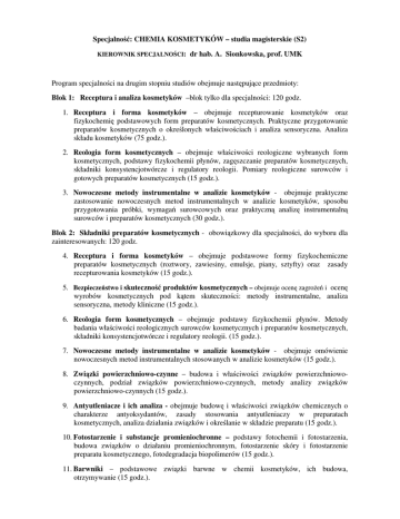 Specjalność: CHEMIA KOSMETYKÓW – studia magisterskie (S2) KIEROWNIK SPECJALNOŚCI: dr hab. A. Sionkowska, prof. UMK Program specjalności na drugim stopniu studiów obejmuje następujące przedmioty: Blok 1: Receptura i analiza kosmetyków –blok tylko dla specjalności: 120 godz. 1. Receptura i forma kosmetyków – obejmuje recepturowanie kosmetyków oraz fizykochemię podstawowych form preparatów kosmetycznych. Praktyczne przygotowanie preparatów kosmetycznych o określonych właściwościach i analiza sensoryczna. Analiza składu kosmetyków (75 godz.). 2. Reologia form kosmetycznych – obejmuje właściwości reologiczne wybranych form kosmetycznych, podstawy fizykochemii płynów, zagęszczanie preparatów kosmetycznych, składniki konsystencjotwórcze i regulatory reologii. Pomiary reologiczne surowców i gotowych preparatów kosmetycznych (15 godz.). 3. Nowoczesne metody instrumentalne w analizie kosmetyków - obejmuje praktyczne zastosowanie nowoczesnych metod instrumentalnych w analizie kosmetyków, sposobu przygotowania próbki, wymagań surowcowych oraz praktyczną analizę instrumentalną surowców i preparatów kosmetycznych (30 godz.). Blok 2: Składniki preparatów kosmetycznych - obowiązkowy dla specjalności, do wyboru dla zainteresowanych: 120 godz. 4. Receptura i forma kosmetyków – obejmuje podstawowe formy fizykochemiczne preparatów kosmetycznych (roztwory, zawiesiny, emulsje, piany, sztyfty) oraz zasady recepturowania kosmetyków (15 godz.). 5. Bezpieczeństwo i skuteczność produktów kosmetycznych – obejmuje ocenę zagrożeń i ocenę wyrobów kosmetycznych pod kątem skuteczności: metody instrumentalne, analiza sensoryczna, metody kliniczne (15 godz.). 6. Reologia form kosmetycznych – obejmuje podstawy fizykochemii płynów. Metody badania właściwości reologicznych surowców kosmetycznych i preparatów kosmetycznych, składniki konsystencjotwórcze i regulatory reologii. (15 godz.). 7. Nowoczesne metody instrumentalne w analizie kosmetyków - obejmuje omówienie nowoczesnych metod instrumentalnych stosowanych w analizie kosmetyków (15 godz.). 8. Związki powierzchniowo-czynne – budowa i właściwości związków powierzchniowoczynnych, podział związków powierzchniowo-czynnych, metody analizy związków powierzchniowo-czynnych (15 godz.). 9. Antyutleniacze i ich analiza - obejmuje budowę i właściwości związków chemicznych o charakterze antyoksydantów, zasady stosowania antyutleniaczy w preparatach kosmetycznych, analiza działania związków i określanie w składzie preparatu (15 godz.). 10. Fotostarzenie i substancje promieniochronne – podstawy fotochemii i fotostarzenia, budowa związków o działaniu promieniochronnym, fotostarzenie skóry i fotostarzenie preparatu kosmetycznego, fotodegradacja biopolimerów (15 godz.). 11. Barwniki – podstawowe związki barwne w chemii kosmetyków, ich budowa, otrzymywanie (15 godz.). Wykaz przedmiotów bloku specjalizacyjnego CHEMIA KOSMETYKÓW (tylko dla specjalności) CP Przedmiot 10 CP 5 RECEPTURA I ANALIZA KOSMETYKÓW Receptura i forma kosmetyków 2 Reologia form kosmetycznych Nowoczesne metody instrumentalne w analizie kosmetyków 3 Wymiar (godz) Razem 120 Wymiar (godz) Wykład Wymiar (godz) laboratorium 105 75 - 15 - 30 - Wymiar (godz) ćwiczenia 15 60 15 A.Sionkowska J.Skopińska A.Sionkowska J.Kozłowska A.Płanecka 15 K.Lewandowska 30 M. Kurzawa A.Jastrzeębska Bloku zajęć specjalnościowych CHEMIA KOSMETYKÓW (obowiązkowy dla specjalności, do wyboru dla zainteresowanych) CP Przedmiot 16 CP 2 SKŁADNIKI PREPARATÓW KOSMETYCZNYCH Receptura i forma kosmetyku Reologia form kosmetycznych Bezpieczeństwo i skuteczność produktów kosmetycznych Nowoczesne metody instrumentalne w analizie kosmetyków Związki powierzchniowoczynne Antyutleniacze i ich analiza 2 2 2 2 2 2 2 Fotostarzenie i substancje promieniochronne Barwniki Wymiar (godz) Razem 120 15 15 15 Wymiar (godz) Wykład 120 15 A. Sionkowska 15 K. Lewandowska 15 J. Kozłowska Wymiar (godz) laboratorium - Wymiar (godz) ćwiczenia - - - - - - - 15 15 E. Szłyk - - 15 15 M.Wełniak 15 A.SzydłowskaCzerniak 15 A.Sionkowska 15 K. Aleksandrzak - - - - - - - - 15 15 15