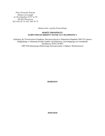 Piotr Porayski-Pomsta tłumacz przysięgły ul. Krochmalna 45/47 m 70 00-864 Warszawa 022 620 30 72/ 022 389 70 72 tłumaczenie z języka francuskiego SKRÓT PROSPEKTU SUBFUNDUSZ KREDYT BANK CE CHAMPIONS 1 Należący do Towarzystwa Funduszy Inwestycyjnych o Zmiennym Kapitale (SICAV) prawa belgijskiego o zmiennej liczbie tytułów uczestnictwa, inwestującego na warunkach Dyrektywy 85/611/EWG OPCVM (Instytucja Zbiorowego Inwestowania w Papiery Wartościowe) HORIZON 30/04/2010 Skrót Prospektu składa się z następujących dokumentów: Informacji dotyczących Sicav Informacji dotyczących subfunduszu Załącznika zawierającego informacje podlegające corocznej aktualizacji W razie rozbieżności między wersją francuską prospektu a publikacjami w innych językach, obowiązująca będzie wersja francuska. Tytuły uczestnictwa niniejszej Instytucji Zbiorowego Inwestowania (OPC), ani subfunduszy z niniejszej OPC nie mogą być oferowane ani sprzedawane w krajach, w których nie dokonano odpowiedniego zgłoszenia lokalnym władzom. Ograniczenie sprzedaży: Tytuły uczestnictwa niniejszej Instytucji Zbiorowego Inwestowania (OPC), ani subfunduszy z niniejszej OPC nie mogą być oferowane ani sprzedawane osobom ze Stanów Zjednoczonych Ameryki ani rezydentom Kanady. Szerzej na temat powyższego ograniczenia sprzedaży mowa jest w informacjach dodatkowych dotyczących Sicav, gdzie podano dane nie uwzględnione w Skrócie Prospektu, w części 12.5. pt. Ograniczenie sprzedaży określonym osobom. INFORMACJE DOTYCZĄCE SICAV 1. Nazwa Horizon 2. Data utworzenia 22 lutego 1993 r. 3. Czas trwania Nieoznaczony 4. Państwo członkowskie, w którym Sicav posiada siedzibę zgodnie ze statutem Belgia 5. Statut Sicav złożone z wielu subfunduszy, inwestujące na warunkach przewidzianych w dyrektywie 85/611/EWG, podlegające w zakresie prowadzonej działalności i inwestowania ustawie z dnia 20 lipca 2004 roku w sprawie niektórych form zarządzania wspólnymi portfelami inwestycyjnymi. We wzajemnych stosunkach między inwestorami, każdy subfundusz traktowany jest jak odrębny podmiot. Inwestor posiada prawo wyłącznie do aktywów i rentowności subfunduszu, w który zainwestował. Zobowiązania danego subfunduszu zabezpieczone są wyłącznie aktywami z tego subfunduszu. 6. Typ zarządu Sicav wskazało spółkę zarządzającą instytucjami wspólnego inwestowania (OPC) : KBC Asset Management S.A., avenue du Port 2, 1080 Bruksela. 7. Umocowanie do zarządzania portfelem inwestycyjnym Sprawy dotyczące zlecenia zarządzania portfelem omówione są w informacjach dotyczących subfunduszu. 8. Obsługa finansowa Obsługę finansową w Belgii zapewni: Centea SA, Mechelsesteenweg 180, B-2018 Antwerpia KBC Bank S.A. avenue du Port 2, B-1080 Bruksela CBC Banque SA, Grand Place 5, B-1000 Bruksela 9. Dystrybucja KBC Asset Management SA, 5, Place de la Gare, L-1616 Luksemburg 10. Depozytariusz KBC Bank S.A. avenue du Port 2, B-1080 Bruksela 11. Biegły rewident Deloitte Réviseurs d’Entreprises SC s.f.d. SCRL, reprezentowany przez Pana Frank Verhaegen, biegłego rewidenta przy Komisji Bankowej, Finansowej i Ubezpieczeniowej, Lange Lozanastraat 270, B2018 Antwerpia. 12. Oferujący KBC 13. Zasady opodatkowania Sicav : Roczny podatek w wysokości 0,08%, pobierany od zainwestowanych kwot netto w Belgii, na 31 grudnia roku poprzedzającego. Odzyskanie podatków potrącanych u źródła od dywidend belgijskich i dochodów osiągniętych za granicą uzyskanych przez Sicav (zgodnie z umowami o unikaniu podwójnego opodatkowania). Zasady opodatkowania dochodów i zysków osiągniętych przez inwestora uzależnione są od prawa, któremu podlega ze względu na swój osobisty status . W razie wątpliwości co do obowiązującego prawa, inwestor obowiązany jest zasięgnąć osobiście informacji u osób kompetentnych lub profesjonalnych doradców. 14. Informacje dodatkowe 14.1. Źródła informacji Prospekt, statut, roczne i półroczne sprawozdania, a także pełna informacja dotyczącą innych subfunduszy dostępne są bezpłatnie, po złożeniu odpowiedniego wniosku przed lub po subskrypcji tytułów uczestnictwa, w instytucjach prowadzących obsługę finansową. Łączne opłaty dotyczące wysokości uzyskanych kwot, a także stawki związane z obrotem portfela za wcześniejsze okresy dostępne są w siedzibie Sicav, avenue du Port 2, 1080 Bruksela. Następujące dokumenty i informacje dostępne są na stronie www.kbcam.be: skrót prospektu, najnowsze opublikowane roczne lub półroczne sprawozdanie. 14.2. Właściwe władze Komisja Bankowa, Finansowa i Ubezpieczeniowa (CBFA) Rue du Congrès 12-14 1000 Bruksela Skrót Prospektu ogłoszony jest po zatwierdzeniu go przez CBFA, zgodnie z art. 53, §1 ustawy z dnia 20 lipca 2004 w sprawie niektórych form zbiorowego zarządzania portfelem inwestycyjnym. Zatwierdzenie nie stanowi w żadnym razie oceny trafności ani jakości oferty, ani też sytuacji podmiotu odpowiedzialnego. 14.3. Osoba odpowiedzialna/ osoby odpowiedzialne za treść prospektu i skrótu prospektu: Zarząd Sicav. Wedle wiedzy Zarządu Sicav, dane w prospekcie i w skrócie prospektu są zgodne ze stanem faktycznym i nie zawierają braków mogących zmniejszyć ich znaczenie. 14.4. Miejsce, w którym dostępne są w razie potrzeby informacje dodatkowe Service Product and Knowledge Management – APC KBC Asset Management SA Avenue du Port 2 1080 Bruksela Tel : KBC-Fund Phone 070 69 52 90 (N) – 070 69 52 91 (F) (od poniedziałku do piątku w godzinach od 8 do 22, w soboty od godziny 9 do 17). INFORMACJE DOTYCZĄCE SUBFUNDUSZU KREDYT BANK CE CHAMPIONS 1 1. Prezentacja 1.1. Nazwa Kredy Bank CE CHAMPIONS 1 1.2. Data utworzenia 10 października 2007 r. 1.3. Czas trwania Czas oznaczony do 28 lutego 2013 r. 1.4. Notowanie na giełdzie Nie dotyczy 1.5. Zarządzanie portfelem inwestycyjnym: Spółka zarządzająca zleca zarząd merytoryczny nad portfelem, z wyłączeniem utworzenia i aktualizacji technicznej i pr