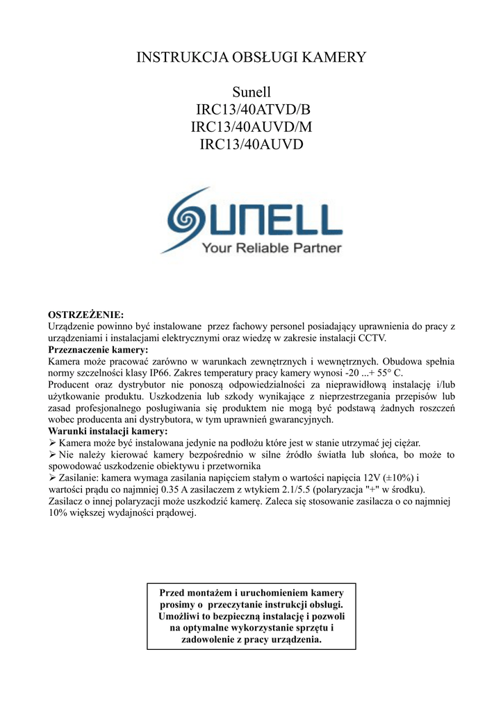INSTRUKCJA OBSŁUGI KAMERY Sunell IRC13/40ATVD/B IRC13