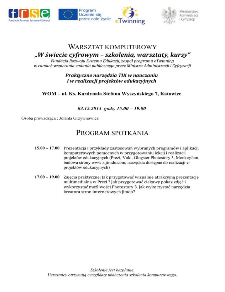 WARSZTAT KOMPUTEROWY „W świecie cyfrowym – szkolenia, warsztaty, kursy” Fundacja Rozwoju Systemu Edukacji, zespół programu eTwinning w ramach wspierania zadania publicznego przez Ministra Administracji i Cyfryzacji Praktyczne narzędzia TIK w nauczaniu i w realizacji projektów edukacyjnych WOM – ul. Ks. Kardynała Stefana Wyszyńskiego 7, Katowice 03.12.2013 godz. 15.00 – 19.00 Osoba prowadząca : Jolanta Grzywnowicz PROGRAM SPOTKANIA 15.00 – 17.00 Prezentacja i przykłady zastosowań wybranych programów i aplikacji komputerowych pomocnych w przygotowaniu lekcji i realizacji projektów edukacyjnych (Prezi, Voki, Glogster Photostory 3, MonkeyJam, budowa strony www z jimdo.com, narzędzia dostępne do realizacji eprojektów edukacyjnych) 17.00 – 19.00 Zajęcia praktyczne: Jak przygotować wizualnie atrakcyjną prezentację multimedialną w Prezi ? Jak przygotować ciekawy pokaz zdjęć i wykorzystać możliwości Photostory 3. Jak wykorzystać narzędzia kreatora stron internetowych jimdo? Szkolenie jest bezpłatne. Uczestnicy otrzymają certyfikaty ukończenia szkolenia komputerowego.