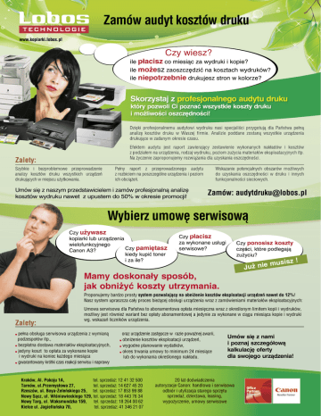 Zamów audyt kosztów druku www.kopiarki.lobos.pl Czy wiesz? ile płacisz co miesiąc za wydruki i kopie? ile możesz zaoszczędzić na kosztach wydruków? ile niepotrzebnie drukujesz stron w kolorze? Skorzystaj z profesjonalnego audytu druku który pozwoli Ci poznać wszystkie koszty druku i możliwości oszczędności! Dzięki profesjonalnemu audytowi wydruku nasi specjaliści przygotują dla Państwa pełną analizę kosztów druku w Waszej firmie. Analizie poddane zostaną wszystkie urządzenia drukujące w zadanym okresie czasu. Efektem audytu jest raport zawierający zestawienie wykonanych nakładów i kosztów z podziałem na urządzenia, rodzaj wydruku, poziom zużycia materiałów eksploatacyjnych itp. Na życzenie zaproponujemy rozwiązania dla uzyskania oszczędności. Zalety: Szybkie i bezproblemowe przeprowadzenie analizy kosztów druku wszystkich urządzeń drukujących w miejscu użytkowania. Pełny raport z przeprowadzonego audytu z rozbiciem na poszczególne urządzenia i poziom ich obciążeń. Umów się z naszym przedstawicielem i zamów profesjonalną analizę kosztów wydruku nawet z upustem do 50% w okresie promocji! Wskazanie potencjalnych obszarów możliwych do uzyskania oszczędności w druku i innych funkcjonalności sieciowych. Zamów: [email protected] Wybierz umowę serwisową Czy używasz kopiarki lub urządzenia wielofunkcyjnego Czy pamiętasz Canon A3? kiedy kupić toner i za ile? Czy płacisz za wykonane usługi serwisowe? Czy ponosisz koszty części, które podlegają zużyciu? musisz Już nie Mamy doskonały sposób, jak obniżyć koszty utrzymania. ! Proponujemy bardzo prosty system pozwalający na obniżenie kosztów eksploatacji urządzeń nawet do 12%! Nasz system upraszcza cały proces bieżącej obsługi urządzenia wraz z zamówieniami materiałów eksploatacyjnych: Zalety: Umowa serwisowa dla Państwa to abonamentowa opłata miesięczna wraz z określonym limitem kopii i wydruków, możliwy jest również wariant bez opłaty abonamentowej a jedynie za wykonane w ciągu miesiąca kopie i wydruki wg. wskazań liczników urządzenia. pełna obsługa serwisowa urządzenia z wymianą podzespołów itp., bezpłatna dostawa materiałów eksploatacyjnych, jedyny koszt to opłata za wykonane kopie i wydruki na koniec każdego miesiąca gwarantowany krótki czas reakcji serwisu i naprawy oraz urządzenie zastępcze w razie poważnej awarii, obniżenie kosztów eksploatacji urządzeń, wygodne planowanie wydatków, okres trwania umowy to minimum 24 miesiące lub do wykonania określonego nakładu. tel. sprzedaż: 12 41 32 500 Kraków, Al. Pokoju 1A, tel. sprzedaż: 14 627 45 20 Tarnów, ul.Przemysłowa 27, Rzeszów, ul. Boya-Żeleńskiego 25, tel. sprzedaż: 17 853 99 88 Nowy Sącz, ul. Wiśniowieckiego 129, tel. sprzedaż: 18 443 76 34 Nowy Targ, ul. Waksmundzka 159, tel. sprzedaż: 18 264 00 62 tel. sprzedaż: 41 346 21 07 Kielce ul. Jagiellońska 70, Umów się z nami i poznaj szczegółową kalkulację oferty dla swojego urządzenia! 20 lat doświadczenia autoryzacje Canon: handlowa i serwisowa odbiór i utylizacja starego sprzętu sprzedaż, dzierżawa, leasing, wypożyczenie, umowy serwisowe promocja ważna do 30.04.2011 lub wyczerpania zestawów promocyjnych Tani kol dla każdego or Canon iR Advance C2020L Super oferta na najnowszy model Canon z umową serwisową! Wygodna obsługa Bardzo prosta i intuicyjna obsługa menu urządzenia z dotykowego, kolorowego panelu LCD w języku polskim z możliwością konfiguracji ustawień osobistych! Dzięki niezwykle prostej konstrukcji urządzenia możliwe jest bardzo łatwe usunięcie zaciętego papieru i wymiana materiałów eksploatacyjnych! Koszty eksploatacji Canon iR Advance C2020L oferuje niskie koszty eksploatacji oraz zapewnia tanie kopiowanie i drukowanie dzięki funkcji automatycznego rozpoznawania koloru! Po uruchomieniu funkcji autoryzacji dostępu można przydzielać uprawnienia dla użytkowników dla pracy w kolorze dzięki czemu można mieć jeszcze lepszą kontrolę nad kosztami eksploatacji! Wyposażenie Urządzenie standardowo pracuje w sieci komputerowej jako drukarka i skaner, umożliwia również kopiowanie - wszystko automatycznie dwustronnie! W ramach opcji dodatkowych można je rozbudować w zakresie wysyłania sieciowego (jako plik: na serwer, do katalogu, do e-mail-a), faksowania i opcji umożliwiających profesjonalne wykańczanie dokumentów! Kup Canon iR Advance C2020L już za 282 zł* netto miesięcznie! Wypożycz Canon iR Advance C2020L już za 349 zł** netto miesięcznie! Wybierz wariant umowy serwisowej Płać tylko za kopie i wydruki! Tanio, szybko i wygodnie! * - rata leasingu optymalnego na okres 42 miesięcy **- miesięczna rata za wypożyczenie urządzenia na okres 36 miesięcy W/w ceny obowiązują przy zakupie/wypożyczeniu urządzenia w pakiecie wraz z umową serwisową. Kraków, Al. Pokoju 1A, tel. sprzedaż: 12 41 32 500 Tarnów, ul.Przemysłowa 27, tel. sprzedaż: 14 627 45 20 Rzeszów, ul. Boya-Żeleńskiego 25, tel. sprzedaż: 17 853 99 88 Nowy Sącz, ul. Wiśniowieckiego 129, tel. sprzedaż: 18 443 76 34 Nowy Targ, ul. Waksmundzka 159, tel. sprzedaż: 18 264 00 62 tel. sprzedaż: 41 346 21 07 Kielce ul. Jagiellońska 70, www.kopiarki.lobos.pl 20 lat doświadczenia autoryzacje Canon: handlowa i serwisowa odbiór i utylizacja starego sprzętu sprzedaż, dzierżawa, leasing, wypożyczenie, umowy serwisowe