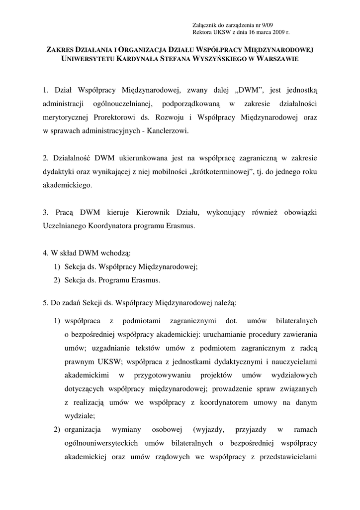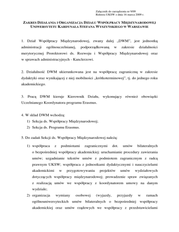 Załącznik do zarządzenia nr 9/09 Rektora UKSW z dnia 16 marca 2009 r. ZAKRES DZIAŁANIA I ORGANIZACJA DZIAŁU WSPÓŁPRACY MIĘDZYNARODOWEJ UNIWERSYTETU KARDYNAŁA STEFANA WYSZYŃSKIEGO W WARSZAWIE 1. Dział Współpracy Międzynarodowej, zwany dalej „DWM”, jest jednostką administracji ogólnouczelnianej, podporządkowaną w zakresie działalności merytorycznej Prorektorowi ds. Rozwoju i Współpracy Międzynarodowej oraz w sprawach administracyjnych - Kanclerzowi. 2. Działalność DWM ukierunkowana jest na współpracę zagraniczną w zakresie dydaktyki oraz wynikającej z niej mobilności „krótkoterminowej”, tj. do jednego roku akademickiego. 3. Pracą DWM kieruje Kierownik Działu, wykonujący również obowiązki Uczelnianego Koordynatora programu Erasmus. 4. W skład DWM wchodzą: 1) Sekcja ds. Współpracy Międzynarodowej; 2) Sekcja ds. Programu Erasmus. 5. Do zadań Sekcji ds. Współpracy Międzynarodowej należą: 1) współpraca z podmiotami zagranicznymi dot. umów bilateralnych o bezpośredniej współpracy akademickiej: uruchamianie procedury zawierania umów; uzgadnianie tekstów umów z podmiotem zagranicznym z radcą prawnym UKSW; współpraca z jednostkami dydaktycznymi i nauczycielami akademickimi w przygotowywaniu projektów umów wydziałowych dotyczących współpracy międzynarodowej; prowadzenie spraw związanych z realizacją umów we współpracy z koordynatorem umowy na danym wydziale; 2) organizacja wymiany osobowej (wyjazdy, przyjazdy w ramach ogólnouniwersyteckich umów bilateralnych o bezpośredniej współpracy akademickiej oraz umów rządowych we współpracy z przedstawicielami wydziałowymi odpowiedzialnymi za współpracę międzynarodową na wydziałach); 3) współpraca z jednostkami dydaktycznymi UKSW w zakresie przygotowania i obsługi wizyt gości zagranicznych; wystawianie zaświadczeń o pobycie gości zagranicznych na UKSW; 4) współpraca z sekretariatem Prorektora ds. Rozwoju i Współpracy Międzynarodowej w zakresie przygotowywania i realizacji wizyt gości zagranicznych Prorektora ds. Rozwoju i Współpracy Międzynarodowej 5) współpraca z sekretariatem Prorektora ds. Rozwoju i Współpracy Międzynarodowej w zakresie organizacji i obsługi zagranicznych wyjazdów służbowych Prorektora ds. Rozwoju i Współpracy Międzynarodowej; 6) współpraca z podmiotami zagranicznymi w ramach programów międzynarodowych innych niż programy Unii Europejskiej dot. dydaktyki i mobilności (np. CEEPUS, Fundusz Wyszehradzki, Fulbright itp.), opracowywanie dokumentów dotyczących poszczególnych stypendystów, prowadzenie korespondencji, itp.; 7) współpraca z jednostkami organizacyjnymi UKSW w zakresie spraw związanych z obsługą stypendiów oferowanych przez Biuro Uznawalności Wykształcenia i Wymiany Międzynarodowej; prowadzenie spraw cudzoziemców będących stypendystami strony polskiej, przygotowywanie list wypłat stypendiów oraz zestawień stypendiów, stanowiących podstawę udokumentowania prawidłowego wydatkowania środków przez Kwesturę UKSW oraz dla Biura Uznawalności Wykształcenia i Wymiany Międzynarodowej w celu uzyskania refundacji środków; 8) obsługa stypendiów pozauczelnianych wymagających zaangażowania uczelni, prowadzenie spraw związanych z obsługą stypendystów wnioskujących o tego typu stypendia (np.:DAAD, Copernicus itp.); 9) udział w pracach Komisji Senackiej ds. Współpracy Międzynarodowej; 10) współpraca z jednostkami dydaktycznymi UKSW w zakresie organizacji przyjazdów studentów zagranicznych „krótkoterminowych” tzw. „guest students”; 11) prowadzenie katalogu przedmiotów obcojęzycznych zgłaszanych do DWM przez wydziały; ogłaszanie katalogu na stronie internetowej DWM; 12) przygotowywanie wniosku w sprawie wszczęcia postępowania o udzielenie zamówienia publicznego dotyczącego zakupu i dostawy biletów na każdy rok kalendarzowy; uczestnictwo w komisji przetargowej; realizacja zamówień publicznych w zakresie zakupu biletów lotniczych, kolejowych i autokarowych dla nauczycieli akademickich UKSW i pracowników administracyjnych UKSW delegowanych na wyjazdy służbowe w kraju i zagranicą; 13) prowadzenie korespondencji i przygotowywanie materiałów (tekstów) w językach obcych, dotyczących współpracy międzynarodowej; 14) udział w wydarzeniach wynikających ze współpracy z podmiotami zagranicznymi; reprezentowanie UKSW (np. UNICA, EAIE); 15) udział w wydarzeniach wynikających ze współpracy z podmiotami krajowymi; reprezentowanie UKSW (np. IROs FORUM); 16) przygotowywanie sprawozdań dotyczących współpracy międzynarodowej UKSW: rocznego dla Rektora UKSW; dla potrzeb Biura Uznawalności Wykształcenia i Wymiany Międzynarodowej; Fundacji Rozwoju Systemu Edukacji i innych; przygotowanie danych statystycznych dotyczących ilości studentów i wykładowców wyjeżdżających z UKSW i przyjeżdżających na UKSW dla potrzeb Biura Promocji UKSW (np. rankingi szkół wyższych) i innych jednostek według szczególnych wymagań; 17) prowadzenie strony internetowej działu (tworzenie i aktualizacja strony internetowej ) w języku polskim i języku angielskim; 18) prowadzenie spraw związanych z członkostwem w organizacjach międzynarodowych FIUC, FUCE, EUA; 19) pomoc jednostkom dydaktycznym w weryfikacji autentyczności dyplomów przedkładanych do nostryfikacji w UKSW we współpracy z BUWIWM; 20) prowadzenie wykazu nauczycieli akademickich wyjeżdżających z UKSW/ przyjeżdżających na UKSW w ramach prowadzonej współpracy międzynarodowej; 21) prowadzenie wykazu studentów akademickich wyjeżdżających z UKSW/ przyjeżdżających międzynarodowej; na UKSW w ramach prowadzonej współpracy 22) prowadzenie bazy wyjazdów zagranicznych realizowanych przez pracowników UKSW w danym roku kalendarzowym; 23) udział w ceremoniach uczelnianych - pomoc w obsłudze ceremonii. 6. Do zadań Sekcji ds. Programu Erasmus należy: 1) koordynacja i obsługa umów E