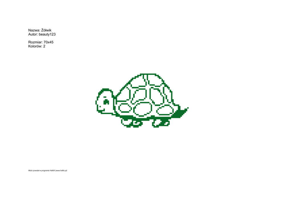 Nazwa: śółwik Autor: beauty123 Rozmiar: 70x45 Kolorów: 2 Wzór powstał w programie HaftiX (www.haftix.pl) 10 10 20 30 40 10 śółwik 20 20 30 40 30 40 50 60 70 10 50 20 30 40 60 70 Strona nr 1 Symbol śółwik Nr nici KrzyŜyki Motki 2 nitki Motki 3 nitki Motki 6 nitek Kanwa 2499 1 1 2 Ariadna (nowa) 1681 651 1 1 1
