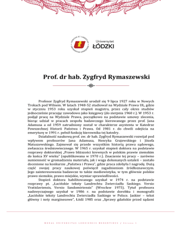 Prof. dr hab. Zygfryd Rymaszewski Profesor Zygfryd Rymaszewski urodził się 9 lipca 1927 roku w Nowych Trokach pod Wilnem. W latach 1948-52 studiował na Wydziale Prawa UŁ, gdzie w styczniu 1953 roku uzyskał stopień magistra, przez cały okres studiów jednocześnie pracując zawodowo jako księgowy (do sierpnia 1960 r.). W 1953 r. podjął pracę na Wydziale Prawa, początkowo na podstawie umowy zlecenia, biorąc udział w pracach zespołu badawczego kierowanego przez prof. Jana Adamusa a od 1959 zatrudniony został w charakterze asystenta w Katedrze Powszechnej Historii Państwa i Prawa. Od 1981 r. do chwili odejścia na emeryturę w 1991 r. pełnił funkcję kierownika tej katedry. Działalność naukową prof. zw. dr hab. Zygfryd Rymaszewski rozwijał pod wpływem profesorów Jana Adamusa, Henryka Grajewskiego i Józefa Matuszewskiego. Zajmował się przede wszystkim historią prawa sądowego, zwłaszcza średniowiecznego. W 1965 r. uzyskał stopień doktora na podstawie rozprawy doktorskiej „Prawo bliższości krewnych w polskim prawie ziemskim do końca XV wieku” (opublikowana w 1970 r.). Znaczenie tej pracy – zarówno sumienność w gromadzeniu materiału, jak i waga dokonanych ustaleń – zostało docenione na konkursie „Państwa i Prawa”, gdzie praca zdobyła I nagrodę. Dużą część swojej pracy naukowej poświęcił zagadnieniom źródłoznawczym. Jego zainteresowania badawcze to także mediewistyka, w tym głównie polskie prawo ziemskie, prawo miejskie, wymiar sprawiedliwości. Stopień doktora habilitowanego uzyskał w 1974 r. na podstawie rozprawy pt. „Łacińskie teksty Landrechtu Zwierciadła Saskiego. Versio Vratislaviensis, Versio Sandomiriensis” (Wrocław 1975). Tytuł profesora nadzwyczajnego uzyskał w 1986 r. na podstawie dorobku i monografii „Łacińskie teksty Landrechtu Zwierciadła Saskiego w Polsce. Jaskier – tekst główny i noty marginesowe”, Łódź 1985 oraz „Sprawy gdańskie przed sądami M E D A L U N I V E R S I T A S L O D Z I E N S I S M E R E N T I B U S / S t r o n a 1 M E D A L U N I V E R S I T A S L O D Z I E N S I S M E R E N T I B U S zadwornymi oraz ingerencja królów w gdański wymiar sprawiedliwości XVIXVIII w.”. W 1990 r. został mianowany profesorem zwyczajnym. Zajmował się także prawem chełmińskim („Nieznany spis prawa chełmińskiego z przełomu XIV i XV wieku”, Łódź 1993) i relacjami między władcami polskimi a Gdańskiem („Sprawy gdańskie przed sądami nadwornymi oraz ingerencja królów w gdański wymiar sprawiedliwości XVI-XVIII w.”, Wrocław 1985). W ostatnich latach badał między innymi instytucję woźnego sądowego („Woźny sądowy. Z badań nad organizacją sądów prawa polskiego w średniowieczu”, Warszawa 2008; „Czynności woźnego sądowego”, Warszawa 2009). Prof. zw. dr hab. Zygfryd Rymaszewski co parę lat przenosi swoją aktywność naukową na nowe pola badawcze, podejmując od początku żmudną pracę badania innych materiałów źródłowych. Tego rodzaju sumienna działalność pociąga za sobą konsekwencję w postaci braku „wysokiej wydajności” badawczej, jednak wartość Jego prac jest bardzo wysoka. Prof. zw. dr hab. Zygfryd Rymaszewski przez cały okres swojej pracy prowadził zajęcia dydaktyczne. W 1968 r. opracował i wydał skrypt dla studentów z powszechnej historii państwa i prawa, był również organizatorem olimpiad historycznoprawnych. Czynnie uczestniczył w pracach wielu organów uczelni m.in.: Rady Pedagogicznej I Roku, Rady ds. Młodzieży, był przedstawicielem Wydziału w Senacie, kierownikiem Zaocznego Zawodowego Studium Administracyjnego na Wydziale Prawa, przez dwie kadencje prodziekanem Wydziału. W 1997 r. przeszedł na emeryturę kontynuując prowadzenie zajęć dydaktycznych i działalność naukową. Poza uczelnią jego aktywność naukowa obejmuje m.in. członkostwo w redakcji Czasopisma Prawno-Historycznego i Komisji Historyczno-Prawnej Zarządu Głównego Polskiego Towarzystwa Historycznego, funkcję sekretarza Wydziału II, członka Zarządu, a następnie członka Komisji Rewizyjnej Łódzkiego Towarzystwa Naukowego. Jest również zaangażowany w organizowanie pomocy dla Polonii białoruskiej i litewskiej, między innymi jako wieloletni wiceprezes Stowarzyszenia Pomocy Rubież. Prof. zw. dr hab. Zygfryd Rymaszewski za swoją działalność został odznaczony Medalem Komisji Edukacji Narodowej (1979 r.), Złotym Krzyżem Zasługi (1980 r.), Krzyżem Kawalerskim Orderu Odrodzenia Polski (1987 r.), Odznaką za Zasługi dla Miasta Łodzi oraz wieloma innymi odznaczeniami lokalnymi. Opracowała: Joanna Drożdżewicz M E D A L U N I V E R S I T A S L O D Z I E N S I S M E R E N T I B U S / S t r o n a 2