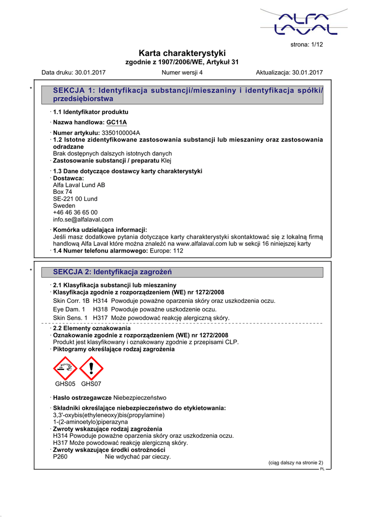 44.1.6 strona: 1/12 Karta charakterystyki zgodnie z 1907/2006/WE, Artykuł 31 Data druku: 30.01.2017 * Numer wersji 4 Aktualizacja: 30.01.2017 SEKCJA 1: Identyfikacja substancji/mieszaniny i identyfikacja spółki/ przedsiębiorstwa · 1.1 Identyfikator produktu · Nazwa handlowa: GC11A · Numer artykułu: 3350100004A · 1.2 Istotne zidentyfikowane zastosowania substancji lub mieszaniny oraz zastosowania odradzane Brak dostępnych dalszych istotnych danych · Zastosowanie substancji / preparatu Klej · 1.3 Dane dotyczące dostawcy karty charakterystyki · Dostawca: Alfa Laval Lund AB Box 74 SE-221 00 Lund Sweden +46 46 36 65 00 [email protected] · Komórka udzielająca informacji: Jeśli masz dodatkowe pytania dotyczące karty charakterystyki skontaktować się z lokalną firmą handlową Alfa Laval które można znaleźć na www.alfalaval.com lub w sekcji 16 niniejszej karty · 1.4 Numer telefonu alarmowego: Europe: 112 * SEKCJA 2: Identyfikacja zagrożeń · 2.1 Klasyfikacja substancji lub mieszaniny · Klasyfikacja zgodnie z rozporządzeniem (WE) nr 1272/2008 Skin Corr. 1B H314 Powoduje poważne oparzenia skóry oraz uszkodzenia oczu. Eye Dam. 1 H318 Powoduje poważne uszkodzenie oczu. Skin Sens. 1 H317 Może powodować reakcję alergiczną skóry. · 2.2 Elementy oznakowania · Oznakowanie zgodnie z rozporządzeniem (WE) nr 1272/2008 Produkt jest klasyfikowany i oznakowany zgodnie z przepisami CLP. · Piktogramy określające rodzaj zagrożenia GHS05 GHS07 · Hasło ostrzegawcze Niebezpieczeństwo · Składniki określające niebezpieczeństwo do etykietowania: 3,3'-oxybis(ethyleneoxy)bis(propylamine) 1-(2-aminoetylo)piperazyna · Zwroty wskazujące rodzaj zagrożenia H314 Powoduje poważne oparzenia skóry oraz uszkodzenia oczu. H317 Może powodować reakcję alergiczną skóry. · Zwroty wskazujące środki ostrożności P260 Nie wdychać par cieczy. (ciąg dalszy na stronie 2) PL 44.1.6 strona: 2/12 Karta charakterystyki zgodnie z 1907/2006/WE, Artykuł 31 Data druku: 30.01.2017 Numer wersji 4 Aktualizacja: 30.01.2017 Nazwa handlowa: GC11A (ciąg dalszy od strony 1) P280 Stosować rękawice ochronne/odzież ochronną/ochronę oczu/ochronę twarzy. P303+P361+P353 W PRZYPADKU KONTATKU ZE SKÓRĄ (lub z włosami): Natychmiast zdjąć całą zanieczyszczoną odzież. Spłukać skórę pod strumieniem wody/ prysznicem. P305+P351+P338 W PRZYPADKU DOSTANIA SIĘ DO OCZU: Ostrożnie płukać wodą przez kilka minut. Wyjąć soczewki kontaktowe, jeżeli są i można je łatwo usunąć. Nadal płukać. P310 Natychmiast skontaktować się z OŚRODKIEM ZATRUĆ/lekarzem/. P333+P313 W przypadku wystąpienia podrażnienia skóry lub wysypki: Zasięgnąć porady/ zgłosić się pod opiekę lekarza. · 2.3 Inne zagrożenia Zawiera 1-piperazinethanamine. Może powodować wystąpienie reakcji alergicznej. · Wyniki oceny właściwości PBT i vPvB · PBT: Nie nadający się do zastosowania. · vPvB: Nie nadający się do zastosowania. * SEKCJA 3: Skład/informacja o składnikach · 3.2 Mieszaniny · Opis: Mieszanka: składająca się z niżej wymienionych składników. CAS: 67762-90-7 Dimethyl siloxane, reaction product with silicon oxide 2,5-<10% · Składniki niebezpieczne: CAS: 1332-58-7 Kaolin 25-50% substancja z określoną na poziomie Wspólnoty wartością najwyższego dopuszczalnego stężenia w środowisku pracy 25-50% CAS: 4246-51-9 3,3'-oxybis(ethyleneoxy)bis(propylamine) EINECS: 224-207-2 Skin Corr. 1B, H314; Skin Sens. 1, H317 CAS: 90-72-2 2,4,6-tris(dimetyloaminometylo)fenol 10% EINECS: 202-013-9 Acute Tox. 4, H302; Skin Irrit. 2, H315; Eye Irrit. 2, H319 0,1-<1% CAS: 140-31-8 1-(2-aminoetylo)piperazyna EINECS: 205-411-0 Skin Corr. 1B, H314; Acute Tox. 4, H302; Acute Tox. 4, H312; Skin Sens. 1, H317; Aquatic Chronic 3, H412 · Wskazówki dodatkowe: Pełna treść przytoczonych wskazówek dotyczących zagrożeń znajduje się w rozdziale 16. * SEKCJA 4: Środki pierwszej pomocy · 4.1 Opis środków pierwszej pomocy · Wskazówki ogólne: Odzież zanieczyszczoną produktem należy niezwłocznie usunąć. Wyprać zanieczyszczoną odzież przed ponownym użyciem. · Po wdychaniu: Dostarczyć świeże powietrze, w razie dolegliwości wezwać lekarza. · Po styczności ze skórą: Rinse with water for a longer time. · Po styczności z okiem: W PRZYPADKU DOSTANIA SIĘ DO OCZU: Ostrożnie płukać wodą przez 15 minut. Wyjąć soczewki kontaktowe, jeżeli są i można je łatwo usunąć. Nadal płukać. Wyjąć soczewki kontaktowe, jeżeli są i można je łatwo usunąć. Nadal płukać. Natychmiast uzyskać poradę lekarską. (ciąg dalszy na stronie 3) PL 44.1.6 strona: 3/12 Karta charakterystyki zgodnie z 1907/2006/WE, Artykuł 31 Data druku: 30.01.2017 Numer wersji 4 Aktualizacja: 30.01.2017 Nazwa handlowa: GC11A (ciąg dalszy od strony 2) · Po przełknięciu: W PRZYPADKU POŁKNIĘCIA: wypłukać usta. NIE wywoływać wymiotów. Natychmiast udać się do lekarza. · 4.2 Najważniejsze ostre i opóźnione objawy oraz skutki narażenia Refer to section 11.1 · 4.3 Wskazania dotyczące wszelkiej natychmiastowej pomocy lekarskiej i szczególnego postępowania z poszkodowanym Brak dostępnych dalszych istotnych danych * SEKCJA 5: Postępowanie w przypadku pożaru · 5.1 Środki gaśnicze · Przydatne środki gaśnicze: Zabiegi gaszenia ognia dostosować do otoczenia. Woda Piana · 5.2 Szczególne zagrożenia związane z substancją lub mieszaniną Podczas pożaru mogą uwolnić się: Tlenek węgla (CO) CO2 Tlenki azotu (NOx) · 5.3 Informacje dla straży pożarnej · Specjalne wyposażenie ochronne: Nosić urządzenie ochrony dróg oddechowych niezależnie od powietrza otoczenia. Nosić pełne ubranie ochronne. * SEKCJA 6: Postępowanie w przypadku niezamierzonego uwolnienia do środowiska · 6.1 Indywidualne środki ostrożności, sprzęt ochronny i procedury w sytuacjach awaryjnych Nie wdychać pary. Nosić ubranie ochronne. Osoby nie zabezpieczone przenieść w bezpieczne miejsce. Nie wpro