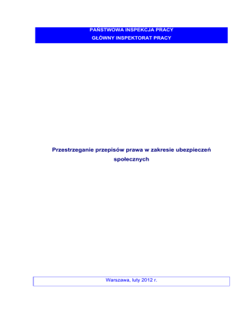 PAŃSTWOWA INSPEKCJA PRACY GŁÓWNY INSPEKTORAT PRACY Przestrzeganie przepisów prawa w zakresie ubezpieczeń społecznych Warszawa, luty 2012 r. W świetle aktualnego stanu prawnego do kontroli wykonywania zadań i obowiązków w zakresie ubezpieczeń społecznych, w szczególności przez płatników składek, powołany jest Zakład Ubezpieczeń Społecznych (inspektorzy kontroli ZUS). Przedmiotem kontroli Państwowej Inspekcji Pracy są jedynie niektóre zagadnienia z powyższego zakresu, szczegółowo wskazane w ustawie o PIP lub innych aktach prawnych (np. w ustawie o ubezpieczeniu społecznym z tytułu wypadków przy pracy i chorób zawodowych czy w ustawie o emeryturach pomostowych). Wspomniane uprawnienia kontrolne Inspekcji Pracy wiążą się zwłaszcza z problematyką legalności zatrudnienia, zagrożeń wypadkowych oraz wykonywania prac w szczególnych warunkach lub o szczególnym charakterze. Kontrola obowiązku dokonywania zgłoszeń do ubezpieczenia społecznego W ramach kontroli legalności zatrudnienia inspektorzy pracy weryfikują przestrzeganie przez podmioty kontrolowane obowiązku zgłoszenia osób zatrudnionych lub wykonujących inną pracę zarobkową do ubezpieczenia społecznego oraz terminowość tych zgłoszeń (których należy dokonać w ciągu 7 dni od daty powstania obowiązku ubezpieczenia). Powyższe kompetencje Państwowej Inspekcji Pracy wynikają z definicji nielegalnego zatrudnienia i nielegalnej innej pracy zarobkowej, zawartej w art. 2 ust. 1 pkt 13 ustawy z dnia 20 kwietnia 2004 r. o promocji zatrudnienia i instytucjach rynku pracy (Dz.U. z 2008 r. Nr 69, poz. 415 z późn. zm.). W myśl powołanej definicji, nielegalnym zatrudnieniem i nielegalną inną pracą zarobkową jest m.in. niezgłoszenie osoby zatrudnionej lub wykonującej inną pracę zarobkową do ubezpieczenia społecznego. Należy jednak zaznaczyć, że organy PIP nie są uprawnione do samodzielnego ścigania wykroczeń związanych z niewykonaniem ww. obowiązku. Ściganie tych wykroczeń – zawartych w art. 98 ustawy z dnia 13 października 1998 r. o systemie ubezpieczeń społecznych (Dz.U. z 2009 r. Nr 205, poz. 1585 z późn. zm.) – należy do właściwości Zakładu Ubezpieczeń Społecznych. Nie ma również umocowania prawnego do prowadzenia przez Państwową Inspekcję Pracy kontroli opłacania składek na ubezpieczenie społeczne. W razie stwierdzenia nieprawidłowości dotyczących zgłoszenia do ubezpieczenia społecznego, inspektor pracy jest uprawniony do skierowania do podmiotu kontrolowanego wystąpienia lub wydania polecenia ustnego w sprawie ich usunięcia. Ponadto, stosownie do art. 37 ust. 2 pkt 1 ustawy z dnia 13 kwietnia 2007 r. o Państwowej Inspekcji Pracy (Dz.U. Nr 89, poz. 589 z późn. zm.), o naruszeniu przepisów w zakresie ubezpieczeń społecznych inspektor pracy jest zobowiązany powiadomić Zakład Ubezpieczeń Społecznych. 2 Na podstawie ustaleń dokonanych w toku kontroli inspektorzy pracy kierują również zawiadomienia do prokuratury o podejrzeniu popełnienia przestępstwa z art. 219 Kodeksu karnego (niezgłoszenie danych dotyczących ubezpieczenia społecznego). Zakres wspomnianych wyżej powiadomień ZUS został określony w Porozumieniu między Głównym Inspektorem Pracy a Prezesem Zakładu Ubezpieczeń Społecznych z dnia 5 listopada 2010 r. w sprawie współdziałania organów Państwowej Inspekcji Pracy i Zakładu Ubezpieczeń Społecznych. Na mocy tego Porozumienia ustalono także zasady udostępniania Inspekcji Pracy zasobów informatycznych ZUS w postaci danych jednostkowych o płatnikach składek na ubezpieczenie społeczne oraz pozyskiwania przez inspektorów pracy – za pośrednictwem elektronicznej skrzynki podawczej ZUS – danych o osobach zgłoszonych do ubezpieczenia społecznego przez danego płatnika. Powyższa możliwość, której praktyczne wdrożenie jest aktualnie przedmiotem uzgodnień stron, powinna przyczynić się do poprawy skuteczności kontroli legalności zatrudnienia i usprawnienia postępowań kontrolnych. W 2011 r. inspektorzy Państwowej Inspekcji Pracy przeprowadzili łącznie 25 tys. kontroli, podczas których badali zagadnienia legalności zatrudnienia – w tym również kwestię dokonywania zgłoszeń do ubezpieczeń społecznych – 153,6 tys. obywateli polskich oraz 7,5 tys. cudzoziemców. 3 Przeprowadzone kontrole wykazały, że kolejny rok z rzędu wzrosła skala ujawnionych naruszeń przepisów w zakresie terminowości zgłaszania do ubezpieczenia społecznego. Nieprawidłowości takie zostały stwierdzone w co czwartym podmiocie kontrolowanym. W 2011 r. niezgłoszenie do ubezpieczenia społecznego wykazano w ponad 1,2 tys. skontrolowanych podmiotów – obowiązek zgłoszenia nie został dopełniony wobec 3,1 tys. osób (w porównaniu do 2010 r. – wzrost o 3%). Sekcje gospodarki, w których najczęściej stwierdzano niedopełnienie obowiązku zgłoszenia osób zatrudnionych lub wykonujących inną pracę zarobkową do ubezpieczenia społecznego, to: zakwaterowanie i usługi gastronomiczne (hotele i restauracje), transport i gospodarka magazynowa oraz informacja i komunikacja. Wśród podmiotów naruszających przepisy dominowały mikroprzedsiębiorstwa (o zatrudnieniu do 9 pracowników) oraz małe firmy (zatrudniające nie więcej niż 49 pracowników). 4 W ponad 6,2 tys. podmiotów w 2011 r. ujawniono nieterminowe zgłaszanie do ubezpieczenia społecznego, które dotyczyło 16,7 tys. osób (wzrost o 4% w stosunku do 2010 r.). Ponadto w 1,8 tys. przypadków zostały wykazane nieprawidłowości polegające na niezgłoszeniu do ZUS wymaganych danych lub zgłoszeniu nieprawdziwych danych mających wpływ na wymiar składek na Fundusz Pracy, a w konsekwencji także na wymiar składek na ubezpieczenie społeczne. W latach 2009 - 2011 inspektorzy pracy skierowali do podmiotów kontrolowanych 19,2 tys. wniosków i poleceń w sprawie usunięcia stwierdzonych uchybień wobec 57,3 tys. osób. 5 W wyniku 
