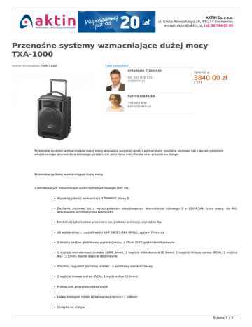 Przenośne systemy wzmacniające dużej mocy TXA-1000 Numer katalogowy:TXA-1000 Twój konsultant Arkadiusz Trzebiński tel. 503 030 555 [email protected] NOWOŚĆ W OFERCIE 3840.00 zł 3840.00 zł z VAT Karina Gładecka 796 603 606 [email protected] Przenośne systemy wzmacniające dużej mocy posiadają wysokiej jakości wzmacniacz, zasilanie sieciowe lub z wykorzystaniem wbudowanego akumulatora żelowego, przełącznik priorytetu mikrofonów oraz gniazdo na statyw. Przenośne systemy wzmacniające dużej mocy z wbudowanym odbiornikiem wieloczęstotliwościowym UHF PLL. Wysokiej jakości wzmacniacz 170WMAX, klasy D Zasilanie sieciowe lub z wykorzystaniem wbudowanego akumulatora żelowego 2 x 12V/4.5Ah (czas pracy: do 4h), wbudowana automatyczna ładowarka Doskonały jako zestaw przenośny np. podczas promocji, wykładów itp. 16 wybieralnych częstotliwości UHF (863.1-864.9MHz), system Diversity 2-drożny zestaw głośnikowy wysokiej mocy, z 25cm (10") głośnikiem basowym 1 wejście mikrofonowe (combo XLR/6.3mm), 1 wejście mikrofonowe (6.3mm), 1 wejście liniowe stereo (RCA), 1 wejście Aux (3.5mm), każde wejście regulowane Wspólny regulator poziomu master i 2-punktowy korektor barwy 1 wyjście liniowe stereo (RCA), 1 wyjście Aux (3.5mm) Przełącznik priorytetu mikrofonów Łatwy transport dzięki teleskopowej rączce i 2 kółkom Gniazdo na statyw Strona 1 / 3 Nie wymaga licencji w krajach UE. TXA-1000: System z 1 odbiornikiem bezprzewodowym TXA-1000CD: System z 1 odbiornikiem bezprzewodowym Odtwarzacz CD/MP3 z mechanizmem wpustowym i systemem anti-shock Czytnik kart SD, interfejs USB Funkcja pitch-control W komplecie pilot sterujący odtwarzaczem CD TXA-1002CD: System z 2 odbiornikami bezprzewodowymi Odtwarzacz CD/MP3 z mechanizmem wpustowym i systemem anti-shock Czytnik kart SD, interfejs USB Funkcja pitch-control 1 nadajnik bezprzewodowy do współpracy z kolejnymi systemami TXA-1000 lub systemami TXA-800 W komplecie pilot sterujący odtwarzaczem CD Odpowiedni mikrofon lub nadajnik kieszonkowy: TXA-800HSE, TXA-800HT lub ATS-12HT, ATS-162T dostępne jako wyposaż. dodatk Parametrz technicne : Moc wyjściowa Pasmo przenoszenia Częstotliwość nośna Zasięg Wejścia mikr. Wejścia liniowe Link Korektor, niskie Korektor, średnie Korektor, wysokie Zasilanie 170WMAX/120WRMS 20-20 000Hz 863.1-864.9MHz około 30m 6mV 150mV (także aux) ±10dB/100Hz ±10dB/10kHz 230V˜/50Hz/170VA, Dopuszcz. temp. otoczenia Wymiary Waga bat, akum.: 2 x 12V/4.5Ah 0-40 °C 360x580x320mm 17.8kg Strona 2 / 3 Strona 3 / 3 Powered by TCPDF (www.tcpdf.org)