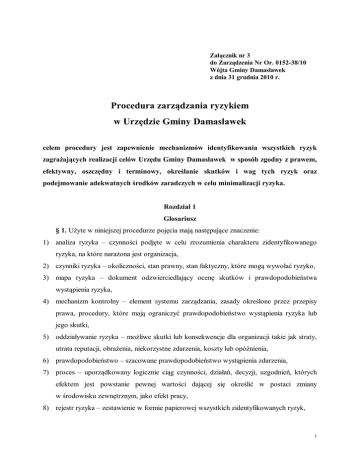 Załącznik nr 3 do Zarządzenia Nr Or. 0152-38/10 Wójta Gminy Damasławek z dnia 31 grudnia 2010 r. Procedura zarządzania ryzykiem w Urzędzie Gminy Damasławek celem procedury jest zapewnienie mechanizmów identyfikowania wszystkich ryzyk zagrażających realizacji celów Urzędu Gminy Damasławek w sposób zgodny z prawem, efektywny, oszczędny i terminowy, określanie skutków i wag tych ryzyk oraz podejmowanie adekwatnych środków zaradczych w celu minimalizacji ryzyka. Rozdział 1 Glosariusz § 1. Użyte w niniejszej procedurze pojęcia mają następujące znaczenie: 1) analiza ryzyka – czynności podjęte w celu zrozumienia charakteru zidentyfikowanego ryzyka, na które narażona jest organizacja, 2) czynniki ryzyka – okoliczności, stan prawny, stan faktyczny, które mogą wywołać ryzyko, 3) mapa ryzyka – dokument odzwierciedlający ocenę skutków i prawdopodobieństwa wystąpienia ryzyka, 4) mechanizm kontrolny – element systemu zarządzania, zasady określone przez przepisy prawa, procedury, które mają ograniczyć prawdopodobieństwo wystąpienia ryzyka lub jego skutki, 5) oddziaływanie ryzyka – możliwe skutki lub konsekwencje dla organizacji takie jak straty, utrata reputacji, obrażenia, niekorzystne zdarzenia, koszty lub opóźnienia, 6) prawdopodobieństwo – szacowane prawdopodobieństwo wystąpienia zdarzenia, 7) proces – uporządkowany logicznie ciąg czynności, działań, decyzji, uzgodnień, których efektem jest powstanie pewnej wartości dającej się określić w postaci zmiany w środowisku zewnętrznym, jako efekt pracy, 8) rejestr ryzyka – zestawienie w formie papierowej wszystkich zidentyfikowanych ryzyk, 1 9) ryzyko – możliwość (prawdopodobieństwo) zaistnienia zdarzenia, które będzie miało wpływ na realizację założonych celów i zadań, 10) ryzyko nieodłączne – ryzyko jakie występuje w sytuacji, gdy nie działają żadne mechanizmy kontrolne, 11) ryzyko operacyjne – ryzyko krótkookresowe związane z działalnością Urzędu, 12) ryzyko rezydualne – ryzyko występujące przy istnieniu mechanizmów kontrolnych, 13) ryzyko strategiczne – ryzyko długookresowe, na które Urząd ma ograniczony wpływ, 14) system kontroli zarządczej – ogół zasad zaprojektowanych i wdrożonych przez Wójta Gminy Damasławek, obejmujących całą organizację, stanowiących spójną i logiczną całość funkcjonującą w określonym środowisku na wszystkich poziomach zarządzania, służących zwiększeniu prawdopodobieństwa zrealizowania wytyczonych celów i zadań w sposób zgodny z prawem, efektywny, oszczędny i terminowy poprzez zmniejszenie skutków ryzyka, 15) szacowanie ryzyka – proces systematycznej oceny źródeł, skutków i prawdopodobieństwa wystąpienia ryzyka, 16) właściciel ryzyka – osoba odpowiedzialna za zarządzanie ryzykiem, mająca kompetencje do podjęcia działań zaradczych w stosunku do obszaru, którym zarządza, 17) zarządzanie ryzykiem – podjęte działania mające na celu zmniejszenie ryzyka do poziomu akceptowalnego obejmujące identyfikowanie i ocenę ryzyka oraz reagowanie na nie. Rozdział 2 Cele zarządzania ryzykiem w Urzędzie Gminy Damasławek § 2.1. Procedura zarządzania ryzykiem w Urzędzie Gminy Damasławek zwanym dalej Urzędem ma na celu zidentyfikowanie ryzyka oraz ograniczenie jego negatywnego oddziaływania, co powinno przyczynić się do efektywnego i racjonalnego osiągania celów i realizacji zadań Urzędu. 2. Celem zarządzania ryzykiem w odniesieniu do głównych celów i zadań Urzędu jest: 1) zaspokajanie zbiorowych potrzeb wspólnoty samorządowej, 2) efektywne zarządzanie Urzędem poprzez utworzenie właściwego ładu organizacyjnego, 3) położenie większego nacisku w procesie zarządzania na sprawy faktycznie istotne, 4) bardziej świadome podejmowanie ryzyka oraz decyzji, 5) efektywne wykorzystanie zasobów Urzędu, 6) skuteczne zarządzanie projektami, 2 7) dostosowanie do obowiązujących wymogów prawnych, 8) ograniczenie ryzyka utraty szans, 9) zapewnienie, by mechanizmy kontrolne były adekwatne do ryzyka, 10) ograniczenie nieetycznych zachowań. § 3. 1. Procedura zarządzania ryzykiem stanowi narzędzie zarządzania dla kierownictwa Urzędu oraz wytyczne dla wszystkich pracowników Urzędu. 2. Ograniczenie ryzyka prowadzone jest poprzez zaprojektowanie i wdrożenie odpowiednich mechanizmów kontrolnych na podstawie wyników monitoringu poziomu ryzyka oraz jego oceny. Rozdział 3 Cele funkcjonowania i zadania Urzędu § 4. 1. Urząd realizuje cele i wykonuje zadania określone ustawami, powierzone w drodze porozumienia oraz wynikające z zarządzeń Wójta Gminy Damasławek i uchwał Rady Gminy Damasławek. 2. Podstawowy zakres działania poszczególnych referatów i samodzielnych stanowisk określony jest w Regulaminie Organizacyjnym Urzędu Gminy Damasławek. Rozdział 4 Zakres podmiotowy zarządzania ryzykiem § 5. 1. Procedura zarządzania ryzykiem ma zastosowanie do wszystkich referatów Urzędu oraz do wszystkich pracowników zatrudnionych w Urzędzie. 2. Zarządzanie ryzykiem odbywa się na trzech poziomach: 1) strategicznym, 2) operacyjnym, 3) projektu. 3. Zarządzanie ryzykiem na poziomie strategicznym oparte jest na rocznej identyfikacji i analizie ryzyka. 4. Zarządzanie ryzykiem na poziomie operacyjnym i projektu stanowi rutynowy element zarządzania, polegający na bieżącej identyfikacji, ocenie ryzyka i podejmowaniu działań zaradczych. 5. Analiza ryzyka na każdym z poziomów obejmuje następujące etapy: 1) identyfikację ryzyka, które może oddziaływać na funkcjonowanie Urzędu, 2) ocenę istniejących środków wykorzystywanych do utrzymania ryzyka pod kontrolą, 3 3) ocenę i hierarchizację ryzyka wg oddziaływania i prawdopodobieństwa wystąpienia ryzyka, 4) zdefiniowanie działań wymaganych do postępowania z ryzykiem nie akceptowalnym, 5) wskazanie osób z kierownictwa, odpowiedzialnych za podjęcie działań zaradczych
