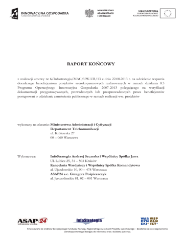 MINISTERSTWO ADMINISTRACJI I CYFRYZACJI RAPORT KOŃCOWY z realizacji umowy nr 6/Infostrategia/MAC/UW-UR/13 z dnia 22.08.2013 r. na udzielenie wsparcia doradczego beneficjentom projektów szerokopasmowych realizowanych w ramach działania 8.3 Programu Operacyjnego Innowacyjna Gospodarka 2007-2013 polegającego na weryfikacji dokumentacji przygotowywanych, prowadzonych lub przeprowadzonych przez beneficjentów postępowań o udzielenie zamówienia publicznego w ramach realizacji ww. projektów wykonany na zlecenie: Ministerstwa Administracji i Cyfryzacji Departament Telekomunikacji ul. Królewska 27 00 – 060 Warszawa Wykonawca: InfoStrategia Andrzej Szczerba i Wspólnicy Spółka Jawa Ul. Lubicz 25, 31 – 503 Kraków Kancelaria Wardyńscy i Wspólnicy Spółka Komandytowa al. Ujazdowskie 10, 00 – 478 Warszawa ASAP24 s.c. Grzegorz Pośpieszczyk al. Jerozolimskie 81, 02 – 001 Warszawa Finansowane ze środków Europejskiego Funduszu Rozwoju Regionalnego w ramach Projektu systemowego – działania na rzecz zapewnienia szerokopasmowego dostępu do Internetu oraz z budżetu państwa. MINISTERSTWO ADMINISTRACJI I CYFRYZACJI I. Część wstępna Raport opracowano na podstawie § 8 umowy nr 6/Infostrategia/MAC/UW-UR/13 z dnia 22.08.2013 r. na udzielenie wsparcia doradczego beneficjentom projektów szerokopasmowych realizowanych w ramach działania 8.3 Programu Operacyjnego Innowacyjna Gospodarka 2007-2013 polegającego na weryfikacji dokumentacji przygotowywanych, prowadzonych lub przeprowadzonych przez beneficjentów postępowań o udzielenie zamówienia publicznego w ramach realizacji ww. projektów. Weryfikację przeprowadzono w oparciu o ustawę z dnia 29 stycznia 2004 r. Prawo zamówień publicznych (t.j. Dz. U. z 2013 r., poz. 907 z późn. zm.), dalej ustawa pzp wraz z aktami wykonawczymi. Podstawą do określenia wysokości możliwej korekty finansowej stanowił dokument 4 „Wymierzanie korekt finansowych za naruszenia prawa zamówień publicznych związane z realizacją projektów współfinansowanych ze środków funduszy UE” w aktualnie obowiązującym brzmieniu. Umowę realizowano od dnia 22.08.2013 r. do 31.07.2014 r. W trakcie realizacji umowy wykonano 250 weryfikacji dokumentacji przetargowych, w tym 69 weryfikacji w trybie ex – ante. W 31 wypadkach przekazana przez beneficjentów dokumentacja wymagała uzupełnienia. Zestawienie wszystkich zleceń z podaniem przedmiotu, terminów oraz wartości zlecenia wskazano w tabeli poniżej: Nr zlecenia Godz. Zamawiający 1/2013/DT 12 Gmina Krosno Odrzańskie 2/2013/DT 12 Gmina Szelków 3/2013/DT 12 Gmina Kobylanka 4/2013/DT 8 Gmina Besko 5/2013/DT 8 Gmina Oborniki 6/2013/DT 7 Gmina Mielec 7/2013/DT 8 Gmina Osieczna 8/2013/DT 9 Gmina Słupia Przedmiot Dostawa sprzętu komputeroego, dostwa Internetu i przeprowadzenie szkoleń komputerowych w ramach projektu Internet w domu, Internet w szkolen - szansą na rozwój wykluczonych cyfrowo mieszkańców gminy Krosno Odrzańskie Przeciwdziałanie wykluczeniu cyfrowemu na terenie gminy Szelków Przeciwdziałanie wykluczeniu cyfrowemu - Internet dla mieszkańców Gminy Kobylanka Eliminacja wykluczenia cyfrowego w gminie Besko etap II) - prace instalacyjne, konfiguracyjne związane z podłączeniem Beneficjentów końcowych do infrastruktury sieciowej, zakup dostarczenie, instalacja sprzętu komputerowego, usługi dostępu do internetu Dostawa sprzętu komputerowego oraz oprogramowania Stworzenie infrastruktury i świadczenie usługi dostępu do Internetu dla 40 gospodarstw domowych, oraz stworzenie infrastruktury zapewniającej dostarczenie łącza internetowego do komputerów zainstalowanych w jednostkach podległych slokalizowanych na terenie Gminy Mielec w ramach zadania pn. Przez Internet do kariery w Gminie Mielec Dostawa sprzętu komputerowego wraz z usługą dostępu do Internetu w ramach przeciwdziałania wykluczeniu cyfrowemu w Gminie Osieczna Dostawa zestawów komputerowych i drukarek wraz 10 Data zlecenia 18-09-2013 10 18-09-2013 10 18-09-2013 10 18-09-2013 10 18-09-2013 10 18-09-2013 10 18-09-2013 10 18-09-2013 Termin Finansowane ze środków Europejskiego Funduszu Rozwoju Regionalnego w ramach Projektu systemowego – działania na rzecz zapewnienia szerokopasmowego dostępu do Internetu oraz z budżetu państwa. –2– MINISTERSTWO ADMINISTRACJI I CYFRYZACJI 9/2013/DT 10/2013/DT 11/2013/DT 13/2013/DT 14/2013/DT 15/2013/DT 16/2013/DT 17/2013/DT 18/2013/DT 19/2013/DT 20/2013/DT 21/2013/DT 22/2013/DT 23/2013/DT 24/2013/DT 25/2013/DT 26/2013/DT 27/2013/DT 28/2013/DT 29/2013/DT z ich ubezpieczeniem, modernizację i aktualizację oprogramowania oraz przeprowadzenie szkoleń 10 Gmina Podegrodzie Zakup zestawów komputerowych z drukarkami wraz z oprogramowaniem oraz świadczenie dostępu do Internetu dla 150 gospodarstw z terenu gminy Podegrodzie 8 Gmina Oborniki Zakup usługi dostępu do internetu 5 Gmina Lubin Ubezpieczenie komputerów zakupionych w ramach projektu pn. Przeciwdziałanie wykluczeniu cyfrowemu w gminie Lubin 10 Gmina Majdan Dostawa komputerów, budowa infrastruktury sieci Królewski internetowej oraz usługi w zakresie realizacji projektu: Przeciwdziałanie wykluczeniu cyfrowemu mieszkańców Gminy Majdan Królewski 12 Gmina Łagiewniki Budowa, instalacja i serwis infrastruktury szerokopasmowej sieci internetowej w ramach projektu: Zwalczanie wykluczenia cyfrowego w Gminie Łagiewniki 10 Gmina Kwidzyn Zakup sprzętu komputerowego 8 Gmina Kwidzyn Dostawa internetu, usługa konfiguracji sprzętu komputerowego i asysty technicznej 8 Gmina i Miasto Dostawa sygnału internetowego do siedziby Warta jednostek podległych Gminie oraz do gospodarstw domowych w ramach realizacji projektu Przeciwdziałanie wykluczeniu cyfrowemu - Internet dla mieszkańców Gminy i Miasta Warta 8 Gmina Białogard Dostawa sprzętu komputerowego wraz z oprogramowaniem 5 Gmina i Miasto Ubezpieczenie zestawów komputerowych Warta 12 Gmina Koszarawa Budowa dostępu do Internetu w gminie Koszarawa 7 G