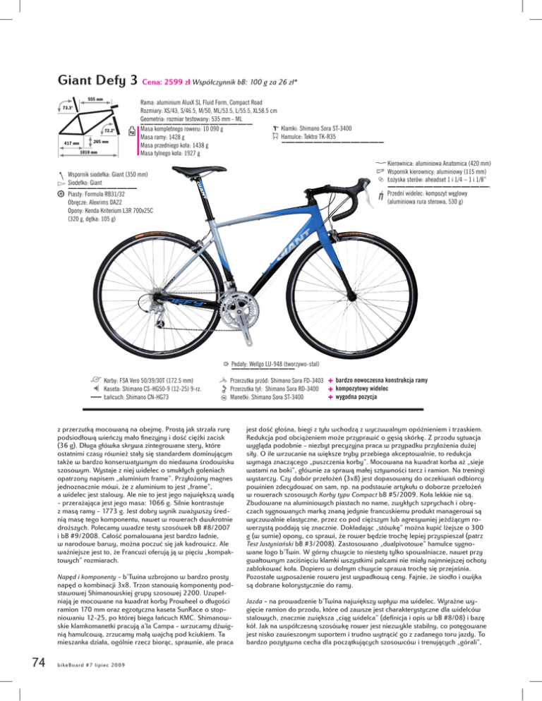 Giant Defy 3 Cena: 2599 zł Współczynnik bB: 100 g za 26 zł* 555 mm Rama: aluminium AluxX SL Fluid Form, Compact Road Rozmiary: XS/43, S/46.5, M/50, ML/53.5, L/55.5, XL58.5 cm Geometria: rozmiar testowany: 535 mm - ML 73.3° 72.2° 417 mm 265 mm 1010 mm Klamki: Shimano Sora ST-3400 Hamulce: Tektro TK-R35 Masa kompletnego roweru: 10 090 g Masa ramy: 1428 g Masa przedniego koła: 1438 g Masa tylnego koła: 1927 g Kierownica: aluminiowa Anatomica (420 mm) Wspornik kierownicy: aluminiowy (115 mm) Łożyska sterów: aheadset 1 i 1/4 – 1 i 1/8” Wspornik siodełka: Giant (350 mm) Siodełko: Giant Przedni widelec: kompozyt węglowy (aluminiowa rura sterowa, 530 g) Piasty: Formula RB31/32 Obręcze: Alexrims DA22 Opony: Kenda Kriterium L3R 700x25C (320 g, dętka: 105 g) Pedały: Wellgo LU-948 (tworzywo-stal) Korby: FSA Vero 50/39/30T (172.5 mm) Kaseta: Shimano CS-HG50-9 (12-25) 9-rz. Łańcuch: Shimano CN-HG73 Przerzutka przód: Shimano Sora FD-3403 Przerzutka tył: Shimano Sora RD-3400 Manetki: Shimano Sora ST-3400 z przerzutką mocowaną na obejmę. Prostą jak strzała rurę podsiodłową wieńczy mało finezyjny i dość ciężki zacisk (36 g). Długa główka skrywa zintegrowane stery, które ostatnimi czasy również stały się standardem dominującym także w bardzo konserwatywnym do niedawna środowisku szosowym. Wystaje z niej widelec o smukłych goleniach opatrzony napisem „aluminium frame”. Przyłożony magnes jednoznacznie mówi, że z aluminium to jest „frame”, a widelec jest stalowy. Ale nie to jest jego największą wadą - przerażająca jest jego masa: 1066 g. Silnie kontrastuje z masą ramy - 1773 g. Jest dobry wynik zważywszy średnią masę tego komponentu, nawet w rowerach dwukrotnie droższych. Polecamy uwadze testy szosówek bB #8/2007 i bB #9/2008. Całość pomalowana jest bardzo ładnie, w narodowe barwy, można poczuć się jak kadrowicz. Ale ważniejsze jest to, że Francuzi oferują ją w pięciu „kompaktowych” rozmiarach. Napęd i komponenty - b’Twina uzbrojono w bardzo prosty napęd o kombinacji 3x8. Trzon stanowią komponenty podstawowej Shimanowskiej grupy szosowej 2200. Uzupełniają je mocowane na kwadrat korby Prowheel o długości ramion 170 mm oraz egzotyczna kaseta SunRace o stopniowaniu 12-25, po której biega łańcuch KMC. Shimanowskie klamkomanetki pracują a’la Campa - wrzucamy dźwignią hamulcową, zrzucamy małą wajchą pod kciukiem. Ta mieszanka działa, ogólnie rzecz biorąc, sprawnie, ale praca 74 bi ke Bo ar d # 7 l i pi e c 2009 bardzo nowoczesna konstrukcja ramy kompozytowy widelec wygodna pozycja jest dość głośna, biegi z tyłu wchodzą z wyczuwalnym opóźnieniem i trzaskiem. Redukcja pod obciążeniem może przyprawić o gęsią skórkę. Z przodu sytuacja wygląda podobnie - niezbyt precyzyjna praca w przypadku przyłożenia dużej siły. O ile wrzucanie na większe tryby przebiega akceptowalnie, to redukcja wymaga znaczącego „puszczenia korby”. Mocowana na kwadrat korba aż „sieje watami na boki”, głównie za sprawą małej sztywności tarcz i ramion. Na treningi wystarczy. Czy dobór przełożeń (3x8) jest dopasowany do oczekiwań odbiorcy powinien zdecydować on sam, np. na podstawie artykułu o doborze przełożeń w rowerach szosowych Korby typu Compact bB #5/2009. Koła lekkie nie są. Zbudowane na aluminiowych piastach no name, zwykłych szprychach i obręczach sygnowanych marką znaną jedynie francuskiemu produkt managerowi są wyczuwalnie elastyczne, przez co pod cięższym lub agresywniej jeżdżącym rowerzystą poddają się znacznie. Dokładając „stówkę” można kupić lżejsze o 300 g (w sumie) opony, co sprawi, że rower będzie trochę lepiej przyspieszał (patrz Test Justyniański bB #3/2008). Zastosowano „dualpivotowe” hamulce sygnowane logo b’Twin. W górny chwycie to niestety tylko spowalniacze, nawet przy gwałtownym zaciśnięciu klamki wszystkimi palcami nie miały najmniejszej ochoty zablokować koła. Dopiero w dolnym chwycie sprawa trochę się przejaśnia. Pozostałe wyposażenie roweru jest wypadkową ceny. Fajnie, że siodło i owijka są dobrane kolorystycznie do ramy. Jazda - na prowadzenie b’Twina największy wpływ ma widelec. Wyraźne wygięcie ramion do przodu, które od zawsze jest charakterystyczne dla widelców stalowych, znacznie zwiększa „ciąg widelca” (definicja i opis w bB #8/08) i bazę kół. Jak na współczesną szosówkę rower jest niezwykle stabilny, co potęgowane jest nisko zawieszonym suportem i trudno wytrącić go z zadanego toru jazdy. To bardzo pozytywna cecha dla początkujących szosowców i trenujących „górali”,