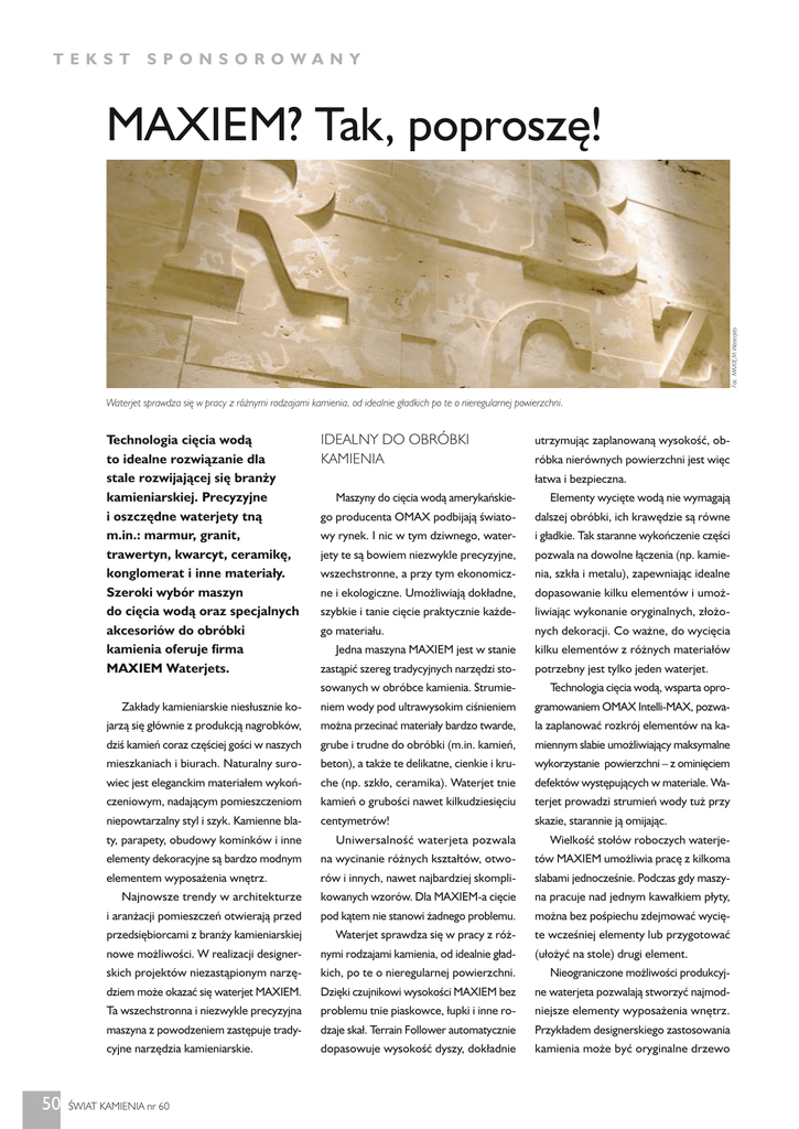T E KST SP O N S O R O WA NY Fot. MAXIEM Waterjets MAXIEM? Tak, poproszę! Waterjet sprawdza się w pracy z różnymi rodzajami kamienia, od idealnie gładkich po te o nieregularnej powierzchni. Technologia cięcia wodą to idealne rozwiązanie dla stale rozwijającej się branży kamieniarskiej. Precyzyjne i oszczędne waterjety tną m.in.: marmur, granit, trawertyn, kwarcyt, ceramikę, konglomerat i inne materiały. Szeroki wybór maszyn do cięcia wodą oraz specjalnych akcesoriów do obróbki kamienia oferuje firma MAXIEM Waterjets. 50 Idealny do obróbki kamienia utrzymując zaplanowaną wysokość, obróbka nierównych powierzchni jest więc łatwa i bezpieczna. Maszyny do cięcia wodą amerykańskie- Elementy wycięte wodą nie wymagają go producenta OMAX podbijają świato- dalszej obróbki, ich krawędzie są równe wy rynek. I nic w tym dziwnego, water- i gładkie. Tak staranne wykończenie części jety te są bowiem niezwykle precyzyjne, pozwala na dowolne łączenia (np. kamie- wszechstronne, a przy tym ekonomicz- nia, szkła i metalu), zapewniając idealne ne i ekologiczne. Umożliwiają dokładne, dopasowanie kilku elementów i umoż- szybkie i tanie cięcie praktycznie każde- liwiając wykonanie oryginalnych, złożo- go materiału. nych dekoracji. Co ważne, do wycięcia Jedna maszyna MAXIEM jest w stanie zastąpić szereg tradycyjnych narzędzi sto- kilku elementów z różnych materiałów potrzebny jest tylko jeden waterjet. sowanych w obróbce kamienia. Strumie- Technologia cięcia wodą, wsparta opro- Zakłady kamieniarskie niesłusznie ko- niem wody pod ultrawysokim ciśnieniem gramowaniem OMAX Intelli-MAX, pozwa- jarzą się głównie z produkcją nagrobków, można przecinać materiały bardzo twarde, la zaplanować rozkrój elementów na ka- dziś kamień coraz częściej gości w naszych grube i trudne do obróbki (m.in. kamień, miennym slabie umożliwiający maksymalne mieszkaniach i biurach. Naturalny suro- beton), a także te delikatne, cienkie i kru- wykorzystanie powierzchni – z ominięciem wiec jest eleganckim materiałem wykoń- che (np. szkło, ceramika). Waterjet tnie defektów występujących w materiale. Wa- czeniowym, nadającym pomieszczeniom kamień o grubości nawet kilkudziesięciu terjet prowadzi strumień wody tuż przy niepowtarzalny styl i szyk. Kamienne bla- centymetrów! skazie, starannie ją omijając. ty, parapety, obudowy kominków i inne Uniwersalność waterjeta pozwala Wielkość stołów roboczych waterje- elementy dekoracyjne są bardzo modnym na wycinanie różnych kształtów, otwo- tów MAXIEM umożliwia pracę z kilkoma elementem wyposażenia wnętrz. rów i innych, nawet najbardziej skompli- slabami jednocześnie. Podczas gdy maszy- Najnowsze trendy w architekturze kowanych wzorów. Dla MAXIEM-a cięcie na pracuje nad jednym kawałkiem płyty, i aranżacji pomieszczeń otwierają przed pod kątem nie stanowi żadnego problemu. można bez pośpiechu zdejmować wycię- przedsiębiorcami z branży kamieniarskiej Waterjet sprawdza się w pracy z róż- te wcześniej elementy lub przygotować nowe możliwości. W realizacji designer- nymi rodzajami kamienia, od idealnie gład- skich projektów niezastąpionym narzę- kich, po te o nieregularnej powierzchni. Nieograniczone możliwości produkcyj- dziem może okazać się waterjet MAXIEM. Dzięki czujnikowi wysokości MAXIEM bez ne waterjeta pozwalają stworzyć najmod- Ta wszechstronna i niezwykle precyzyjna problemu tnie piaskowce, łupki i inne ro- niejsze elementy wyposażenia wnętrz. maszyna z powodzeniem zastępuje trady- dzaje skał. Terrain Follower automatycznie Przykładem designerskiego zastosowania cyjne narzędzia kamieniarskie. dopasowuje wysokość dyszy, dokładnie kamienia może być oryginalne drzewo ŚWIAT KAMIENIA nr 60 (ułożyć na stole) drugi element. genealogiczne. Inicjały członków rodziny stalujemy potężną maszynę w wojewódz- teraz przygotowaliśmy specjalną, jesienną zostały wycięte z trawertynu i wkompo- twie mazowieckim. To fakt! ofertę – informuje Tomasz Łapiński. nowane w ścianę z tego samego kamienia. Olbrzym jest już w drodze do Polski. MAXIEM dostosowany do pracy z ka- MAXIEM Waterjets to marka należąca Maszyna liczy ponad 10 metrów długo- mieniem (wyposażony m.in. w zestaw do OMAX Corp., najlepszego na świe- ści (tyle co 4 kondygnacje budynku!), 3 wspomagający przebijanie materiałów cie dostawcy kompletnych rozwiązań dla metry szerokości i 4 metry wysokości. kruchych, uchwyt mocujący materiał technologii cięcia wodą. OMAX jako je- Sam MAXIEM 2080 waży prawie 6 ton. na stole i nastawnicę kątową umożliwia- dyna firma na świecie świadczy w Polsce Wanna waterjeta pomieści blisko 16 ty- jącą pochylenie głowicy do 45 stopni) – szeroki zakres usług serwisowych – gwa- sięcy litrów wody, to dodatkowe 16 ton. tylko teraz w specjalnej cenie! rancyjnych i pogwarancyjnych. MAXIEM Zakres obróbczy tego modelu to 8 O zaletach maszyn do cięcia wodą Waterjets w swojej ofercie posiada sze- metrów. Na stole można więc układać można pisać w nieskończoność. Dlatego, roką gamę maszyn oraz ogromny wybór naprawdę duże gabaryty lub – nie zatrzy- by nie być gołosłownym, MAXIEM Wa- specjalnych akcesoriów. mując maszyny – pracować na kilku ele- terjets chętnie prezentuje swoje maszyny mentach jednocześnie. w akcji. O tym, jak pracuje waterjet, warto – Każdego klienta traktujemy indywidualnie. Poznajemy potrzeby przedsię- W MAXIEM-ie 2080 zastosowano przed zakupem przekonać się w naszym biorcy i proponujemy odpowiedni model nowy, nożycowy system wysokociśnie- Laboratorium Cięcia w Elblągu. Możliwości waterjeta z konkretnym wyposażeniem, niowy. Ten innowacyjny system podawa- maszyn do cięcia wodą MAXIEM można dającym jak największe korzyści. Naszym nia wody pod ultrawysokim ciśnieniem testować podczas październikowych tar- celem jest dopasowanie maszyny tak, by pracu