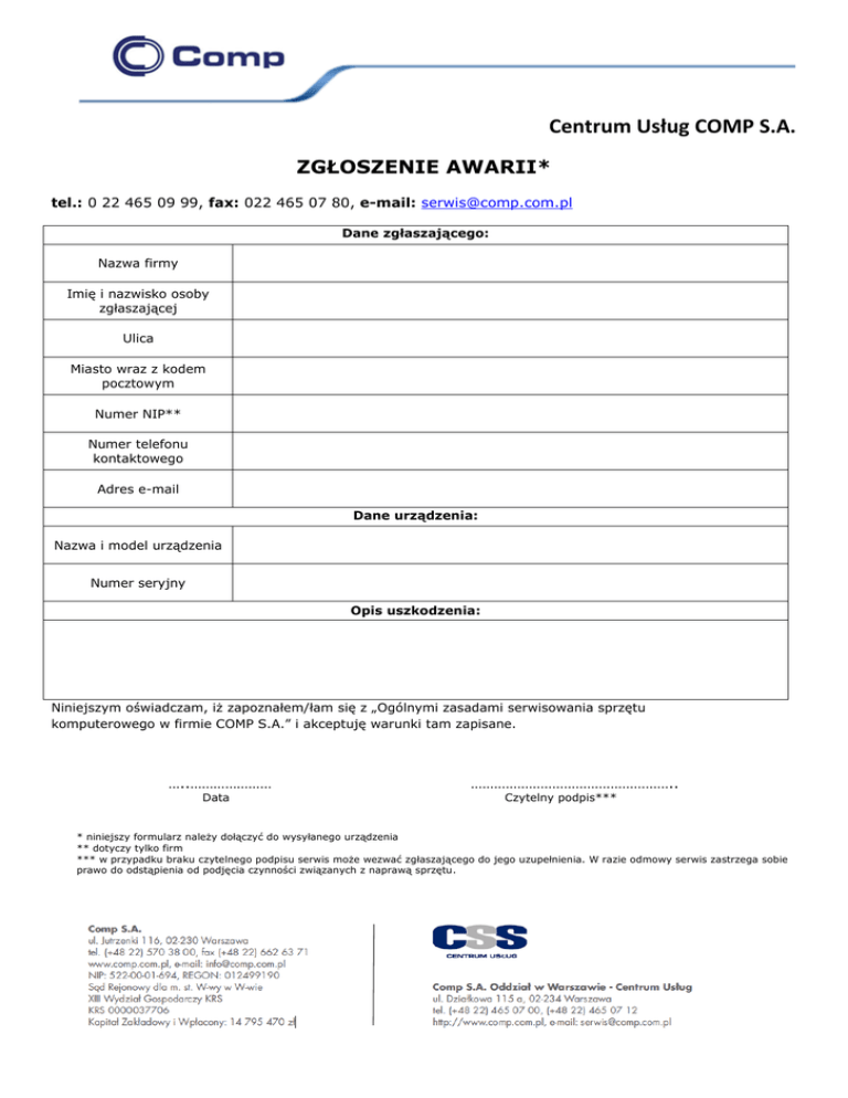 Centrum Usług COMP S.A. ZGŁOSZENIE AWARII* tel.: 0 22 465 09 99, fax: 022 465 07 80, e-mail: [email protected] Dane zgłaszającego: Nazwa firmy Imię i nazwisko osoby zgłaszającej Ulica Miasto wraz z kodem pocztowym Numer NIP** Numer telefonu kontaktowego Adres e-mail Dane urządzenia: Nazwa i model urządzenia Numer seryjny Opis uszkodzenia: Niniejszym oświadczam, iż zapoznałem/łam się z „Ogólnymi zasadami serwisowania sprzętu komputerowego w firmie COMP S.A.” i akceptuję warunki tam zapisane. …..………………… Data …………………………………………….. Czytelny podpis*** * niniejszy formularz należy dołączyć do wysyłanego urządzenia ** dotyczy tylko firm *** w przypadku braku czytelnego podpisu serwis może wezwać zgłaszającego do jego uzupełnienia. W razie odmowy serwis zastrzega sobie prawo do odstąpienia od podjęcia czynności związanych z naprawą sprzętu. Centrum Usług COMP S.A. Ogólne zasady serwisowania sprzętu komputerowego w firmie COMP S.A. 1.COMP S.A. nie ponosi odpowiedzialności za dane na dyskach twardych i innych nośnikach przekazanych ze sprzętem do naprawy. COMP nie jest zobowiązany do utworzenia kopii ani do odtworzenia oryginalnej zawartości dysku po naprawie. 2. COMP S.A. nie ponosi odpowiedzialności za szkody w sprzęcie powstałe w jego transporcie do siedziby Serwisu. Celem uniknięcia szkód Klient zobowiązany jest do odpowiedniego zapakowania przesyłanego do naprawy sprzętu w sposób należycie zabezpieczający sprzęt przed przypadkowymi szkodami w transporcie. W przypadku nieprawidłowego zapakowania COMP może obciążyć Klienta dodatkowymi kosztami w kwocie 25zł niezbędnymi do odpowiedniego opakowania sprzętu przed jego wysyłką do Klienta po usunięciu podanej przez Klienta usterki. W odbioru naprawionego sprzętu za pośrednictwem firmy przewozowej, Klient jest zobowiązany zbadać stan przesyłki niezwłocznie przy odbiorze, w obecności Kuriera i sporządzić protokół reklamacji. 3.Sprzęt zostanie zdiagnozowany tylko pod kątem usterki podanej przez Klienta. 4.Testowanie i wycena sprzętu są płatne. Koszt testowania wynosi: notebooki, PDA, PC drukarki, monitory serwery pozostały sprzęt - 100 pln netto 100 pln netto 160 pln netto 100 pln netto Koszt wyceny naprawy wynosi: notebooki, PDA, PC drukarki, monitory serwery pozostały sprzęt - 160 pln netto 100 pln netto 260 pln netto 100 pln netto Koszty testowania naliczane są w przypadku, gdy: zgłoszony do naprawy sprzęt okaże się sprawny (również w przypadku napraw gwarancyjnych), usterka wynika z wad oprogramowania, a nie sprzętu (również w przypadku napraw gwarancyjnych), klient zrezygnuje z naprawy, bez wyceny naprawy następuje zmiana kwalifikacji naprawy z gwarancyjnej na płatną, stwierdzenia uszkodzeń mechanicznych, bez wyceny naprawy stwierdzenia nieautoryzowanej ingerencji w sprzęt uszkodzeń powstałych w wyniku stosowania regenerowanych tuszy stwierdzenia nieprawidłowości działania sprzętu w wyniku używania nieoryginalnych części 5.Ekspertyza w zakresie wyceny kosztów naprawy, ważna jest 14 dni kalendarzowych od daty jej wykonania. 6.Pierwsza płatność pobierana jest gotówką (w przypadku wysyłek opcja „za pobraniem) lub kartą płatniczą. 7.Użytkownik, podając dane osobowe, oświadcza, że: są one zgodne z prawdą, zgodnie z art. 23 ust. 1 pkt 1 ustawy o ochronie danych osobowych, wyraża zgodę na przetwarzanie danych osobowych przez COMP S.A. w celu promocji (marketingu) produktów i firm, zgodnie z art. 23 ust. 1 pkt 1 ustawy o ochronie danych osobowych, wyraża zgodę na przetwarzanie danych osobowych przez producentów sprzętu do celów związanych z naprawą gwarancyjną sprzętu będącego w posiadaniu użytkownika. 8.Klient zobowiązany jest do odbioru sprzętu nie później niż w terminie 14 dni od daty pierwszego wezwania do odbioru. W przypadku nie odebrania sprzętu w terminie 14 dni od daty pierwszego wezwania do odbioru, strony ustalają karę umowną w wysokości 25 pln za każdy dzień zwłoki, a po 60 dniach zwłoki COMP S.A. ma prawo do sprzedaży sprzętu w imieniu Klienta za cenę ustaloną przez COMP S.A. z prawem zaliczenia jej na poczet kar umownych. 9.Podane kwoty są cenami netto i nie zawierają podatku VAT 10.COMP S.A. udziela 3-miesięcznej gwarancji na wykonaną usługę naprawy w przypadku urządzeń nie objętych gwarancją producenta licząc od daty zakończenia naprawy. Wymienione części posiadają gwarancję producenta. 11.Wymienione na gwarancji, uszkodzone części zamienne pozostają własnością producenta. 12.W przypadku napraw płatnych COMP S.A. zastrzega sobie możliwość odstąpienia od wykonania usługi, jednocześnie deklarując, że korzystać będzie z odstąpienia w szczególności w przypadku niedostępności części zamiennych. 13.Klient składa niniejszym następujące oświadczenie: „Niniejszym wyrażam zgodę na przetwarzanie swoich danych osobowych przez firmę COMP S.A. z siedzibą w Warszawie przy ul. Jutrzenki 116 do celów związanych z wystawieniem faktury, realizacją naprawy gwarancyjnej, przekazywaniem informacji handlowych oraz podejmowaniem działań marketingowych w formach prawem dozwolonych, zgodnie z Ustawą z dnia 29.08.1997 o ochronie danych osobowych (DZ.U. nr 133/97, poz. 883) oraz Ustawa z dnia 18.07.2002 o świadczeniu usług drogą elektroniczną (Dz. U. Nr 144). Przysługuje mi prawo do poprawiania moich danych osobowych.” …….…..………… Data ………..…………………………. Czytelny podpis Zalecenia przed wysłaniem sprzętu do serwisu: Zabezpieczyć dane zawarte na dyskach twardych i innych nośnikach. Sprawdzić czy ewentualne nieprawidłowości z działaniem komputera nie są spowodowane wirusem. Sprawdzić czy akumulatory są naładowane i czy komputer jest właściwie podłączony do sieci. Odtworzyć oryginalną konfigurację sprzętową poprzez re-instalację oprogramowani