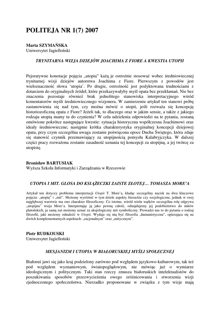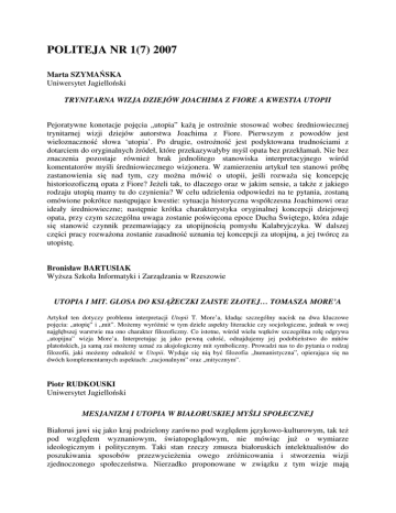 POLITEJA NR 1(7) 2007 Marta SZYMAŃSKA Uniwersytet Jagielloński TRYNITARNA WIZJA DZIEJÓW JOACHIMA Z FIORE A KWESTIA UTOPII Pejoratywne konotacje pojęcia „utopia” każą je ostrożnie stosować wobec średniowiecznej trynitarnej wizji dziejów autorstwa Joachima z Fiore. Pierwszym z powodów jest wieloznaczność słowa ‘utopia’. Po drugie, ostrożność jest podyktowana trudnościami z dotarciem do oryginalnych źródeł, które przekazywałyby myśl opata bez przekłamań. Nie bez znaczenia pozostaje również brak jednolitego stanowiska interpretacyjnego wśród komentatorów myśli średniowiecznego wizjonera. W zamierzeniu artykuł ten stanowi próbę zastanowienia się nad tym, czy można mówić o utopii, jeśli rozważa się koncepcję historiozoficzną opata z Fiore? Jeżeli tak, to dlaczego oraz w jakim sensie, a także z jakiego rodzaju utopią mamy tu do czynienia? W celu udzielenia odpowiedzi na te pytania, zostaną omówione pokrótce następujące kwestie: sytuacja historyczna współczesna Joachimowi oraz ideały średniowieczne; następnie krótka charakterystyka oryginalnej koncepcji dziejowej opata, przy czym szczególna uwaga zostanie poświęcona epoce Ducha Świętego, która zdaje się stanowić czynnik przemawiający za utopijnością pomysłu Kalabryjczyka. W dalszej części pracy rozważona zostanie zasadność uznania tej koncepcji za utopijną, a jej twórcę za utopistę. Bronisław BARTUSIAK Wyższa Szkoła Informatyki i Zarządzania w Rzeszowie UTOPIA I MIT. GLOSA DO KSIĄŻECZKI ZAISTE ZŁOTEJ… TOMASZA MORE’A Artykuł ten dotyczy problemu interpretacji Utopii T. More’a, kładąc szczególny nacisk na dwa kluczowe pojęcia: „utopię” i „mit”. Możemy wyróżnić w tym dziele aspekty literackie czy socjologiczne, jednak w swej najgłębszej warstwie ma ono charakter filozoficzny. Co istotne, wśród wielu wątków szczególna rolę odgrywa „utopijna” wizja More’a. Interpretując ją jako pewną całość, odnajdujemy jej podobieństwo do mitów platońskich, ja samą zaś możemy uznać za aksjologiczny mit symboliczny. Prowadzi nas to do pytania o rodzaj filozofii, jaki możemy odnaleźć w Utopii. Wydaje się nią być filozofia „humanistyczna”, opierająca się na dwóch komplementarnych aspektach: „racjonalnym” oraz „mitycznym”. Piotr RUDKOUSKI Uniwersytet Jagielloński MESJANIZM I UTOPIA W BIAŁORUSKIEJ MYŚLI SPOŁECZNEJ Białoruś jawi się jako kraj podzielony zarówno pod względem językowo-kulturowym, tak też pod względem wyznaniowym, światopoglądowym, nie mówiąc już o wymiarze ideologicznym i politycznym. Taki stan rzeczy zmusza białoruskich intelektualistów do poszukiwania sposobów przezwycieżenia owego zróżnicowania i stworzenia wizji zjednoczonego społeczeństwa. Nierzadko proponowane w związku z tym wizje mają charakter utopijny i mesjanistyczny. W niniejszym artykule są przedstawione i przeanalizowane trzy koncepcje społeczne, które zostały przez autora uznane za egzemplifikacje trzech typów utopijno-mesjanistycznej myśli na Białorusi. Pierwsza koncepcja to ekologizm, reprezentowany przez Časłava Kirviela, profesora na uniwersytecie państwowym w Horadni (Grodno), druga koncepcja – utopia nacjonalistyczna Zianona Paźniaka, założyciela Białoruskiego Frontu Narodowego, najmocniejszego ruchu o charakterze antysowieckim, działającym pod koniec lat 80-ych, trzecia zaś – białoruska ideologia państwowa. Każda z tych koncepcji jest egzemplifikacją różnych rodzajów utopii: ekologizm to typ futurystycznej utopii, nacjonalizm paźniakowski jest typem retro-utopii, a białoruska państwowa ideologia może być potraktowana jako szczególny rodzaj utopii – utopia teraźniejszości. Wszystkie te trzy wizje jawią się jako „projekty terapeutyczne”, jako że pretendują do tego, by wskazać jedyny możliwy sposób do uzdrowienia i zintegrawania społeczeństwa białoruskiego. Co oznacza obecność tego typu koncepcji w białoruskiej noosferze w perspektywie budowania społeczeństwa obywatelskiego i państwa demokratycznego? To pytanie jest dominantą refleksji, podejmowanych w niniejszym artykule. Marta KUNECKA Uniwersytet Jagielloński WĄTKI MILLENARYSTYCZNE I MESJANISTYCZNE W KONCEPCJI FRANCISA FUKUYAMY Rozważania zawarte w poniższym artykule są próbą nadania nowej interpretacji tezom głoszonym przez cenionego analityka polityki Francisa Fukuyamy. Ramy pojęciowe dla poniższej interpretacji stanowią pojęcia mesjanizmu i millenaryzmu, dzięki którym rozważania Fukuyamy nabierają nowych znaczeń a być może nawet stanowią podstawę do głębszego zrozumienia myśli autora Końca historii. Poruszane wątki dotyczą nie tylko samej historii, ale przede wszystkim teraźniejszości tj. rzeczywistości demokracji liberalnej i wyzwań, przed jakimi ona stoi, w połączeniu z analizą sytuacji geopolitycznej świata pod hegemonią Stanów Zjednoczonych. Jakub STĘPIEŃ Uniwersytet Jagielloński UTOPIA MANU – WSPÓŁCZESNY POWRÓT DO MITYCZNEJ PRZESZŁOŚCI Obserwując sferę indyjskiego dyskursu społeczno-politycznego można zauważyć, iż co jakiś czas pojawia się w niej odwołanie do mitycznego indyjskiego prawodawcy – Manu Powołując się na Manu, a właściwie na kodeks praw mu przypisywanych, część aktorów indyjskiej sceny politycznej i społecznej wskazuje na legendarną epokę doskonałych praw i harmonijnego społeczeństwa. Jest to epoka ładu społecznego i indywidualnego, a sam Manu postrzegany jest jako praojciec ludzkości. Celem artykułu jest analiza jednego z najważniejszych kodeksów społeczno-religijnych hinduizmu, na jaki składają się prawa Manu się jako podstawa ich doktryny politycznej. Powstaje jednak pytanie, podejmowane w artykule, jak wykorzystywany jest kodeks Manu we współczesnej debacie polityczno- społecznej, czym, w gruncie rzeczy, jest dla części mieszkańców Indii kodeks Manu? Jakie społeczeństwo ja